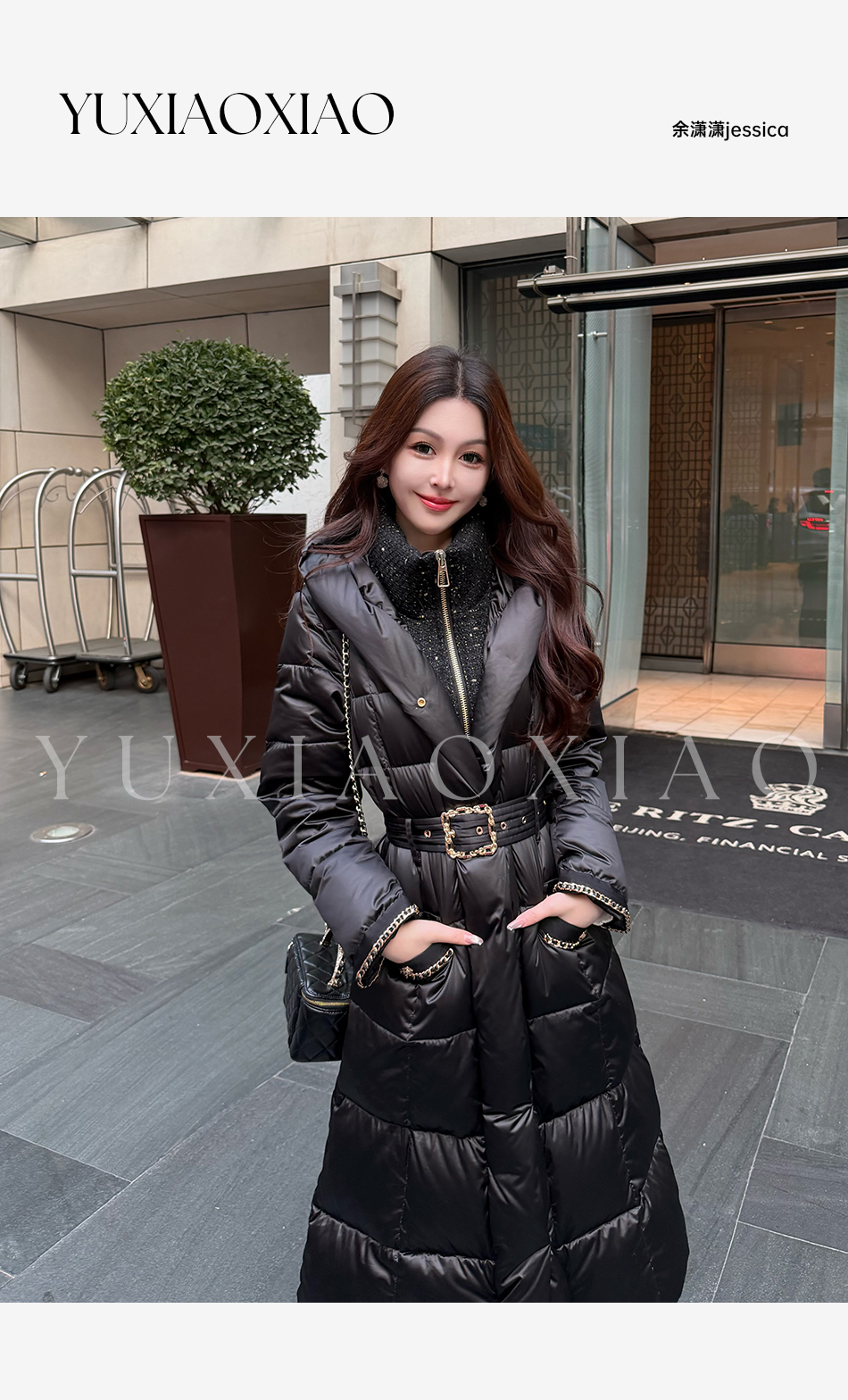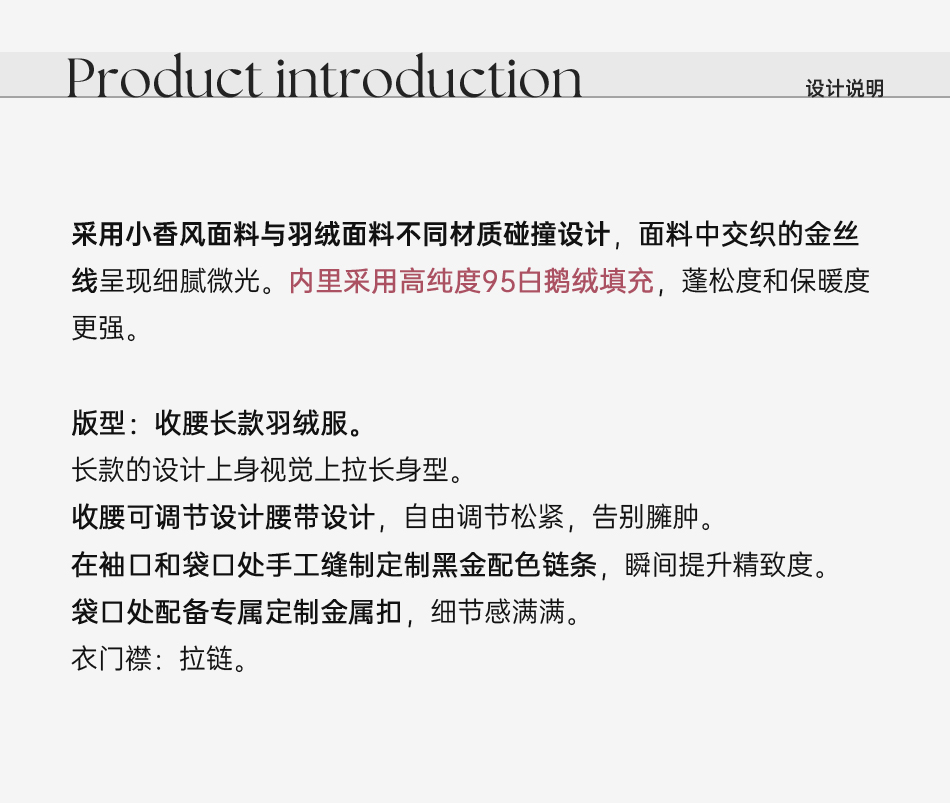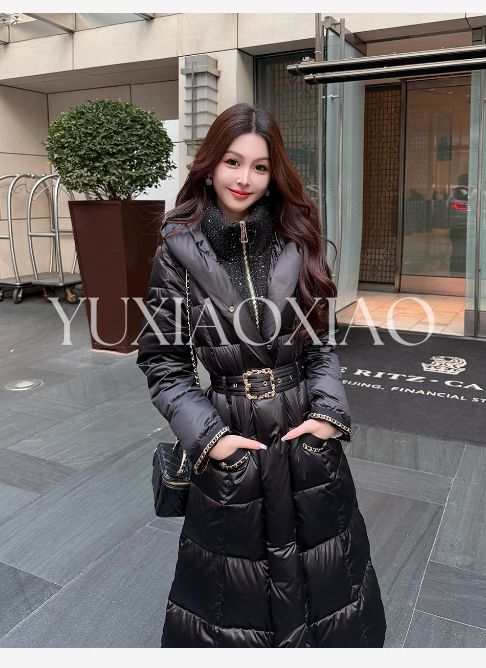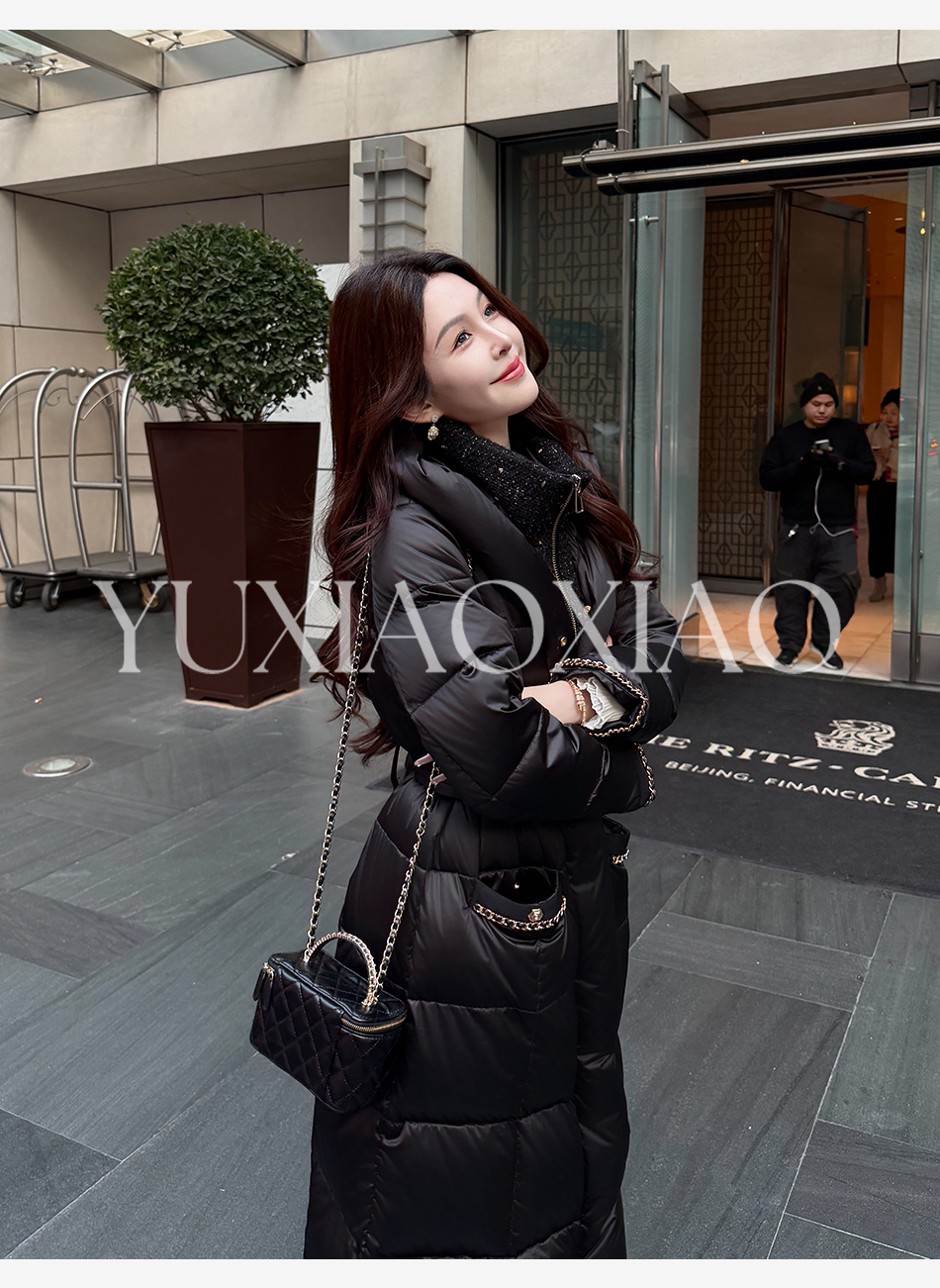 余潇潇【黑金女神】高纯度95白鹅绒小香风立领防风保暖长款羽绒服