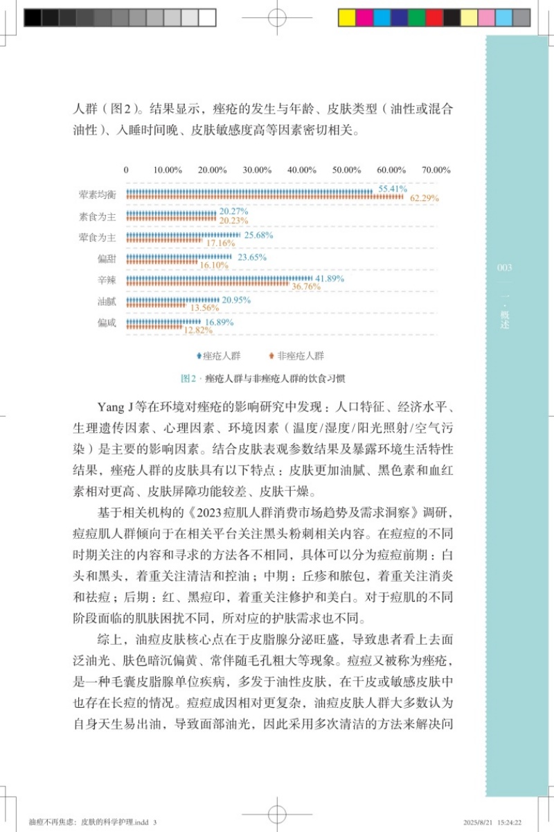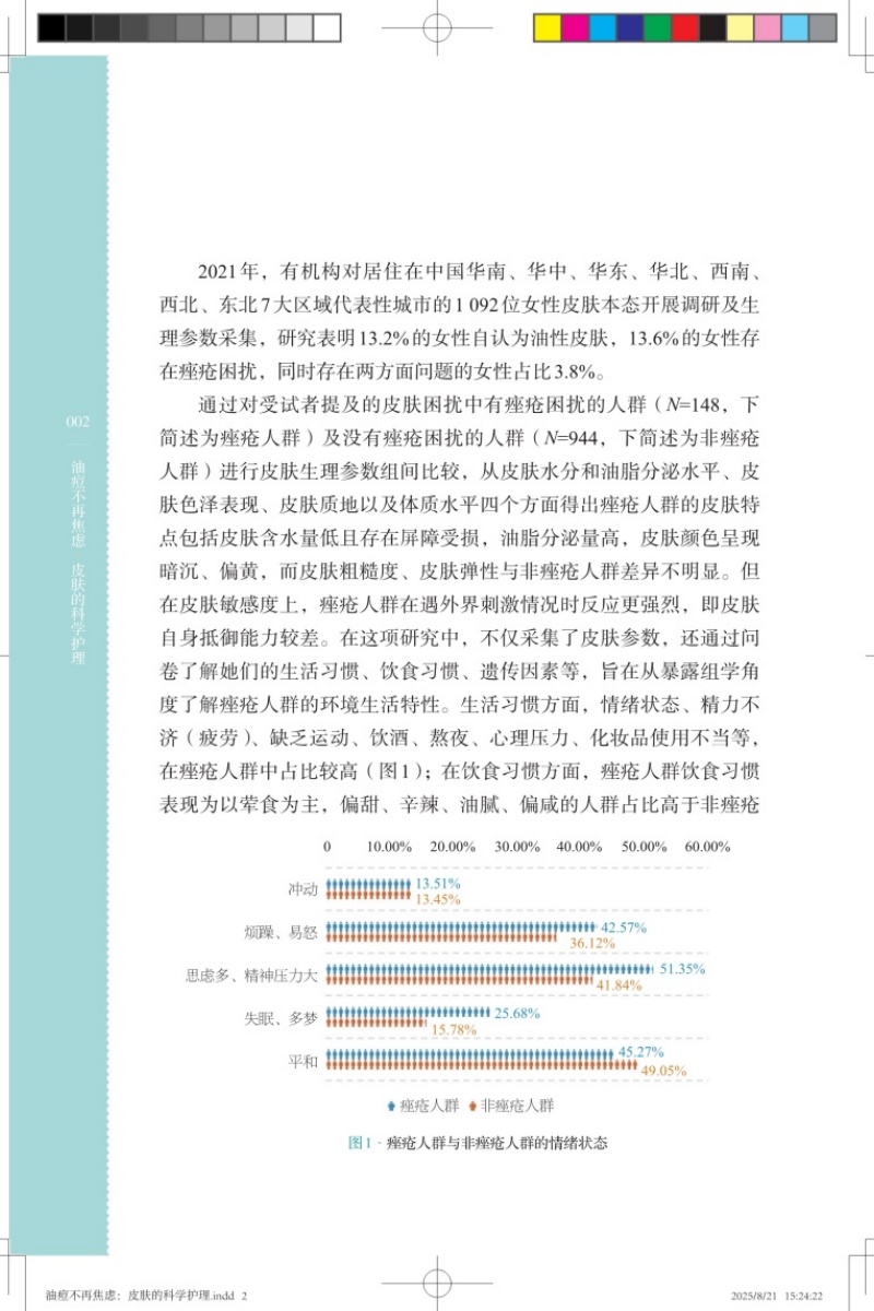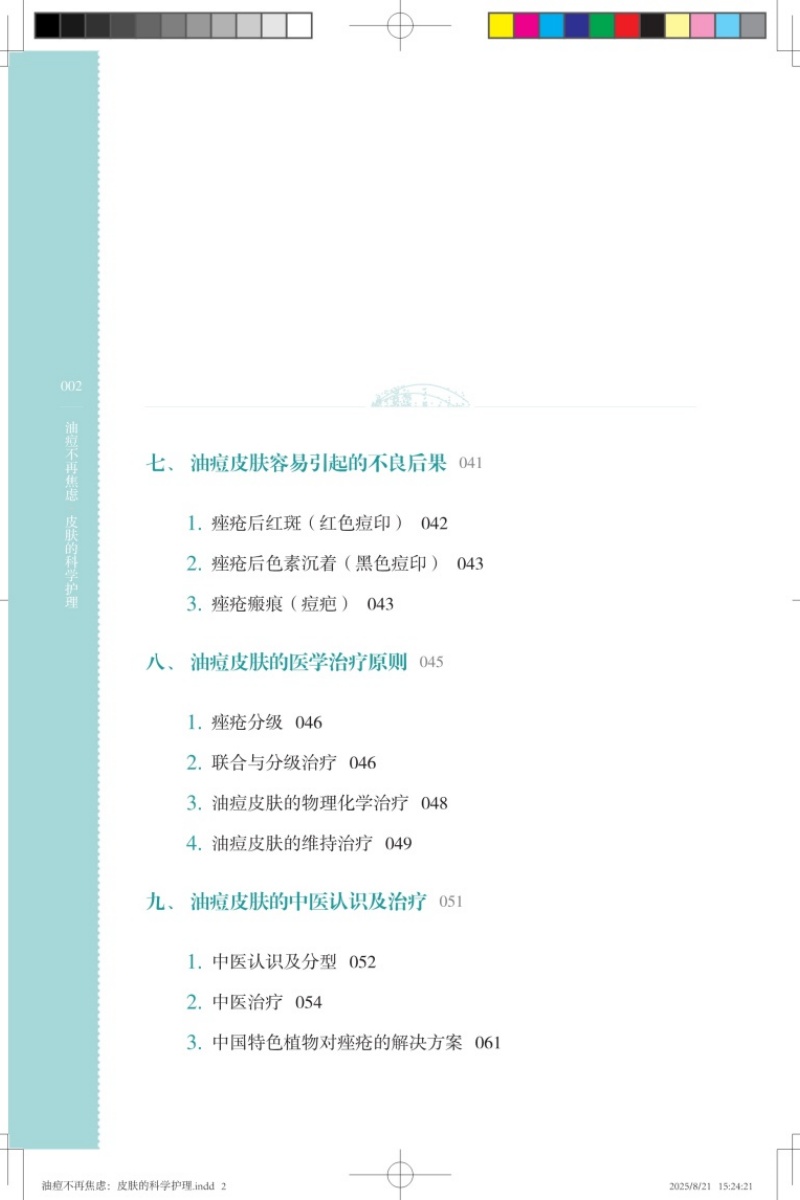 油痘皮肤是临床上常见的面部皮脂分泌过多与痤疮并存的一种疾病现象,给患者身心健康带来很大困扰。油痘皮肤存在症状复杂、护理困难、反复发作的情况,患者希望不仅解决出油、粉刺、丘疹、结节、脓疱、囊肿等问题,还渴望解决毛孔粗大、痤疮后遗留红色与黑色痘印等问题。本书聚焦油痘皮肤的科学护理,系统阐述油痘皮肤的专业认识,包括油痘的发生机制、病理特点、临床表现、影响因素,并给出了专业的解决方案、护理建议及护肤品选择指导等。 本书可帮助读者了解油痘皮肤的基本特点,建立正确的皮肤护理观念,从而是读者对油痘皮肤能有正确认知,纠正盲目跟风护肤的错误认识,为改善油痘皮肤状态提供科学指导。