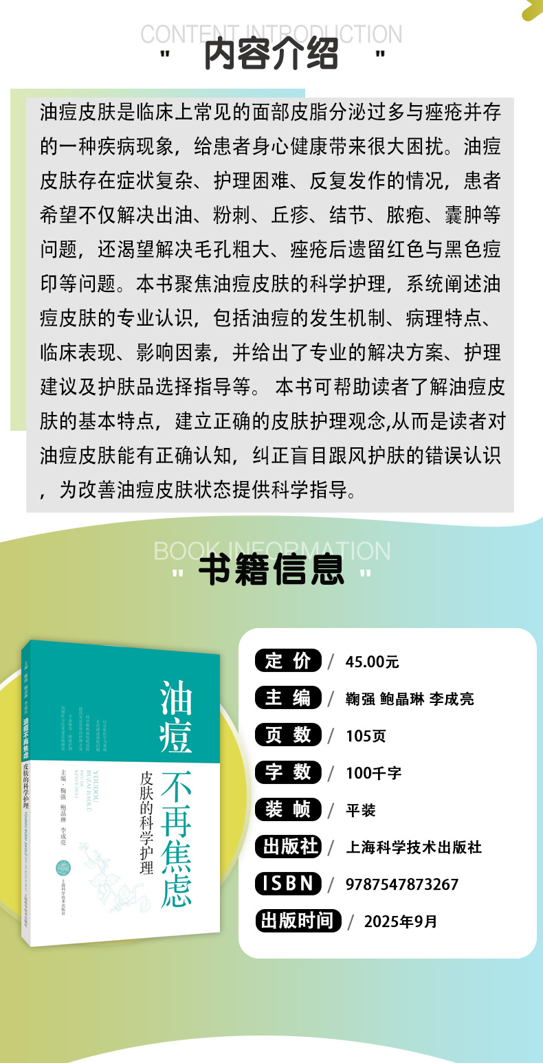 油痘不再焦虑:皮肤的科学护理 鞠强 鲍晶琳 李成亮 本书聚焦油痘皮肤的科学护理 系统阐述油痘皮肤的专业认识 上海科学技术出版社