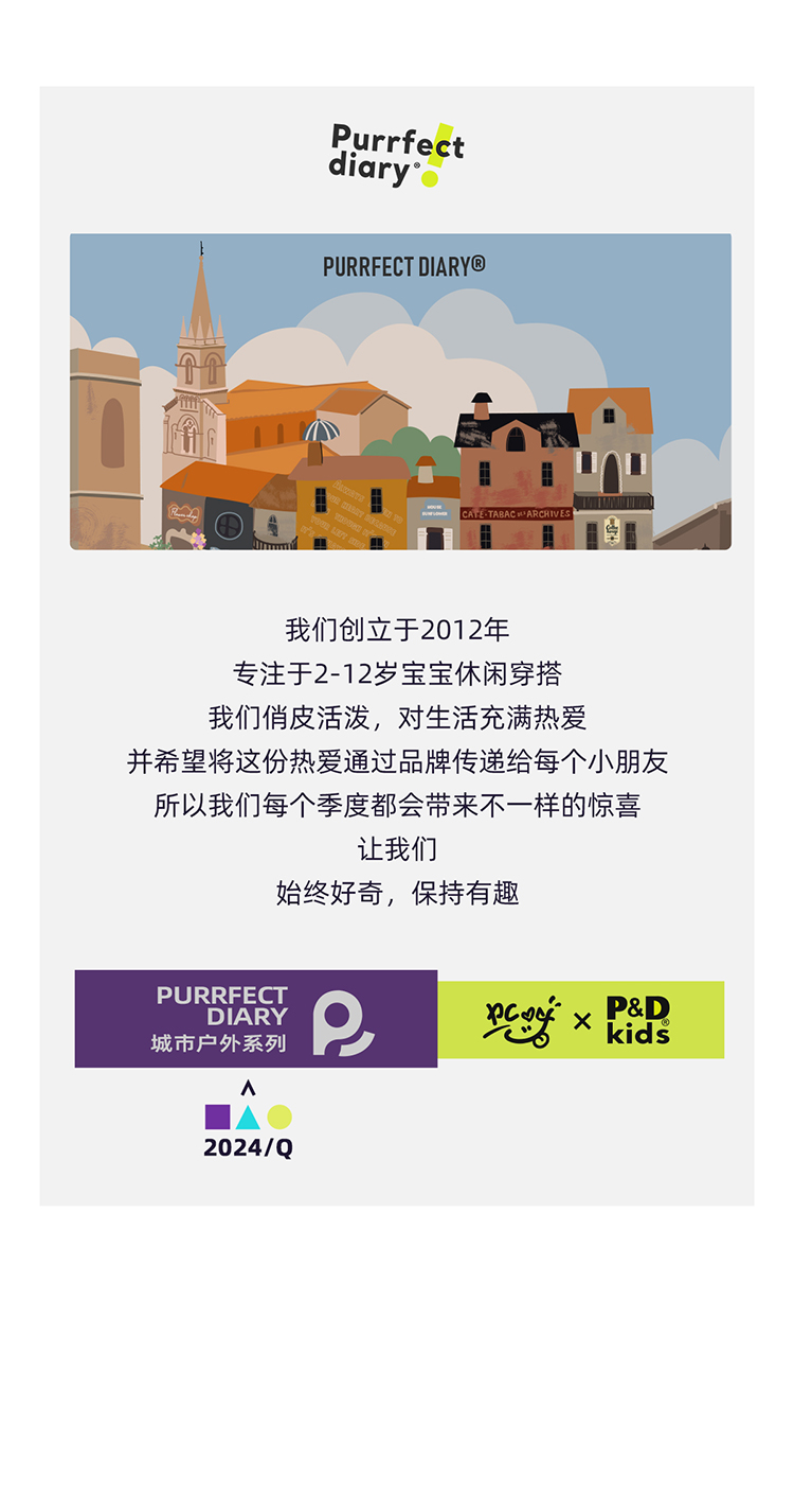 Purrfect-Diary专注于贴近自然随性的穿着概念,轻奢平价的童装文化传播,在产品设计上更加注重婴童穿着的舒适性、安全性、更出众的国际化品牌,将欧美的育婴文化在中国进行深入的传播与推广。