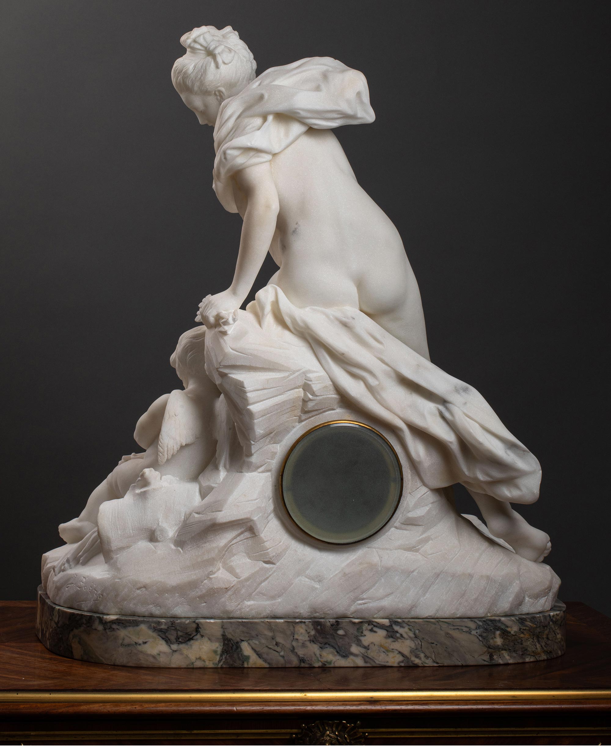 独角鹿西洋古董 19世纪意大利雕塑家Jacques Boero签名创作丘比特与普绪克主题大理石雕塑装饰铜鎏金珐琅表盘座钟