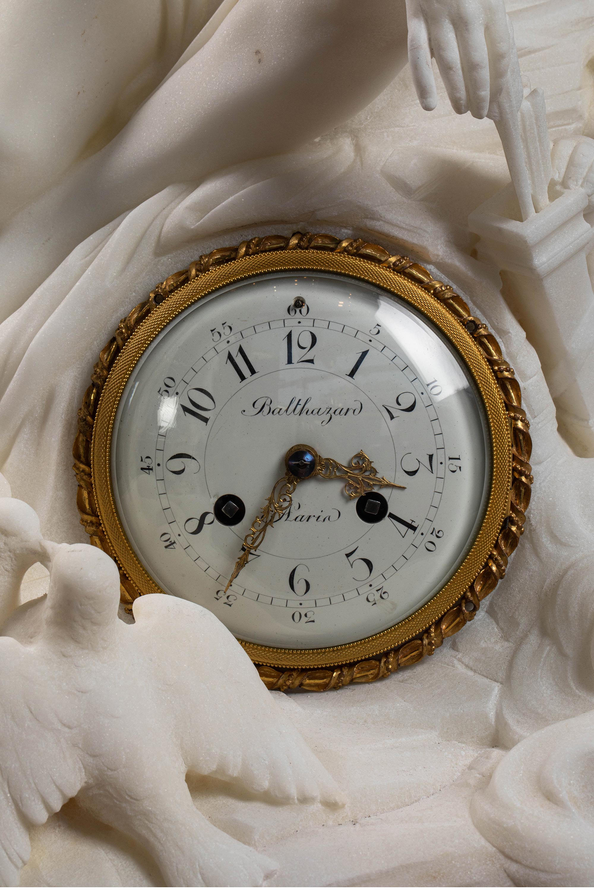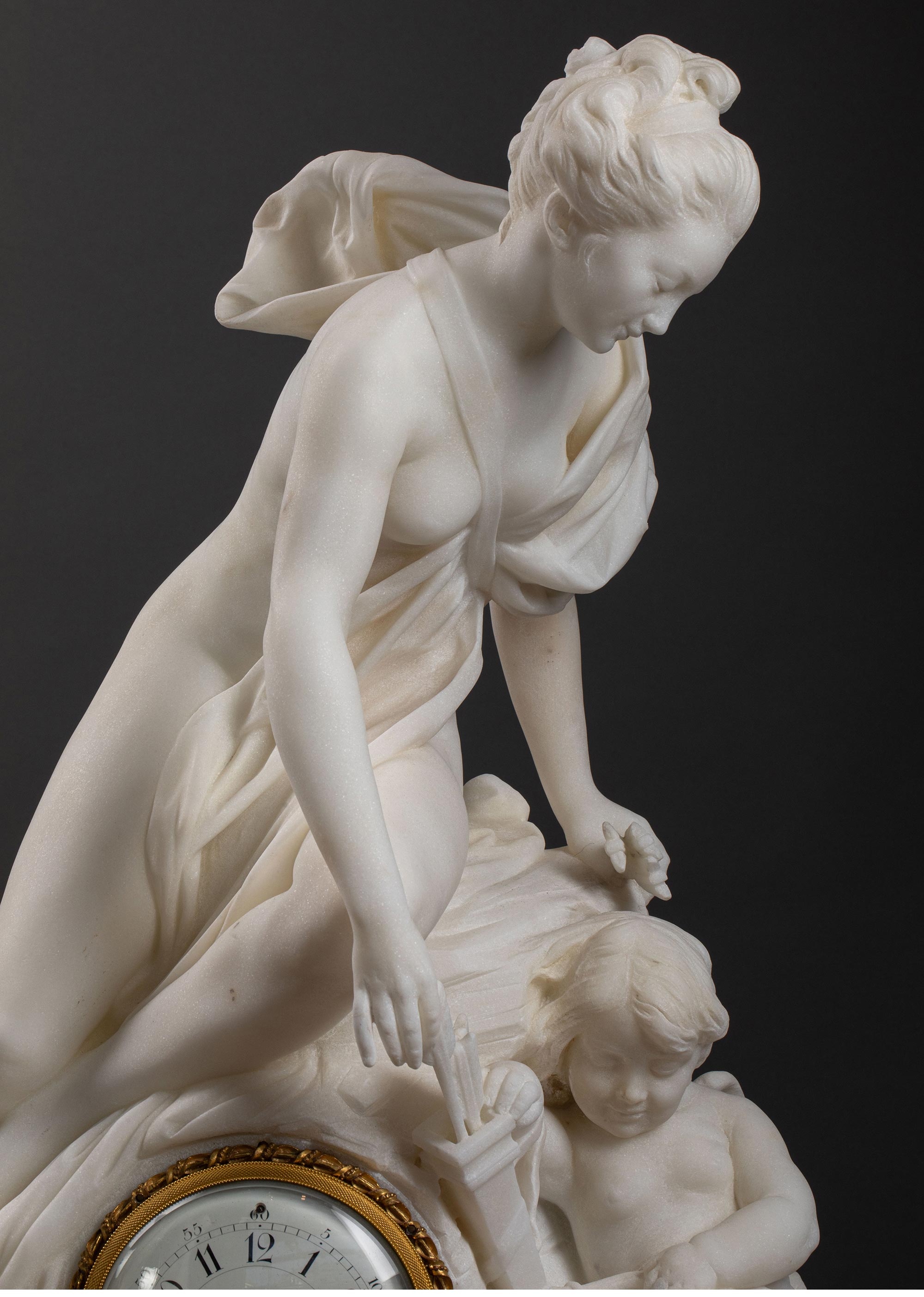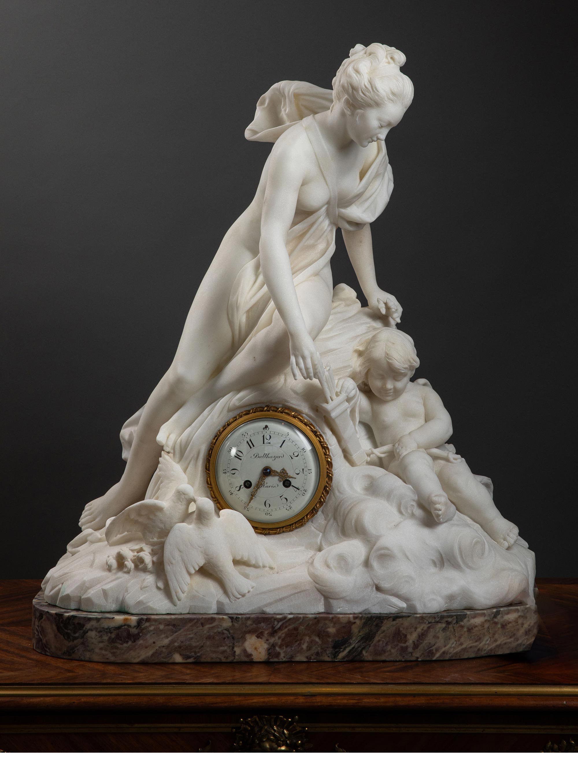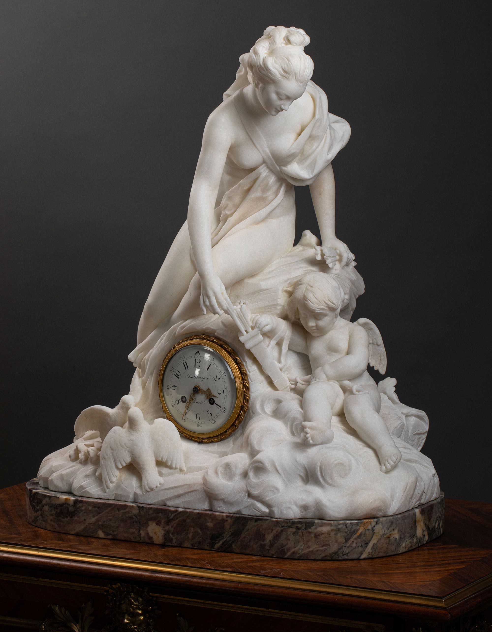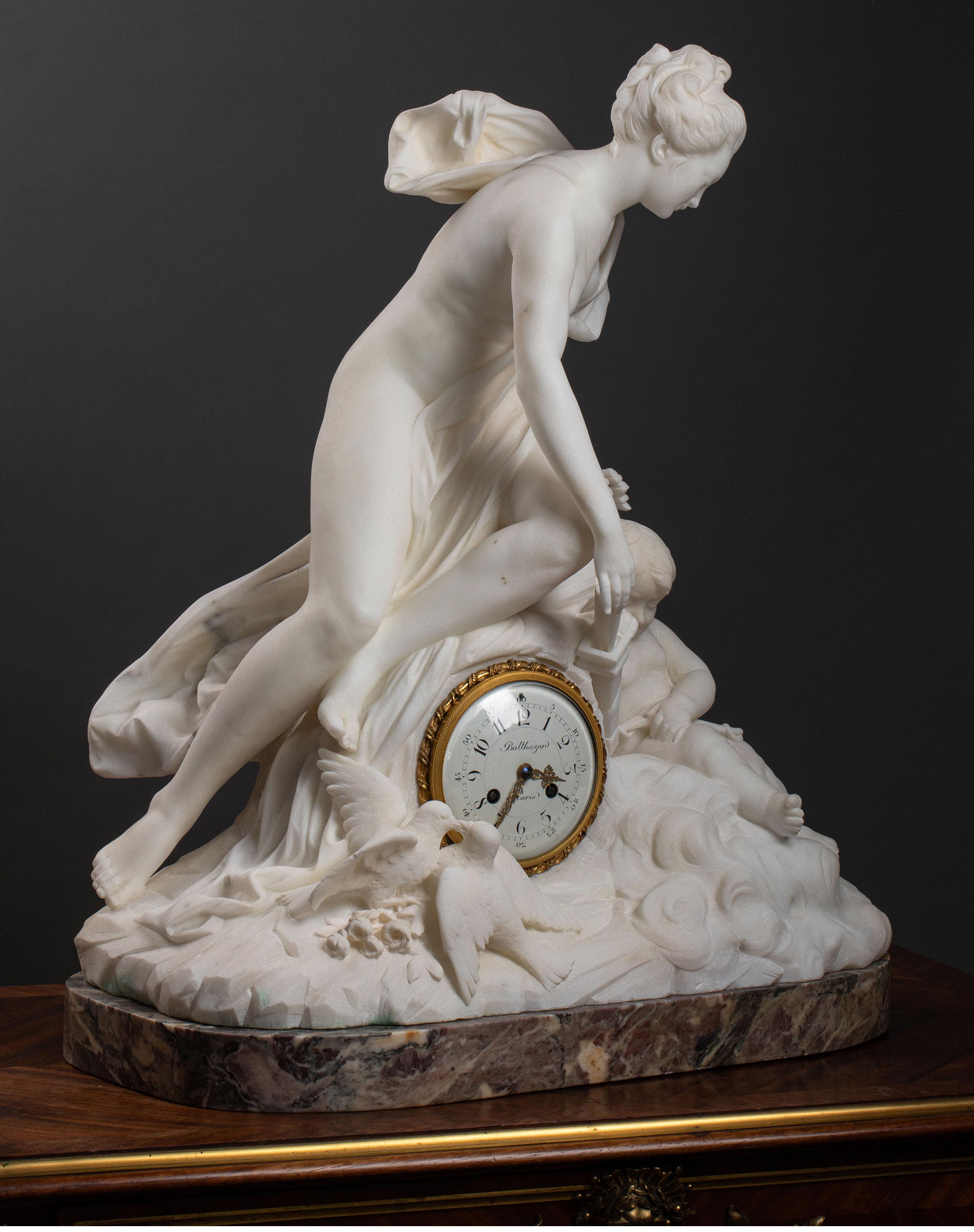 19世纪意大利雕塑家Jacques Boero签名创作丘比特与普绪克主题大理石雕塑装饰铜鎏金珐琅表盘座钟
