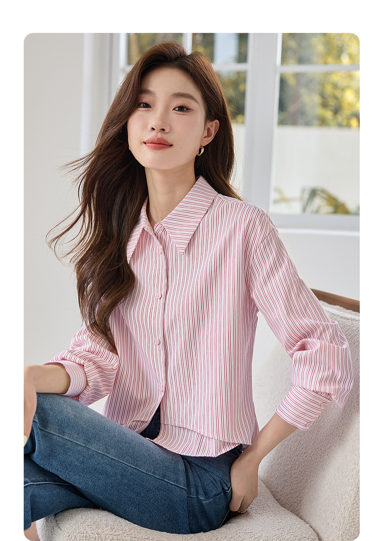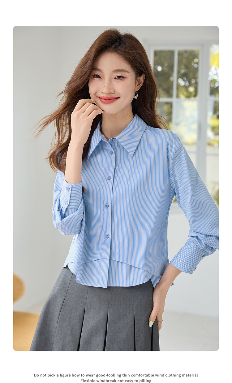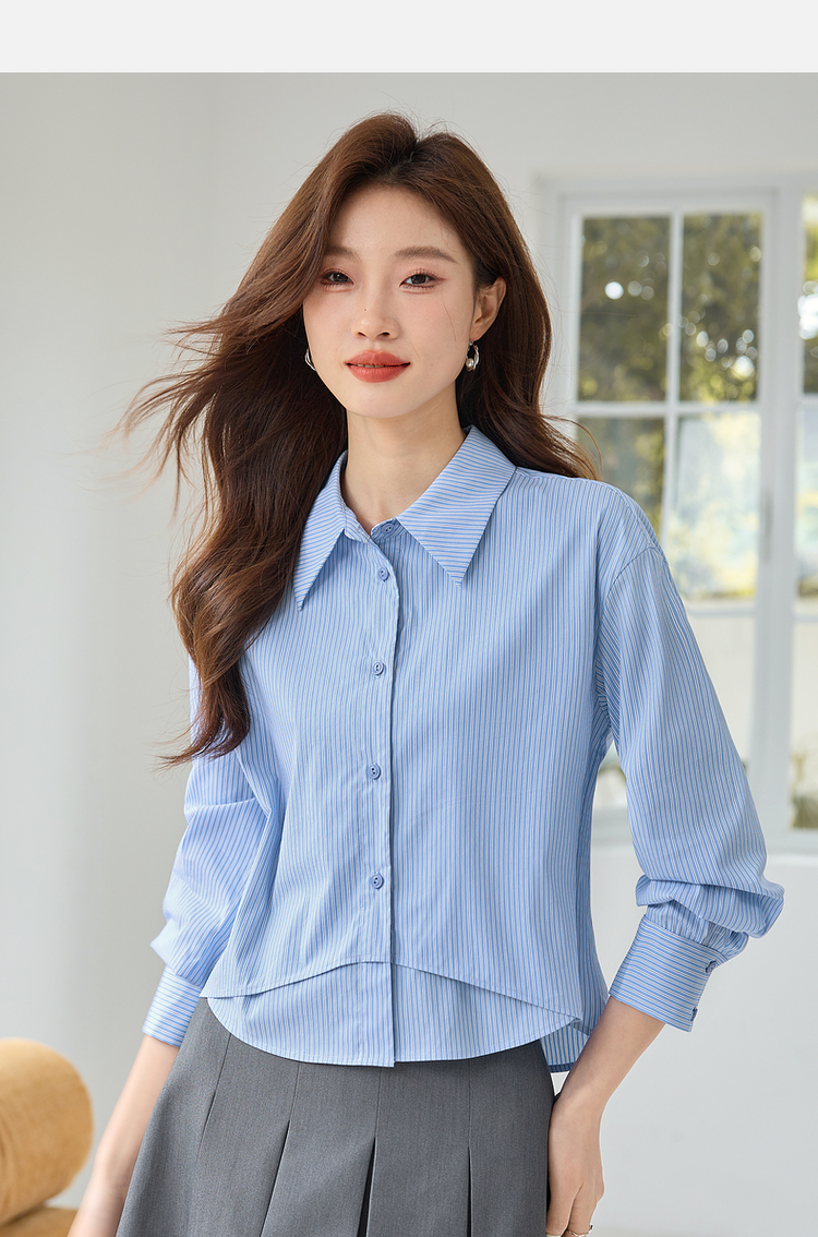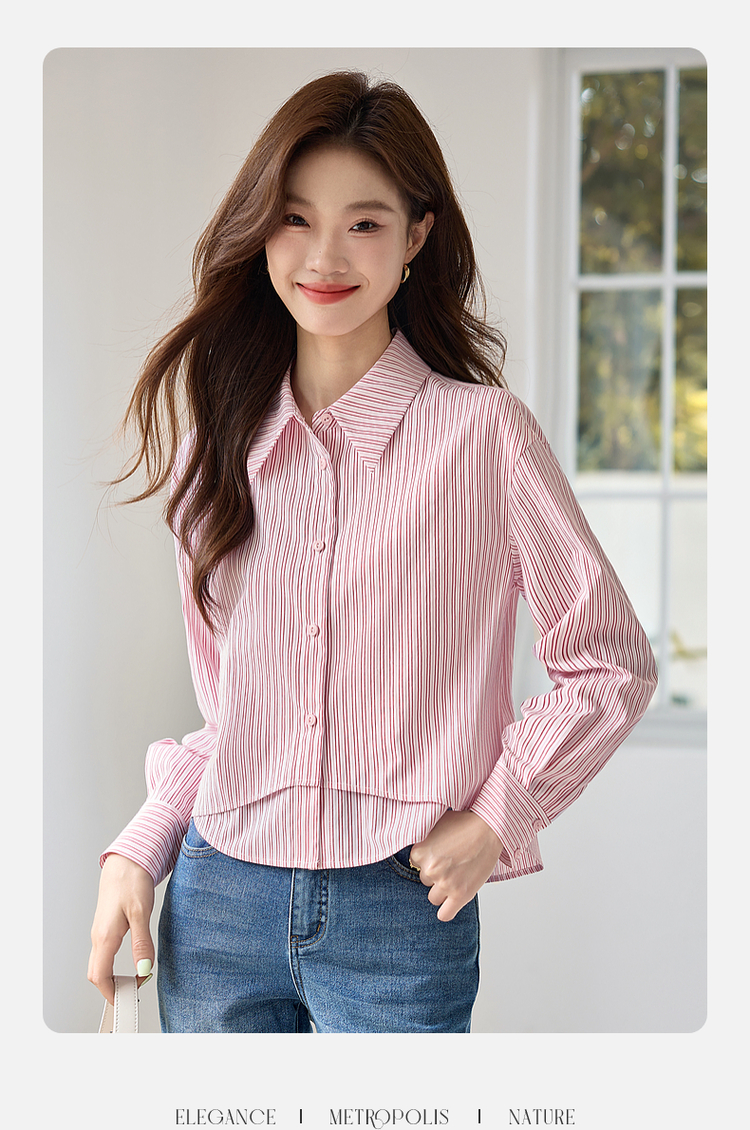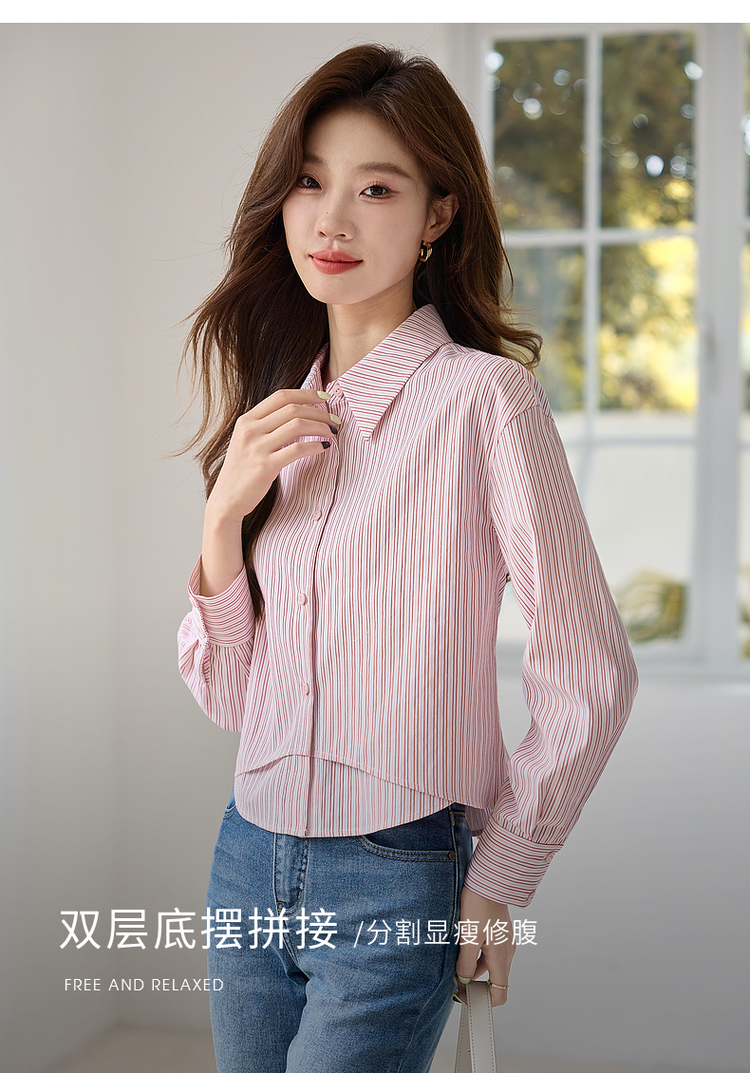 【年终特卖】熙世界设计感别致条纹衬衫2025早秋新款通勤小个子拼接时尚衬衣
