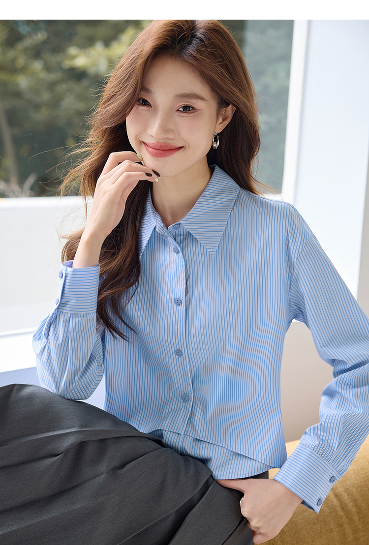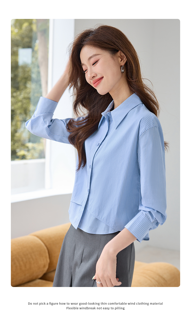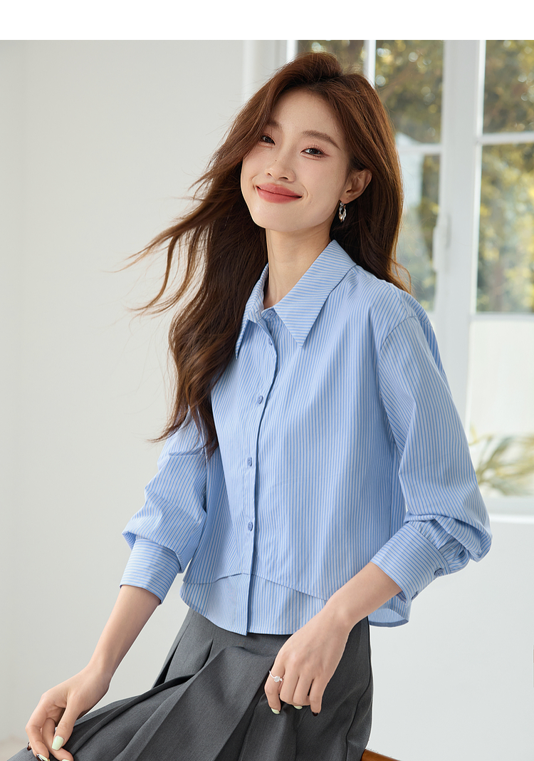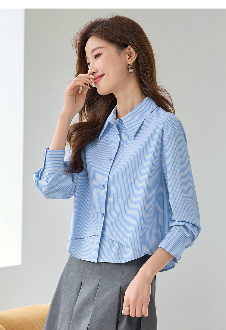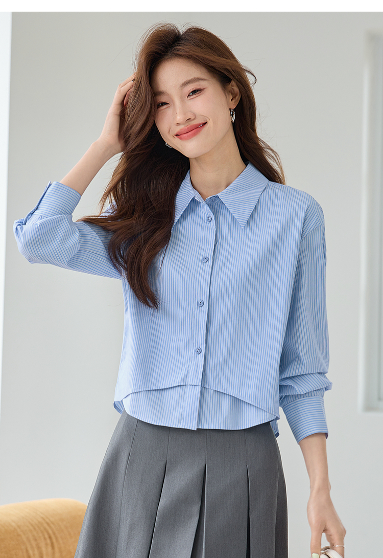 【年终特卖】熙世界设计感别致条纹衬衫2025早秋新款通勤小个子拼接时尚衬衣