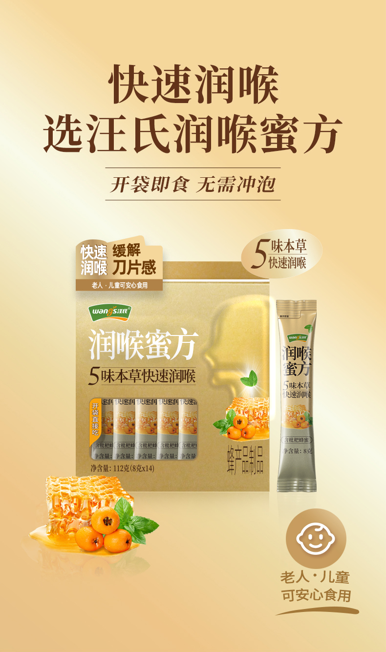 【汪氏】枇杷蜂蜜纯正天然薄荷儿童枇杷润喉蜜方便携装112克(8克*14)/2盒装快速润喉,缓解喉咙肿痛,即食便利装