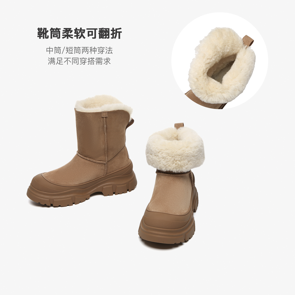 鞋面:牛反绒 内里:羊毛内里 大底:轻质橡胶 底厚 3.7