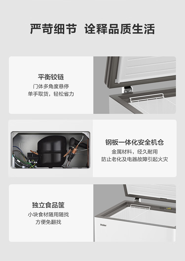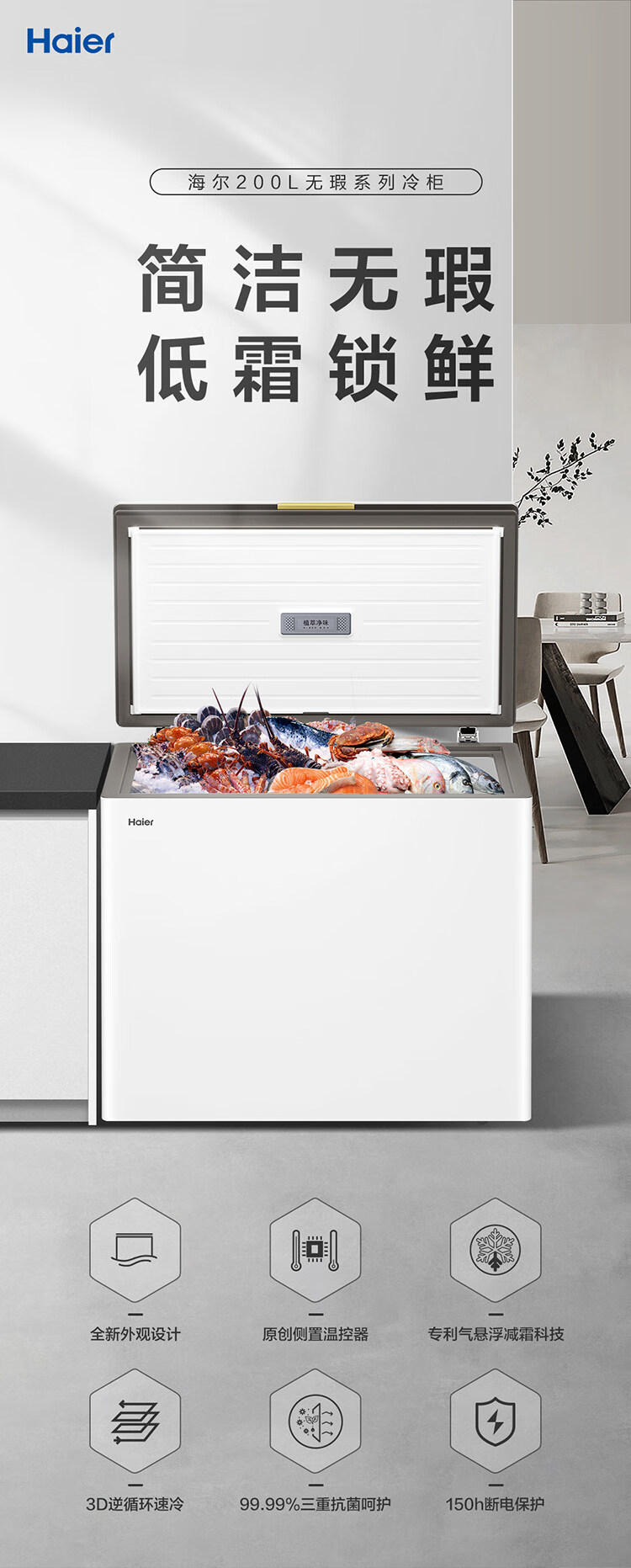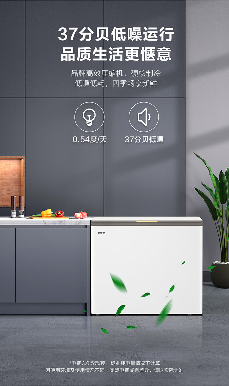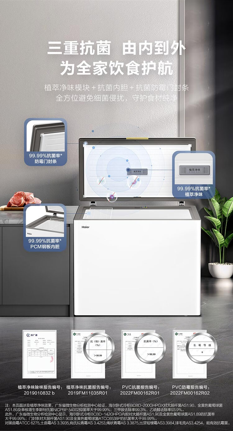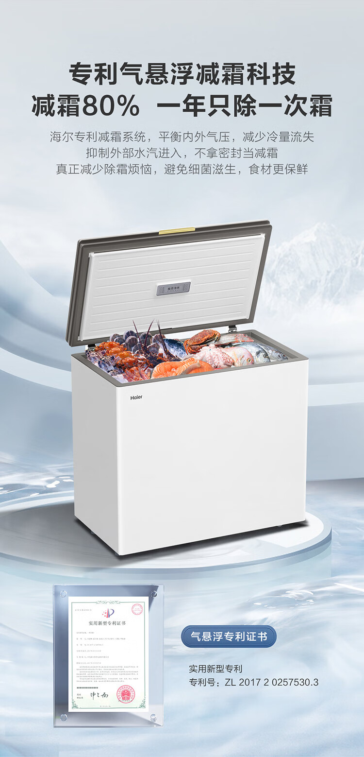 海尔 200升 低霜 玻璃面板 两用冰柜 专利气悬浮减霜科技减霜80% 植萃净味 99.99%抗菌率 侧置温控器 150h断电保护 BC/BD-200GHPGX