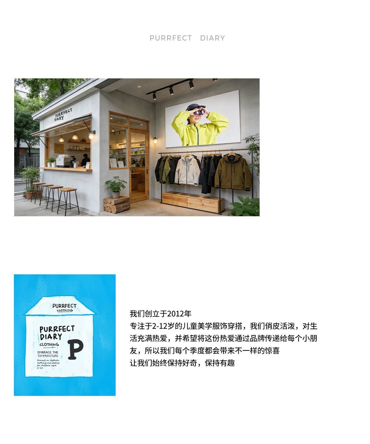 - Purrfect-Diary专注于贴近自然随性的穿着概念,轻奢平价的童装文化传播,在产品设计上更加注重婴童穿着的舒适性、安全性、更出众的国际化品牌,将欧美的育婴文化在中国进行深入的传播与推广。