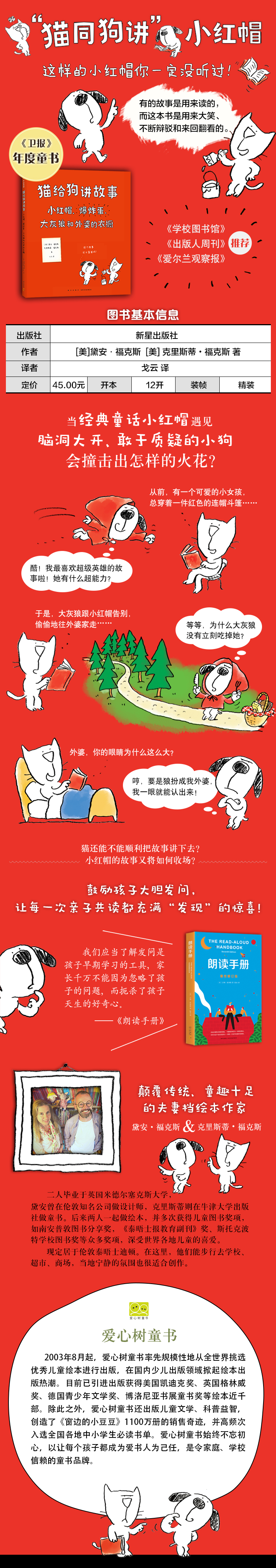 黛安·福克斯、克里斯蒂·福克斯著的《猫给狗讲故事(小红帽爆炸蛋大灰狼和外婆的衣橱)(精)》是一部儿童绘本。以对话的形式,讲述了猫想给狗正儿八经地讲述《小红帽》的故事,却被小狗不断打乱,并一次次往红帽女超人、狼坏蛋的不错英雄故事上引,碰撞出许多火花。小狗脑洞大开,充满想象力和趣味,猫和狗不在一个频道上的互动,让人忍俊不,是一本让人开怀大笑的书。