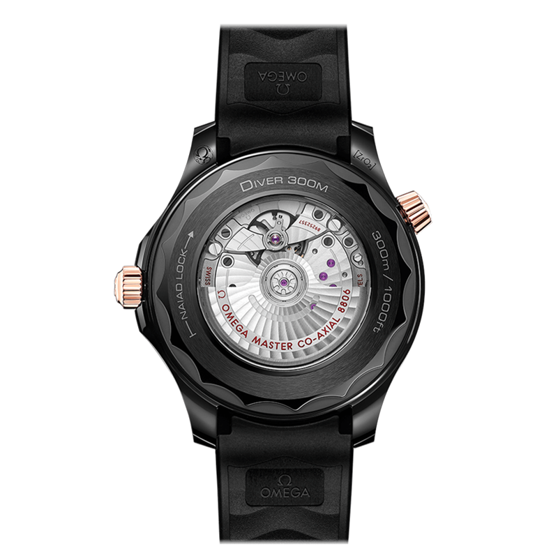 镜面材质 | 蓝宝石水晶玻璃 | 表盘 | 黑色氧化锆[ZrO2]陶瓷和Sedna 18K金制表壳,,黑色陶瓷表盘采用激光烧蚀技术,浮雕有波纹图案。 抛光Sedna 18K金小时刻度和指针切面均覆有白色Super-LumiNova夜光涂层 抛光和拉丝处理的表背采用波浪形边缘设计,具备欧米茄独有的NAIAD LOCK技术 |