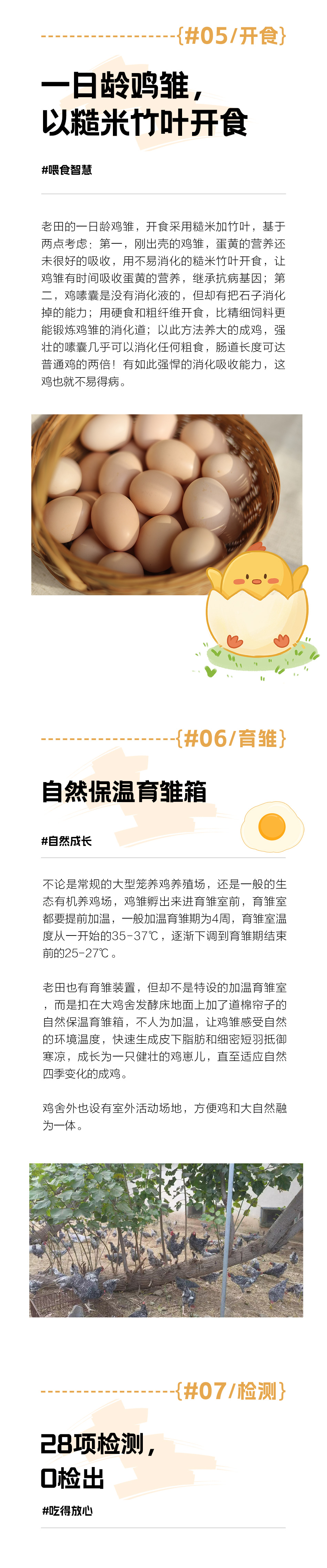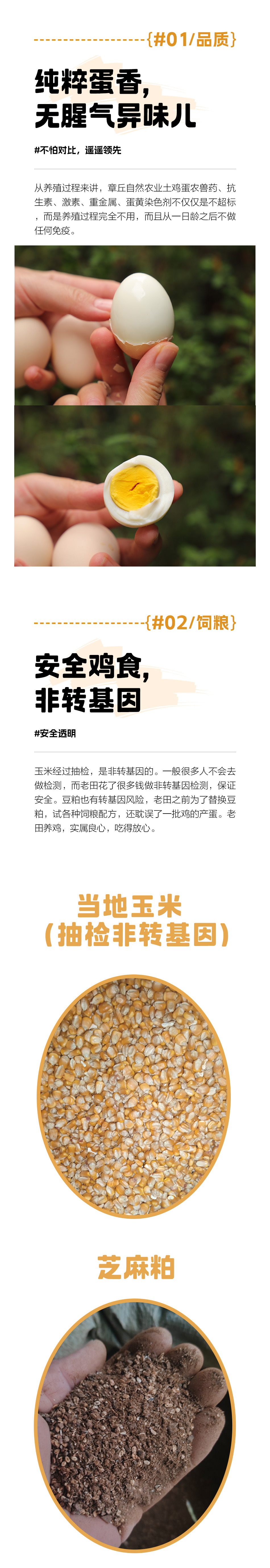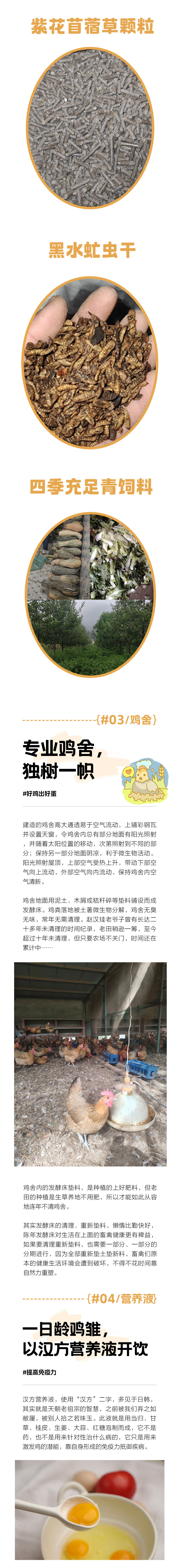 【品质承诺】: 全程禁用抗生素、农兽药、激素、重金属、蛋黄染色剂等;一日龄后0免疫;当地玉米(抽检非转基因)、芝麻粕、紫花苜蓿草颗粒、黑水虻虫干、四季充足青饲料饲喂。