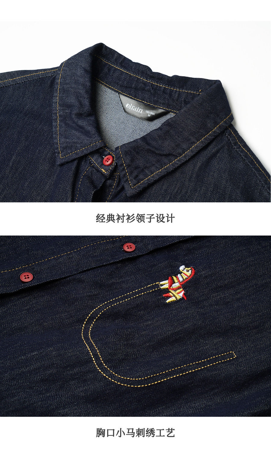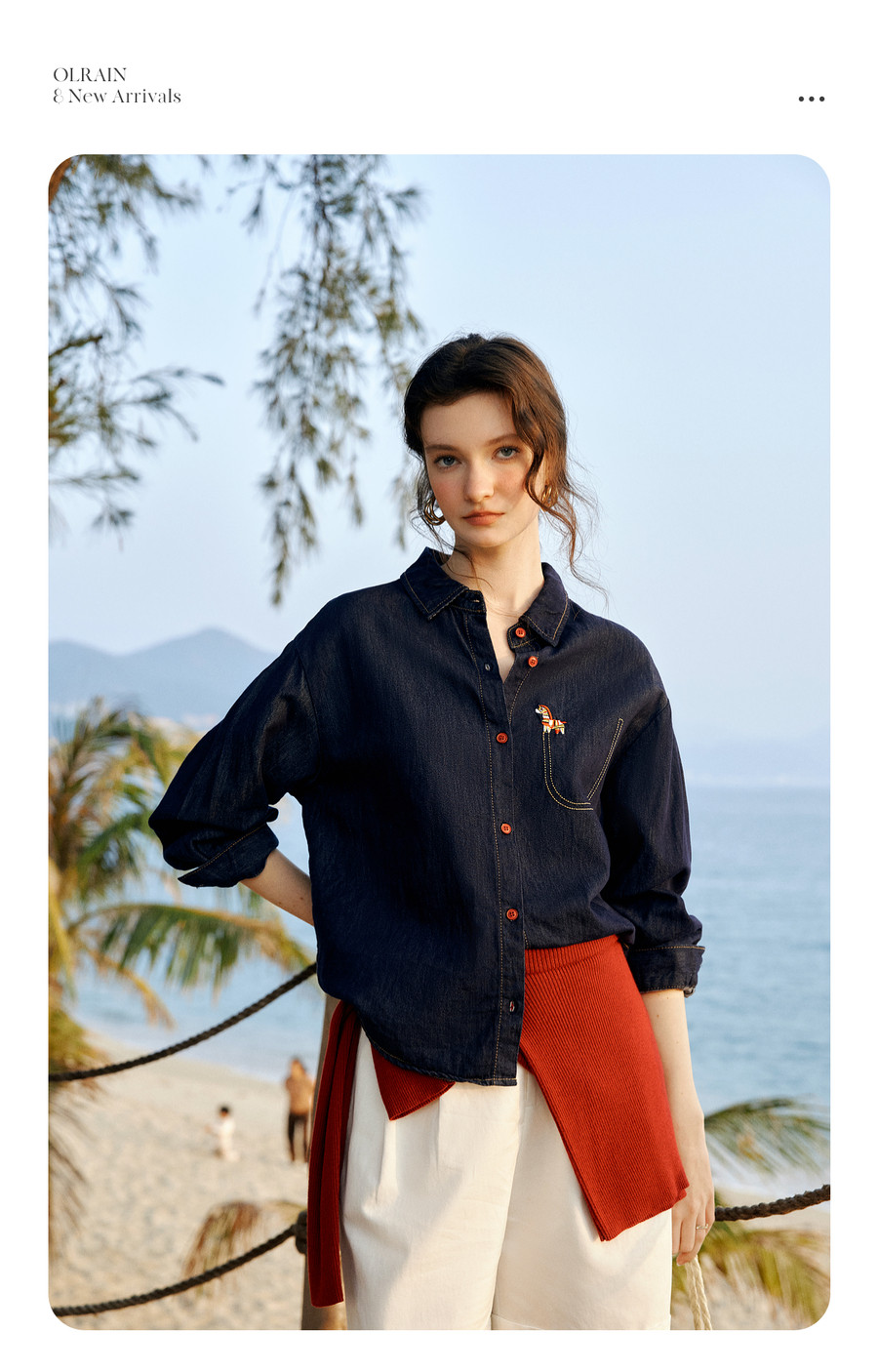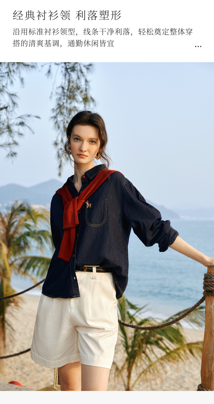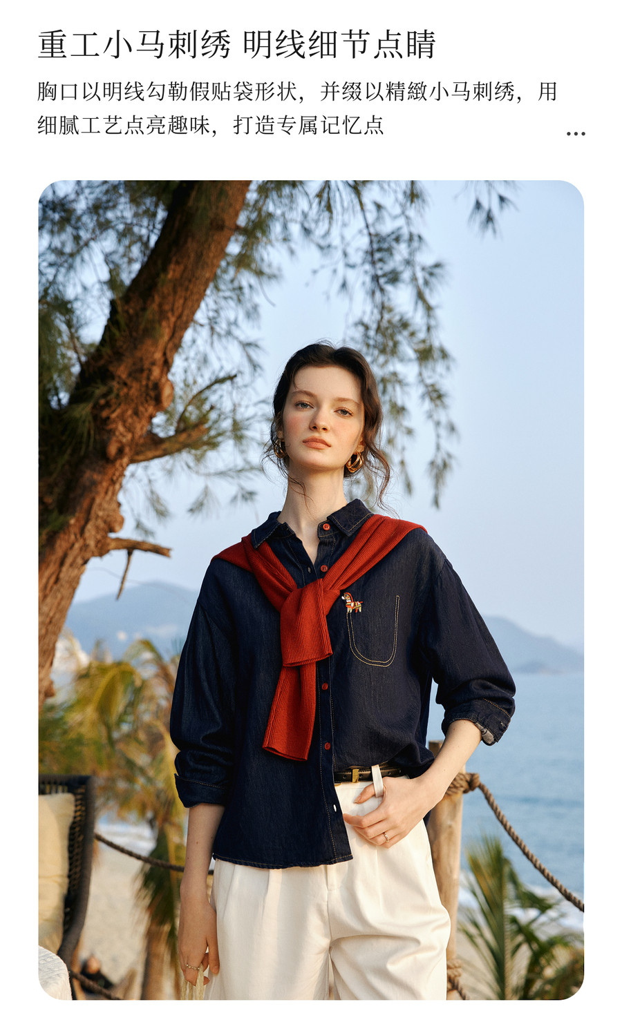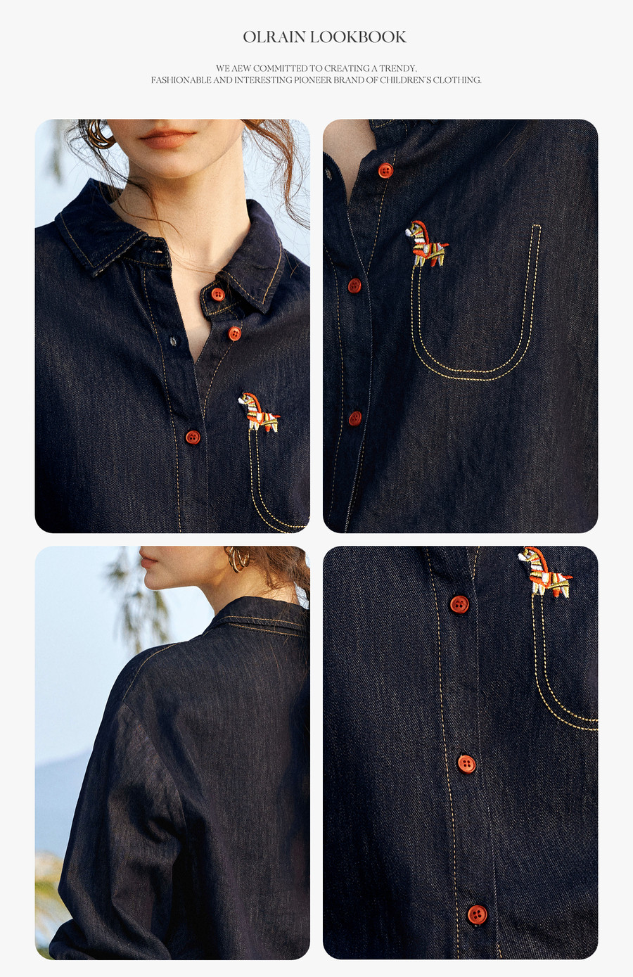 欧芮儿2026春新款莱赛尔牛仔衬衫女法式通勤复古小马刺绣长袖衬衣