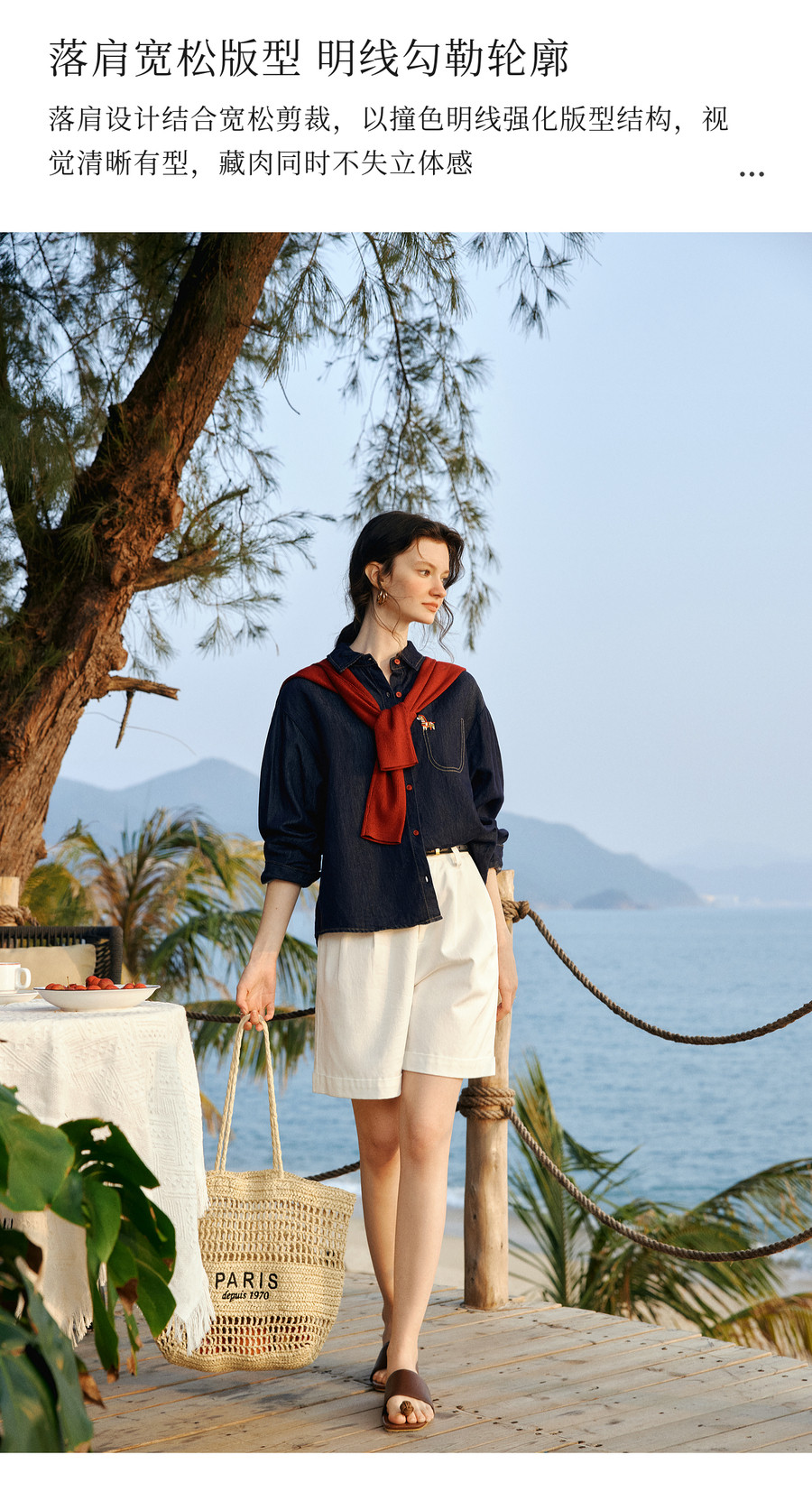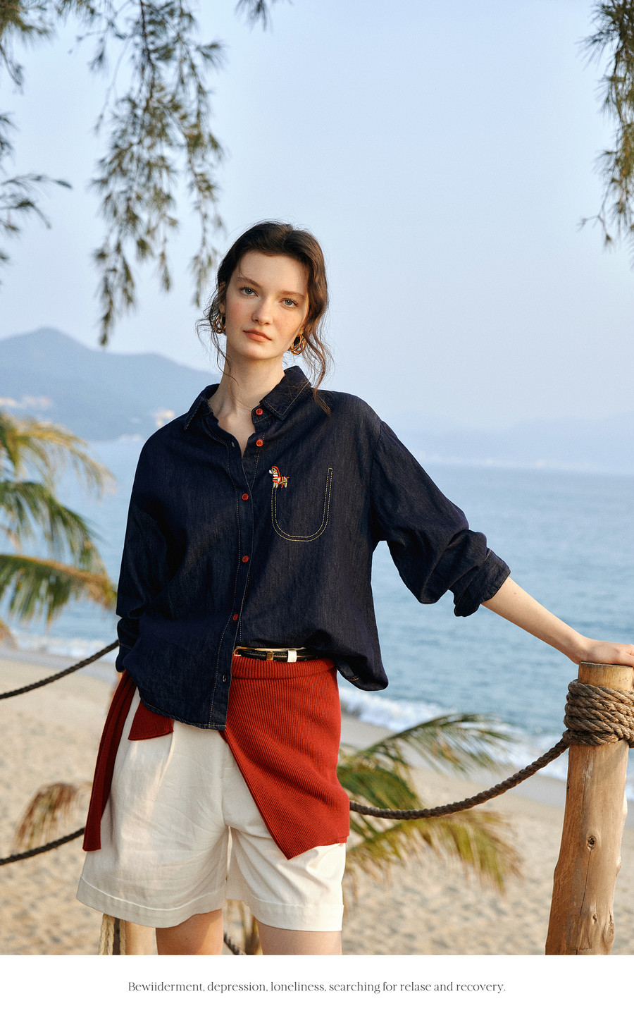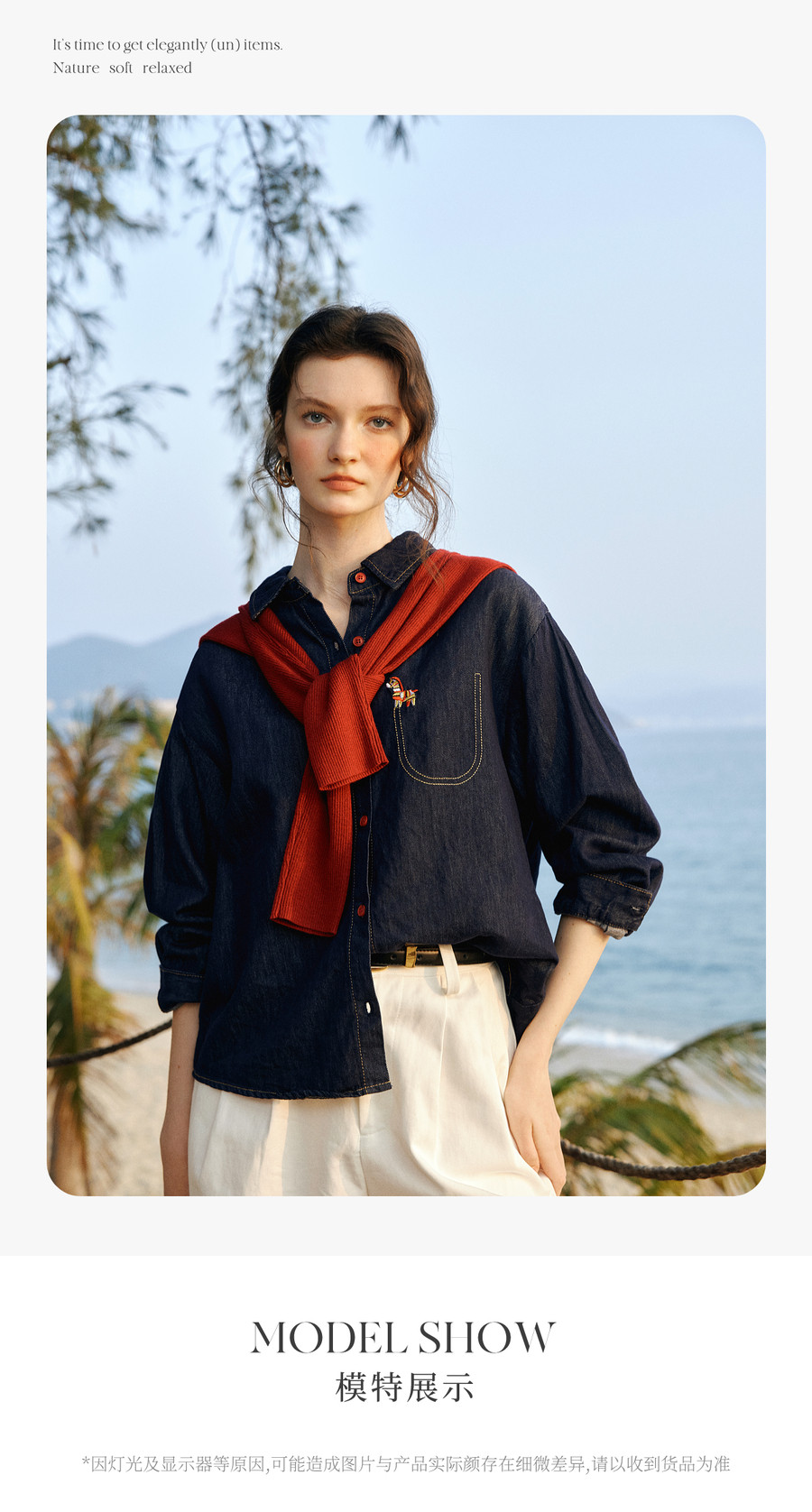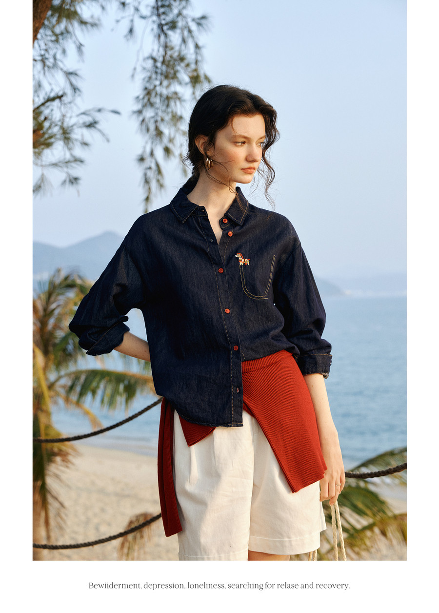 欧芮儿2026春新款莱赛尔牛仔衬衫女法式通勤复古小马刺绣长袖衬衣