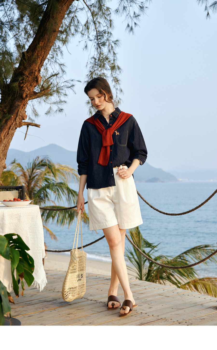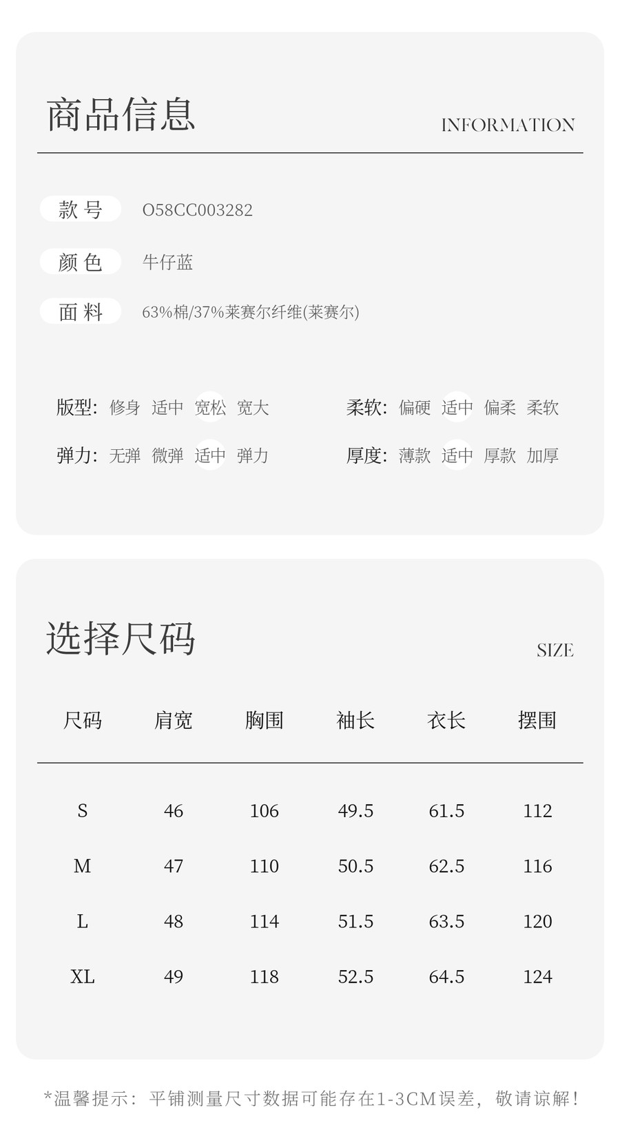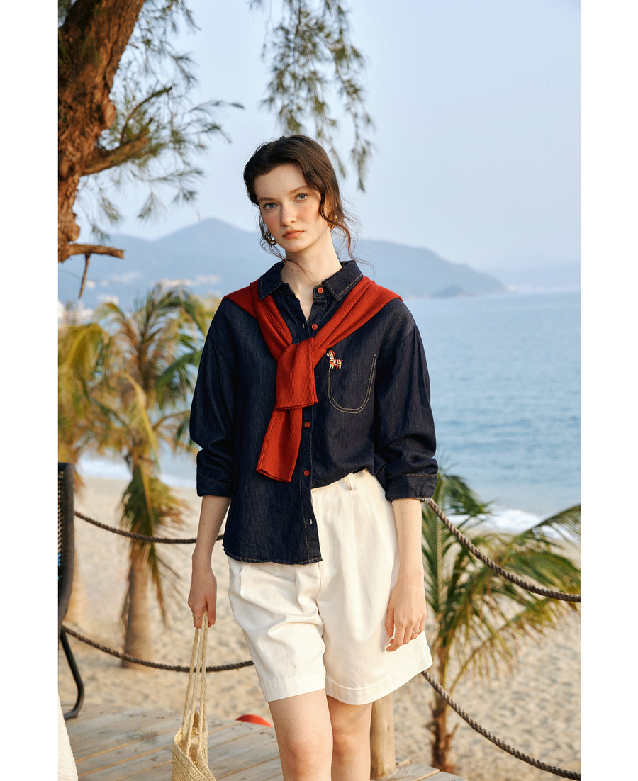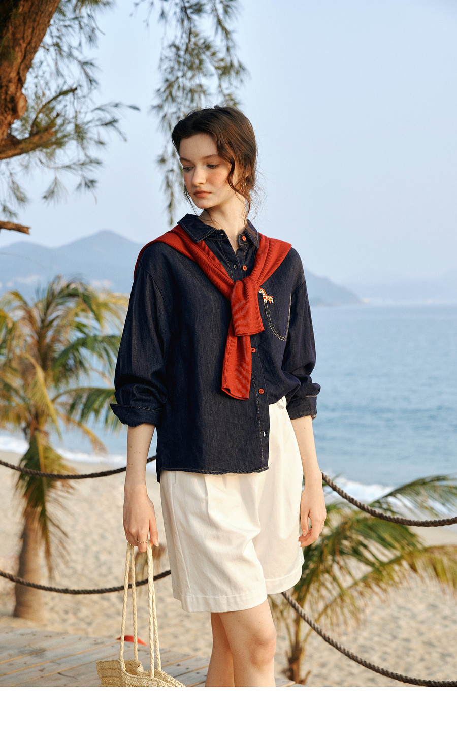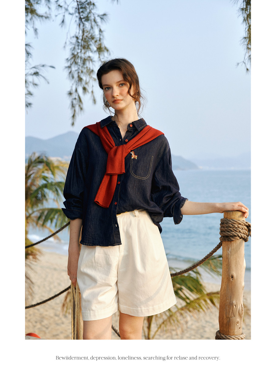 欧芮儿2026春新款莱赛尔牛仔衬衫女法式通勤复古小马刺绣长袖衬衣