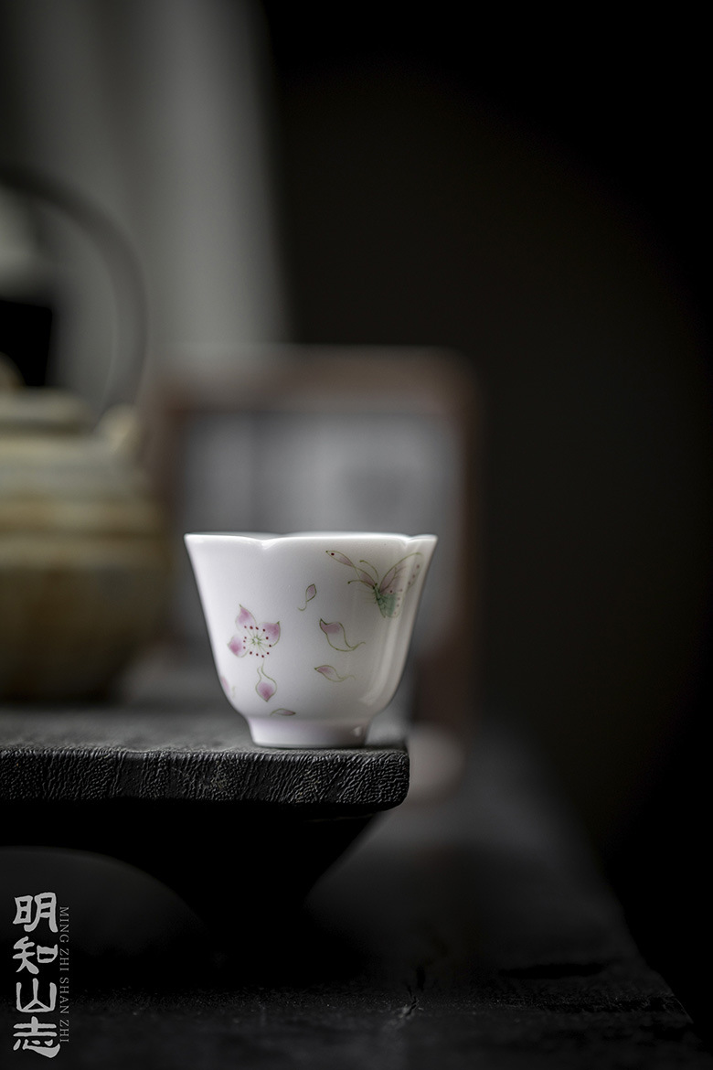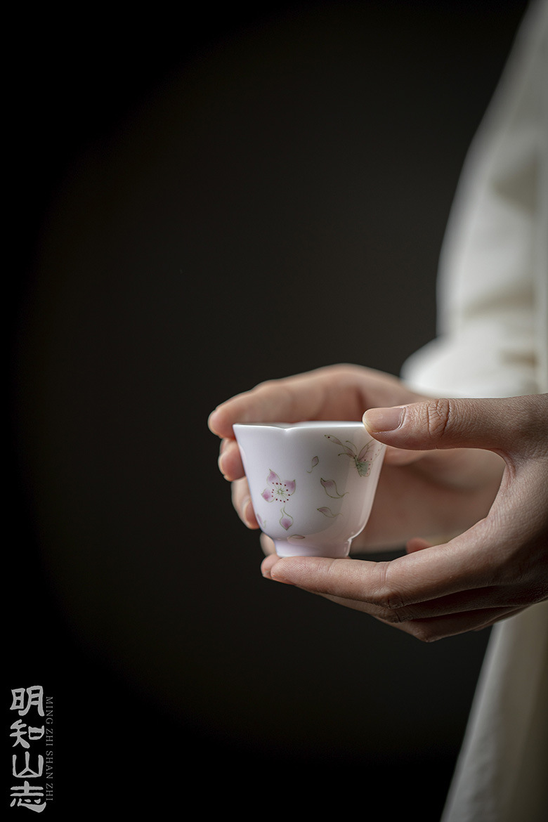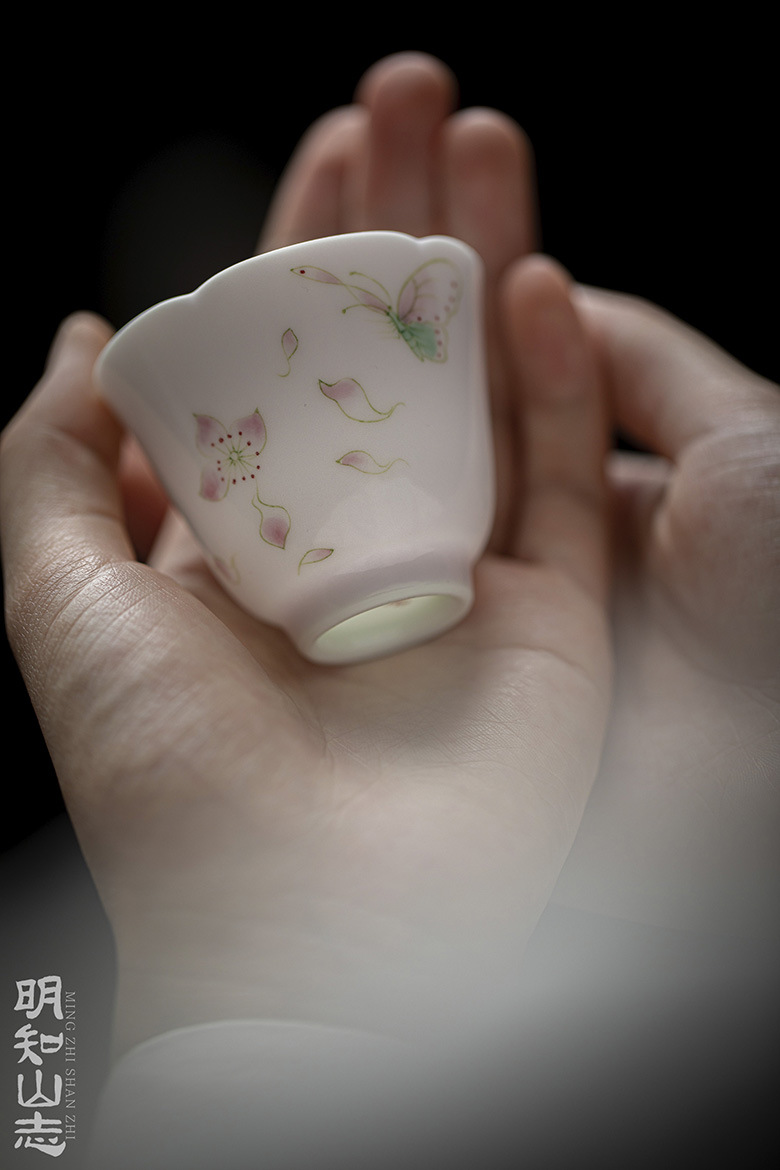 束刻/明知山志/杏粉/莲香漫舞/云灵杯手绘舞蝶粉色茶杯功夫茶具喝茶杯品茗杯