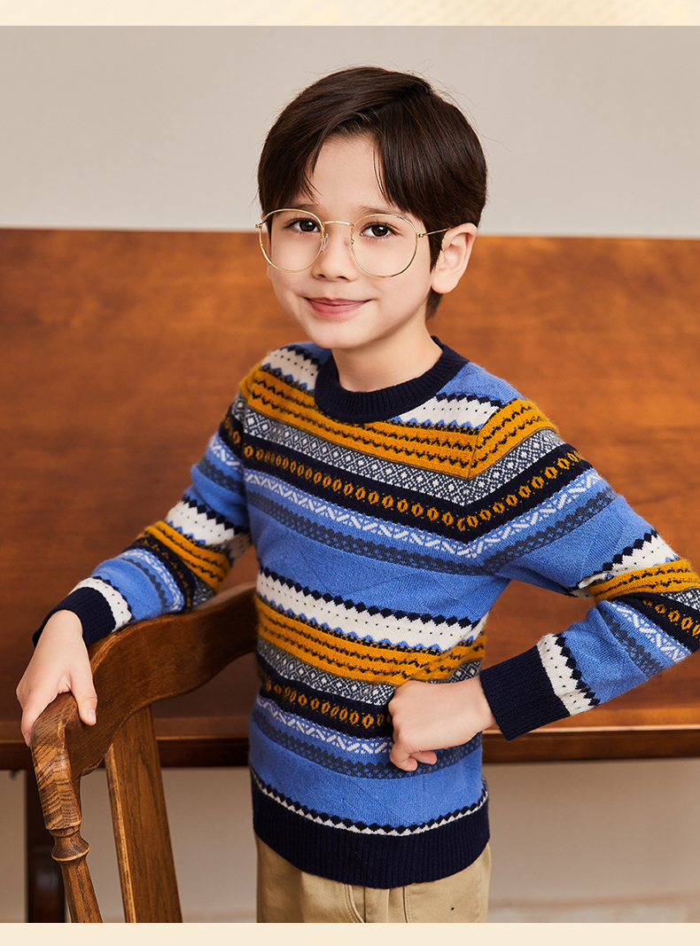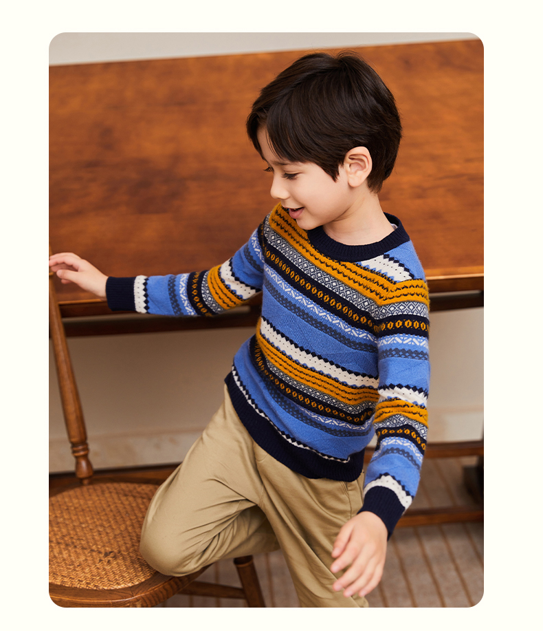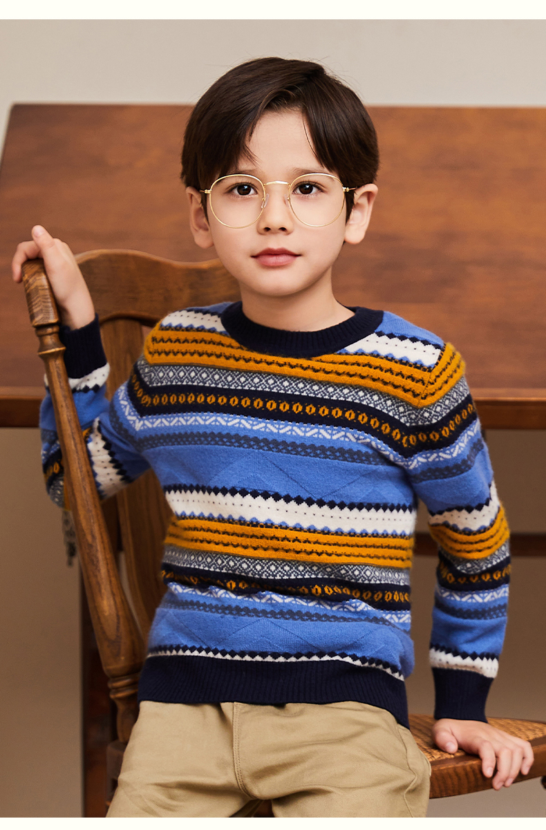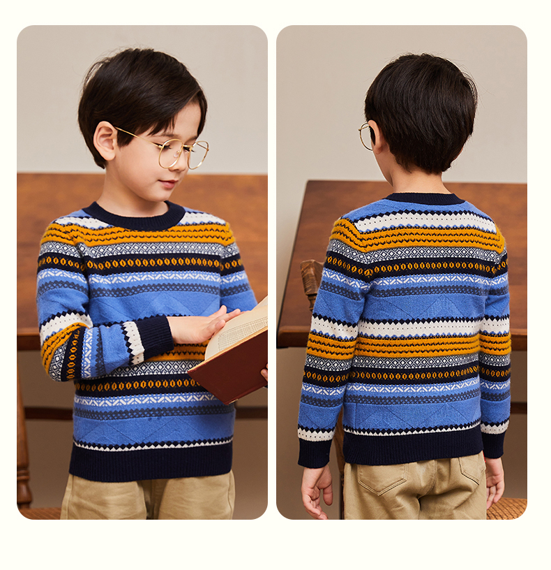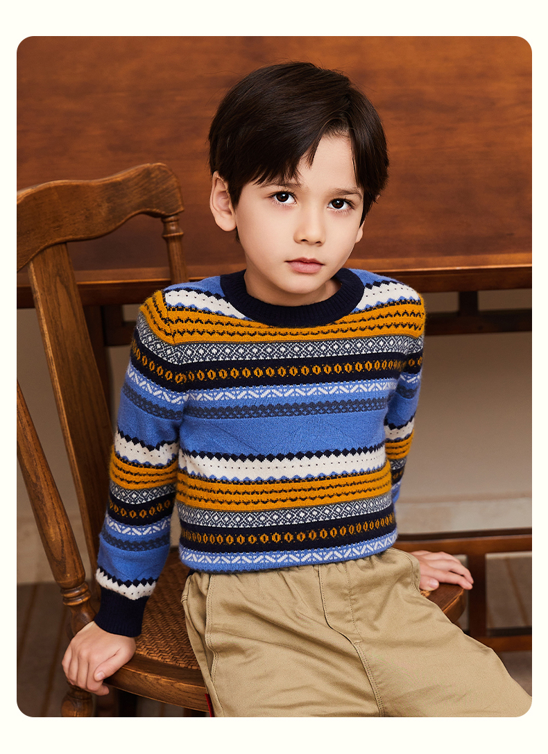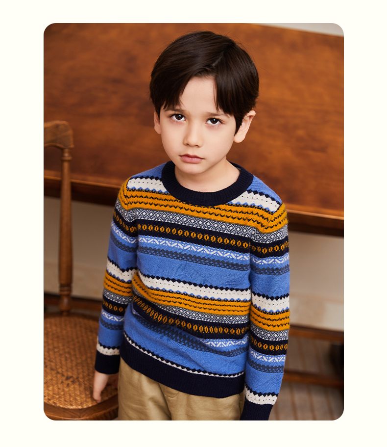 mettekids男童羊绒衫春秋新款条纹儿童毛衣大童圆领休闲针织衫