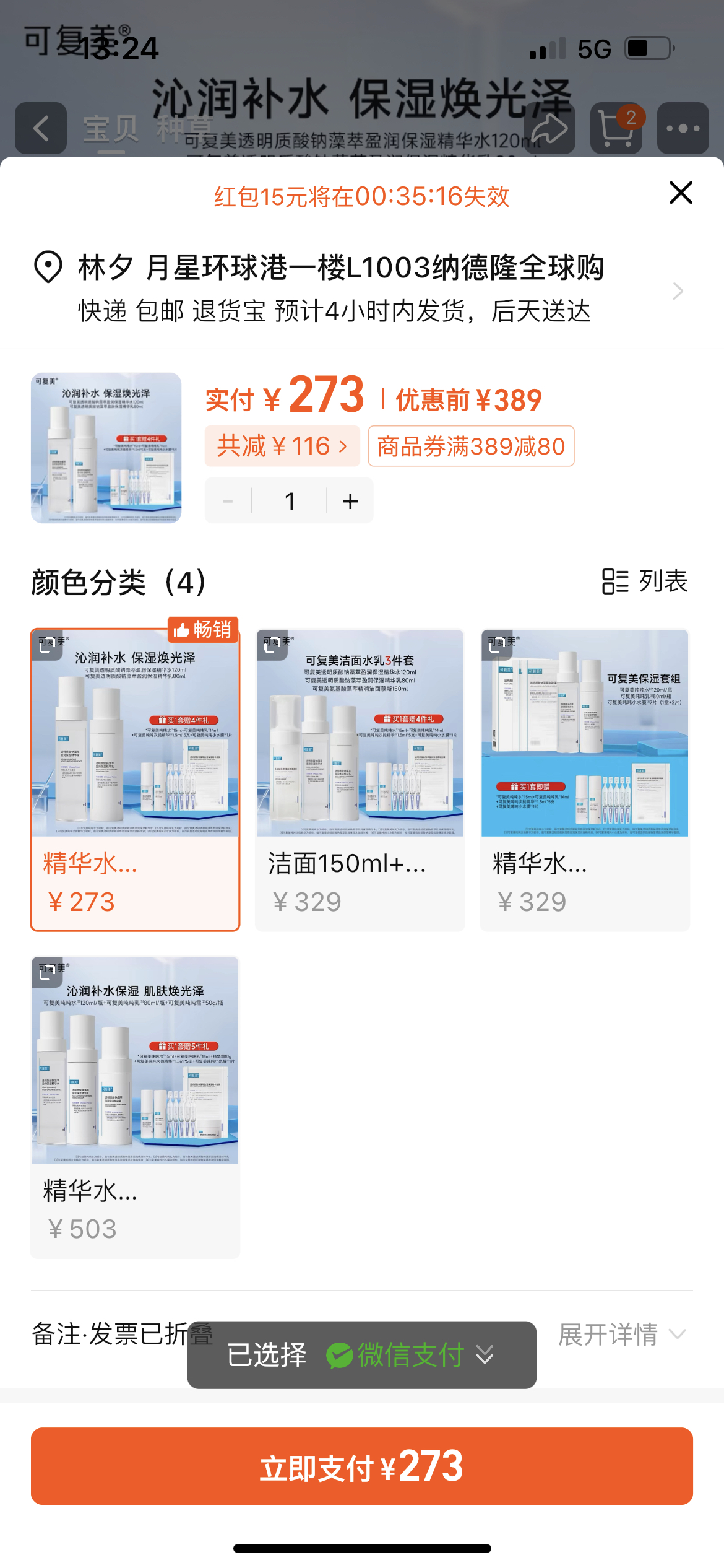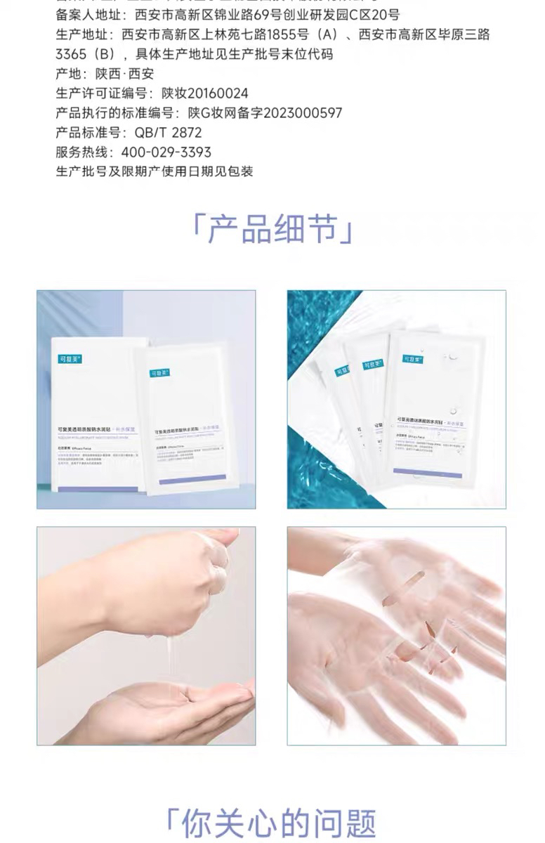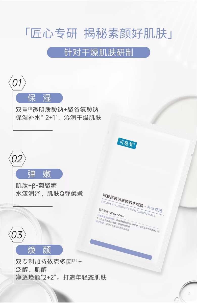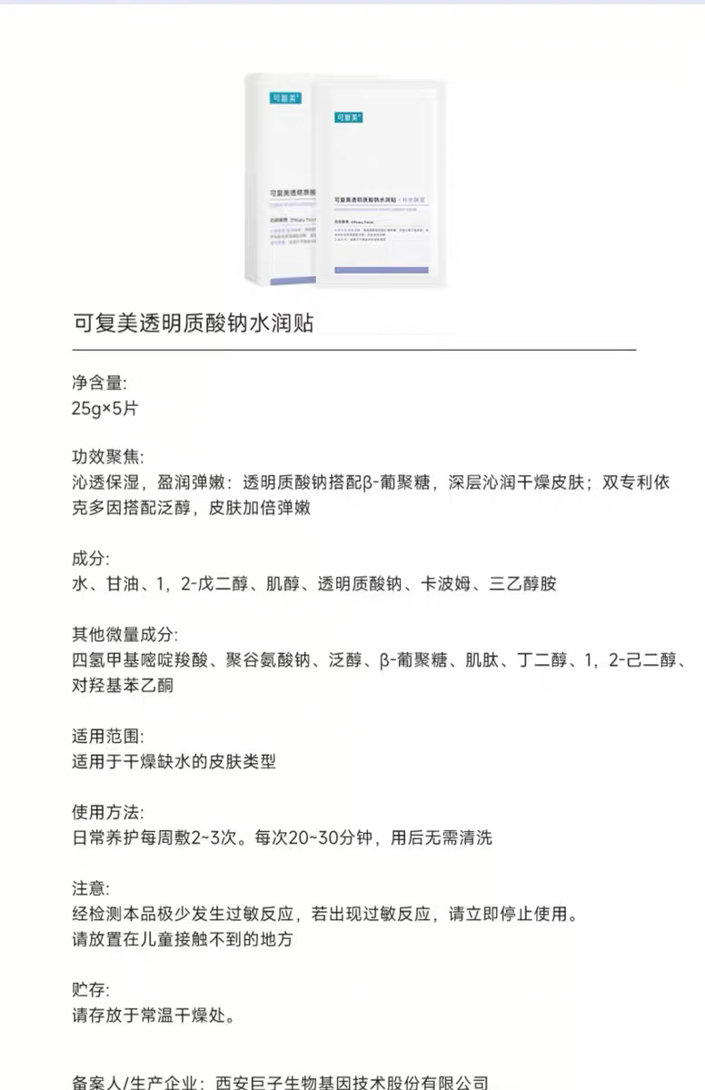【海关监管】可复美-透明质酸钠大水膜-沁润补水保湿贴片面膜5P-会员5折