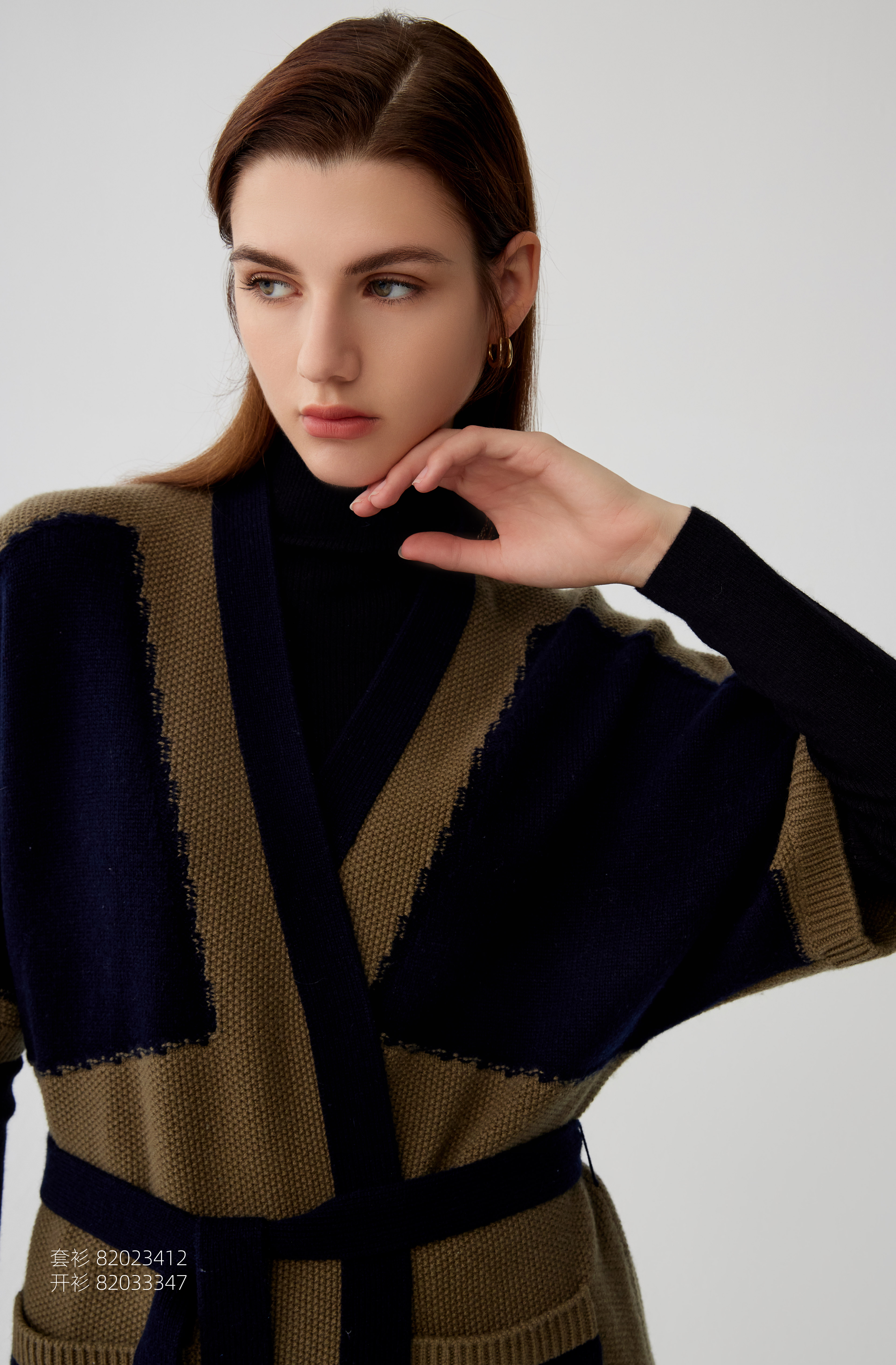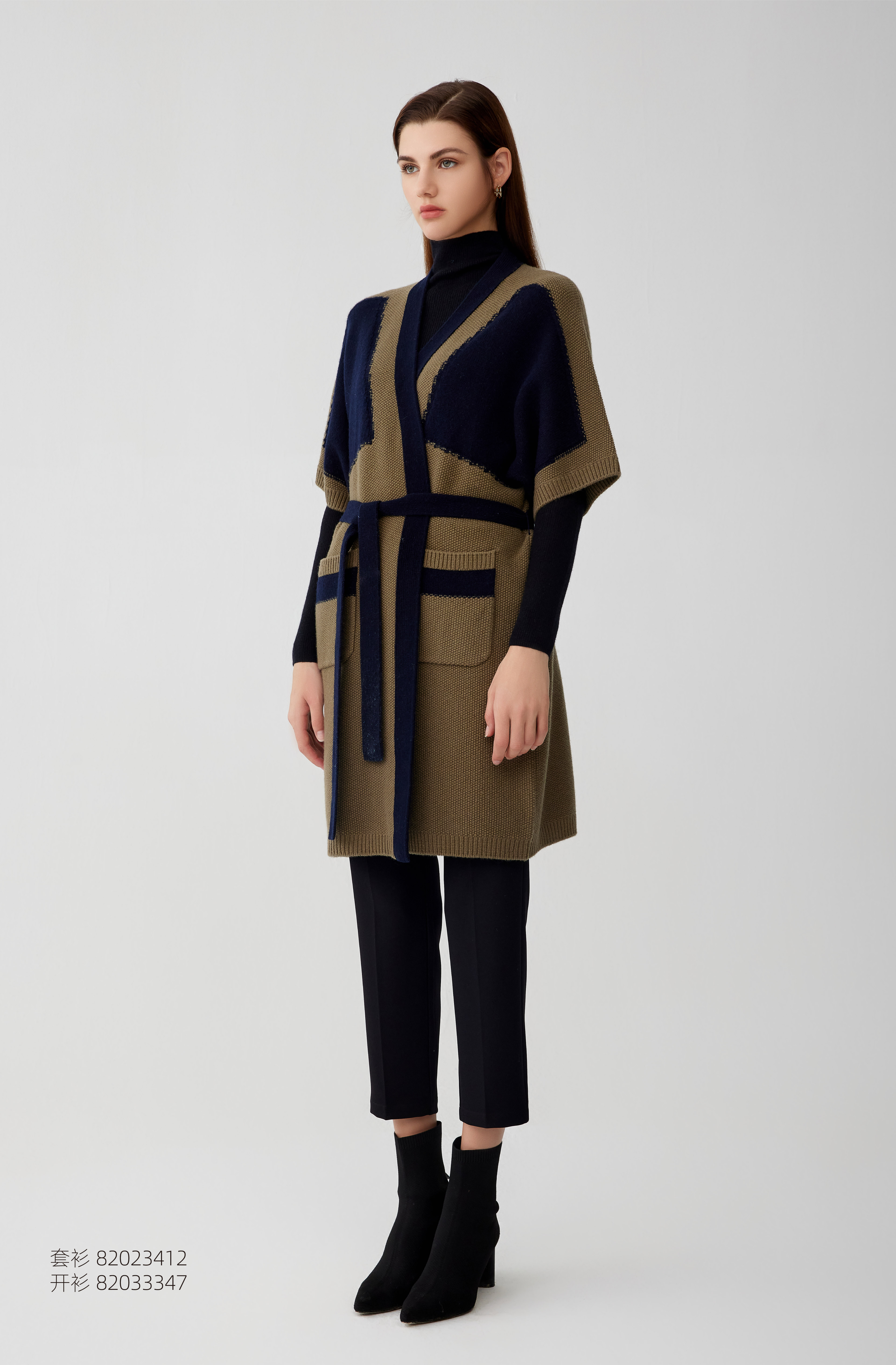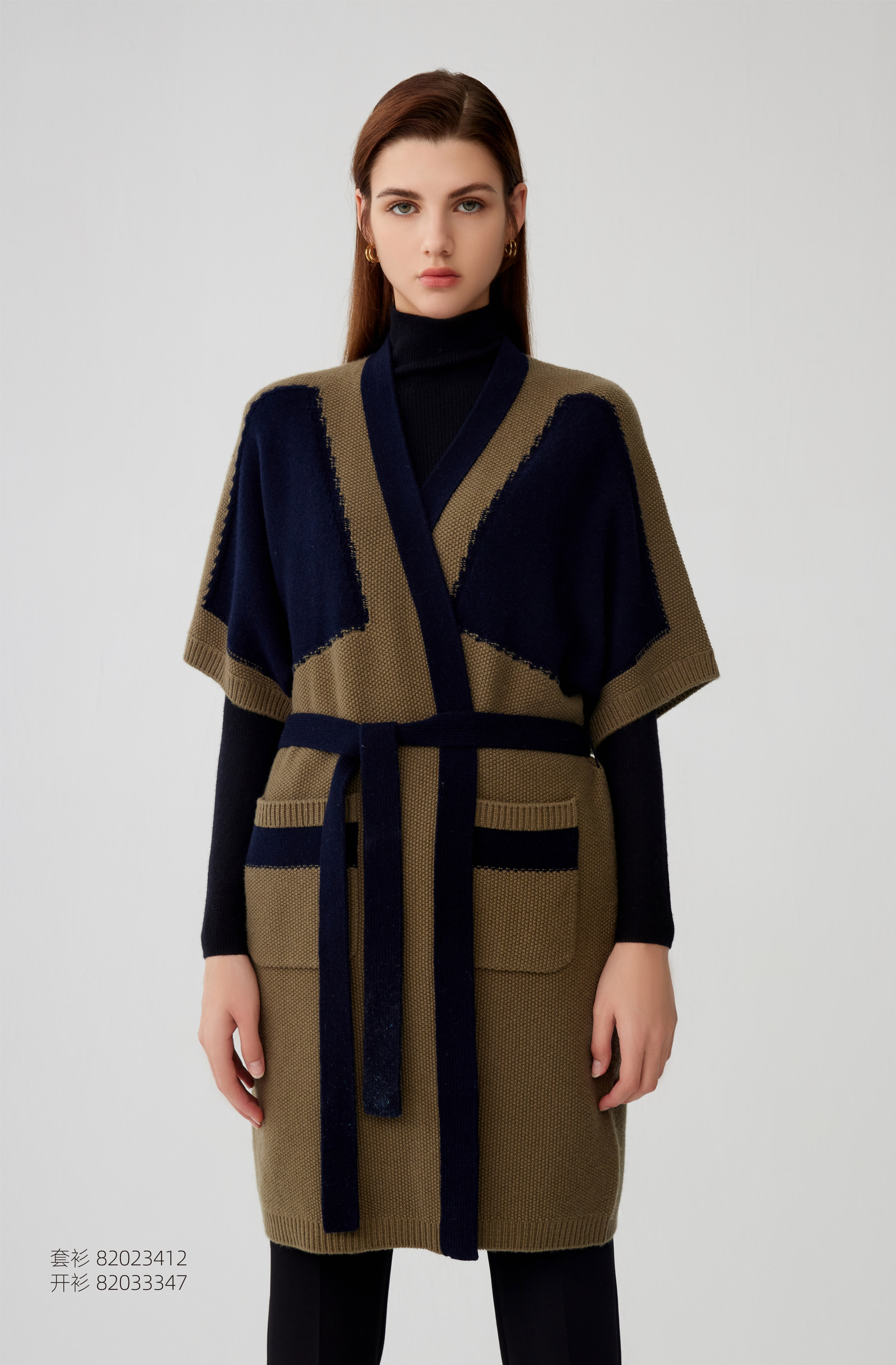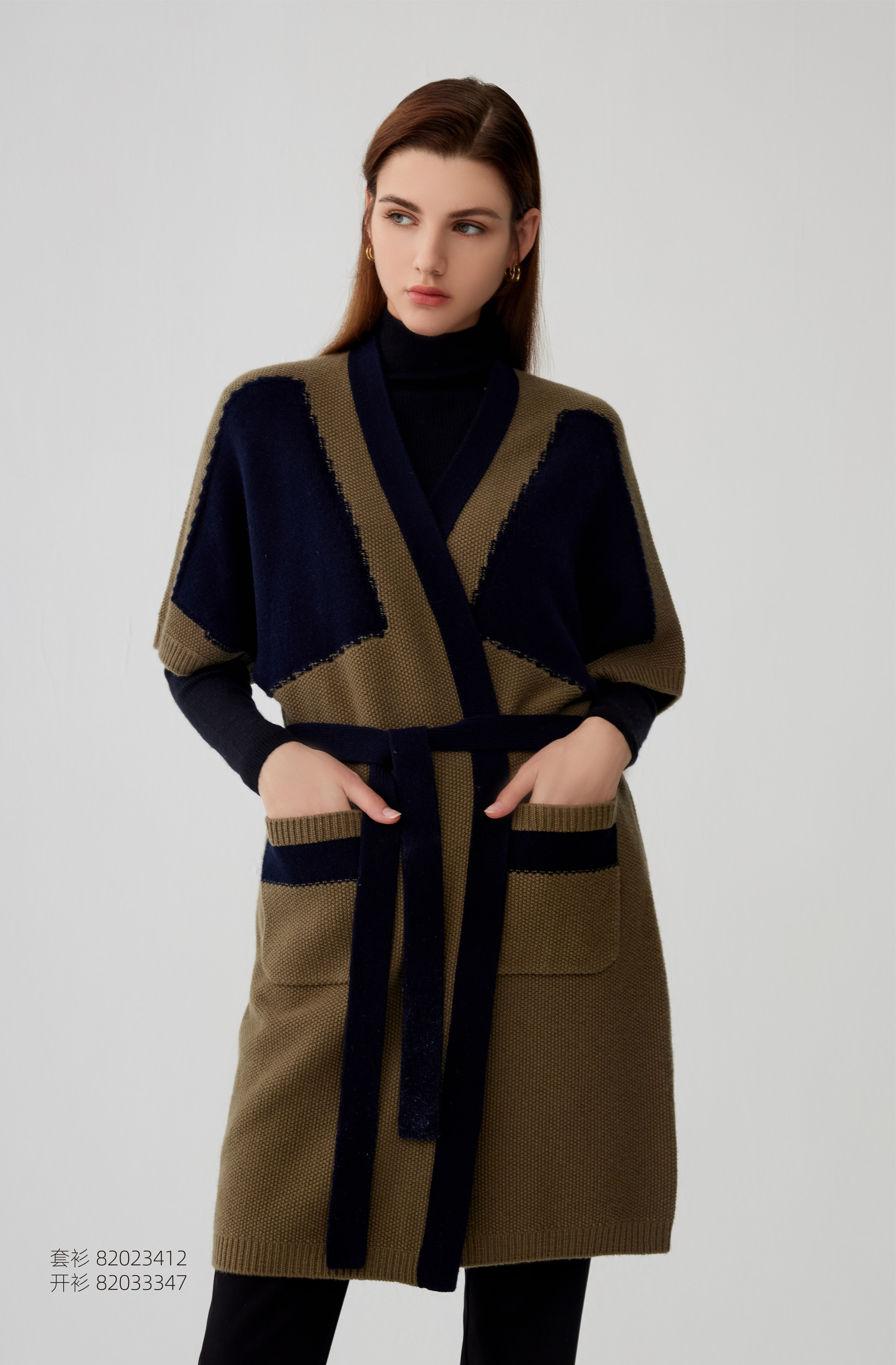 【拼接撞色中长款羊绒开衫外套】羊绒世家秋冬新品女士100%山羊绒V领撞色系带保暖外套