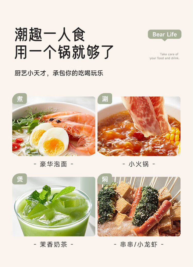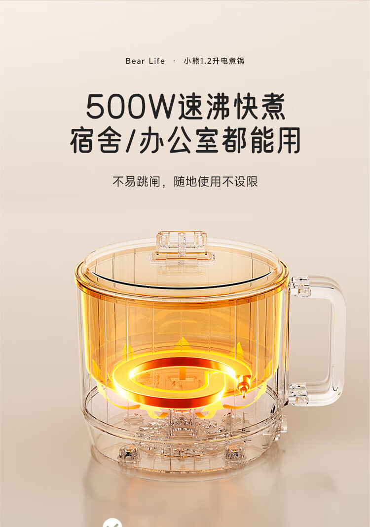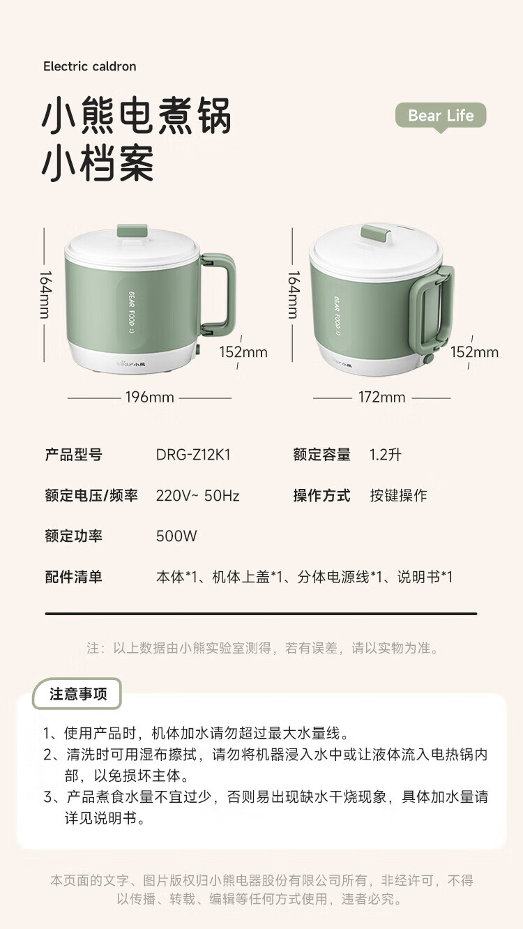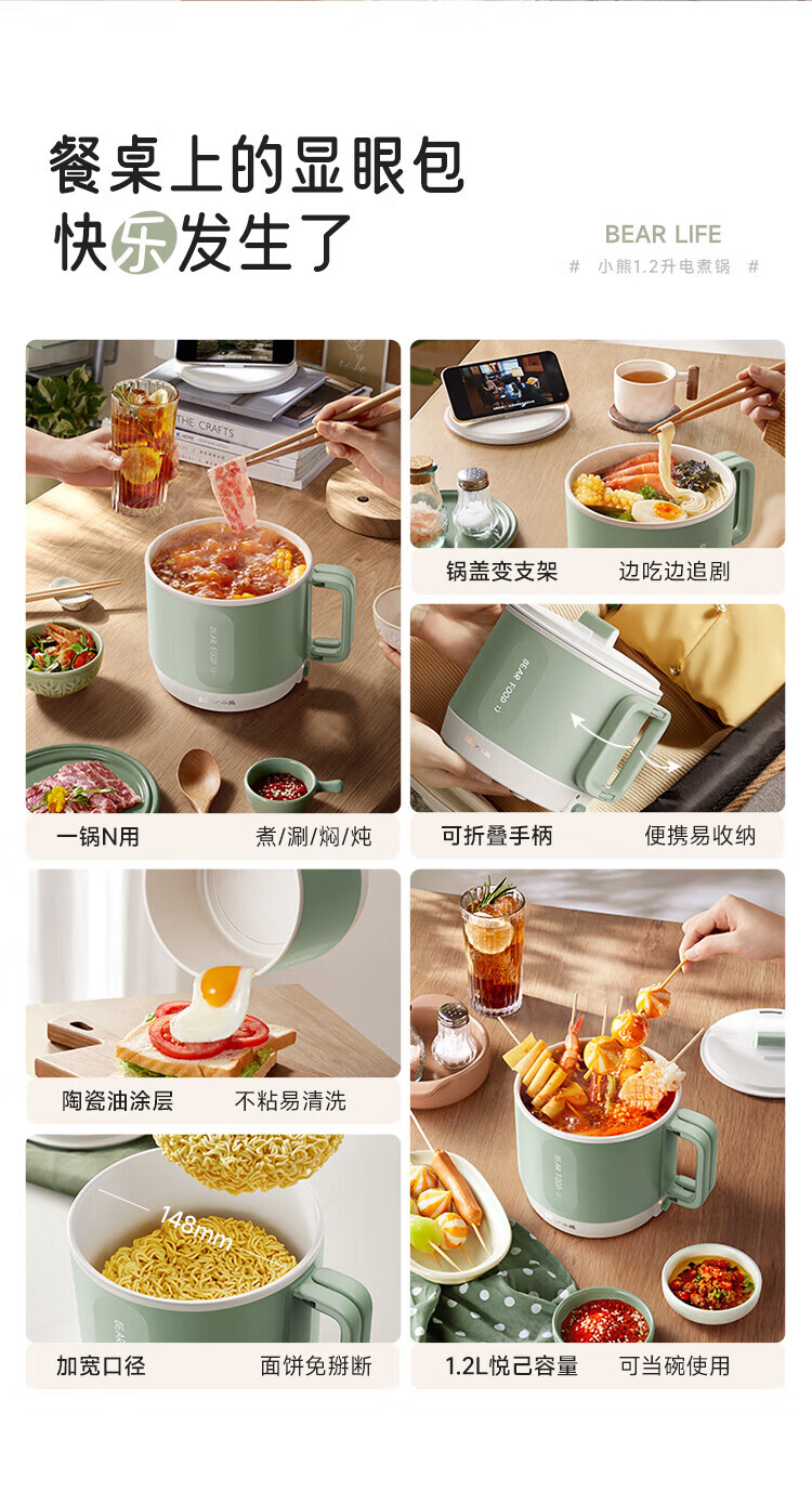 小熊(Bear)小熊(Bear)电煮锅 电热锅 学生宿舍泡面锅 小电锅 电热锅 多功能多用途小煮锅一人食小火锅 DRG-Z12K1煮涮焖炖 1.2L