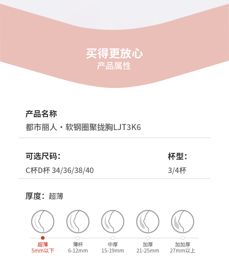 都市丽人少女三步优选AB杯调整型文胸锁边AB:中厚3/4杯少女文胸四排扣无钢圈LJ24A5