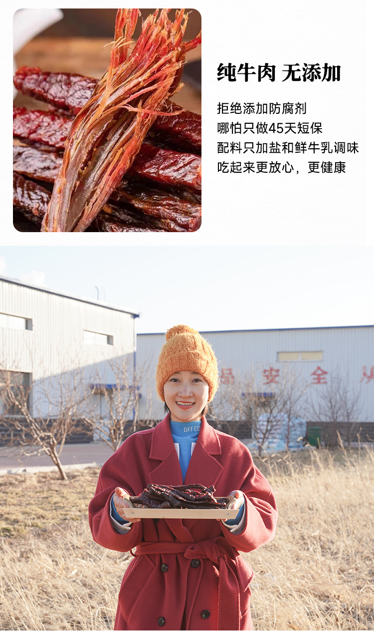 45天短保0添加牛肉干、3斤牛肉才出一斤牛肉干,精选牛后腿肉产自内蒙古农牧业龙头企业