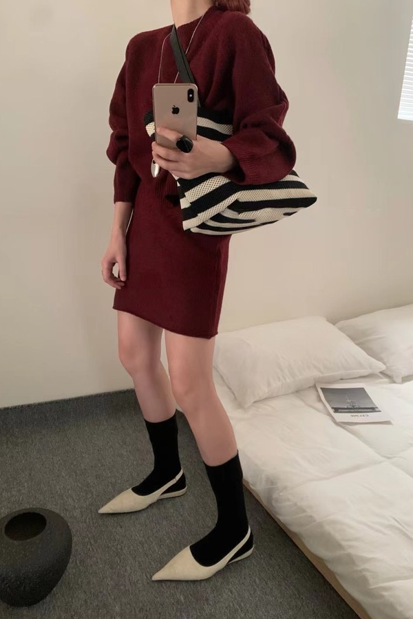 LNNNS 酒红色圆领针织上衣半裙套装 21454