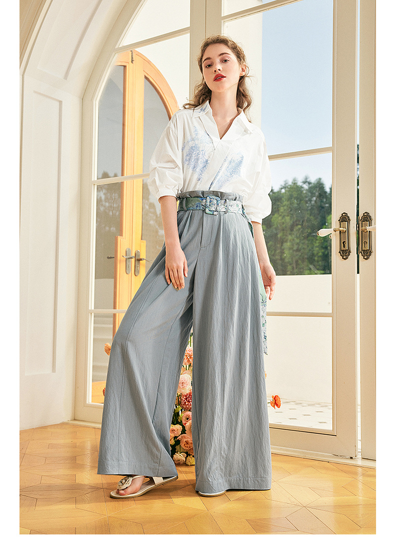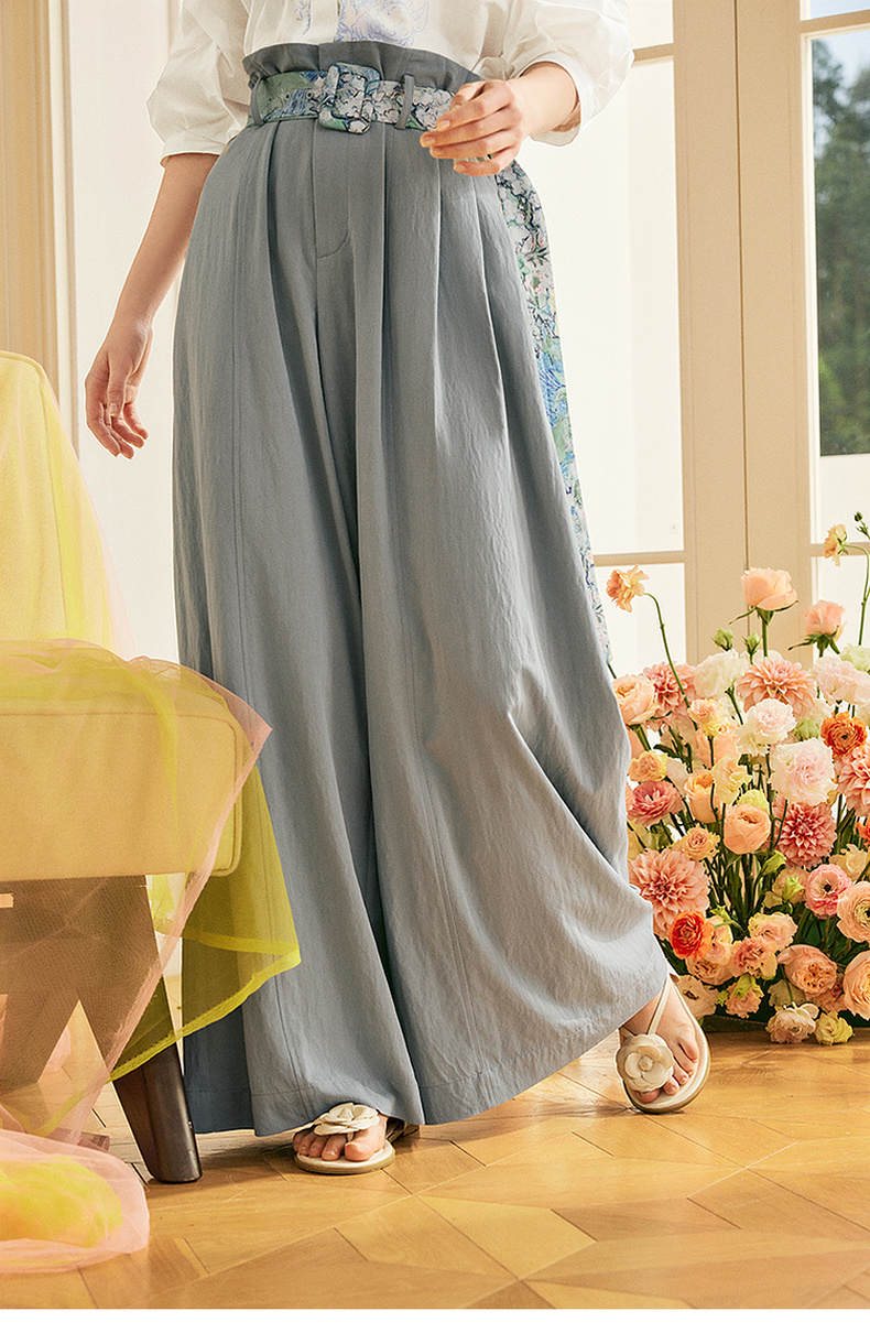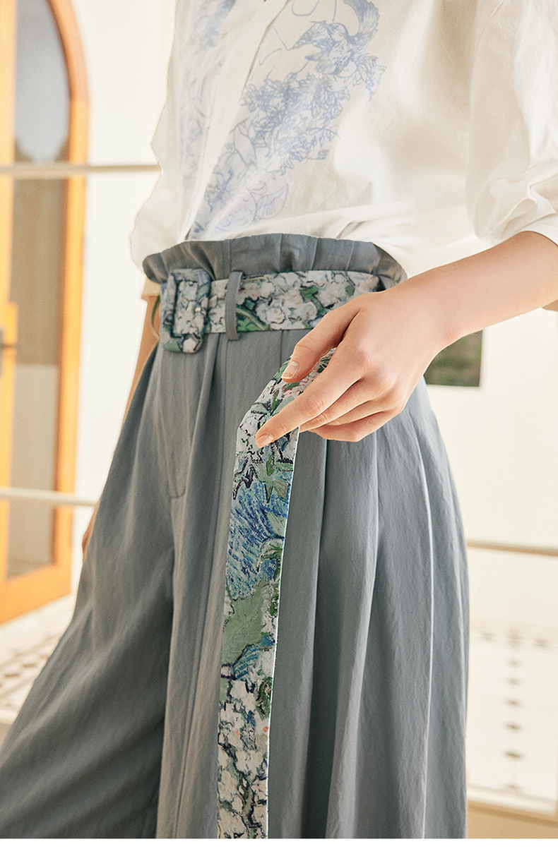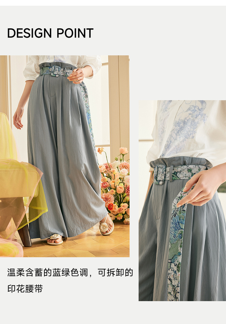 两三事恋野之行2024夏季新款时尚印花腰带不对称裤脚阔腿休闲裤女
