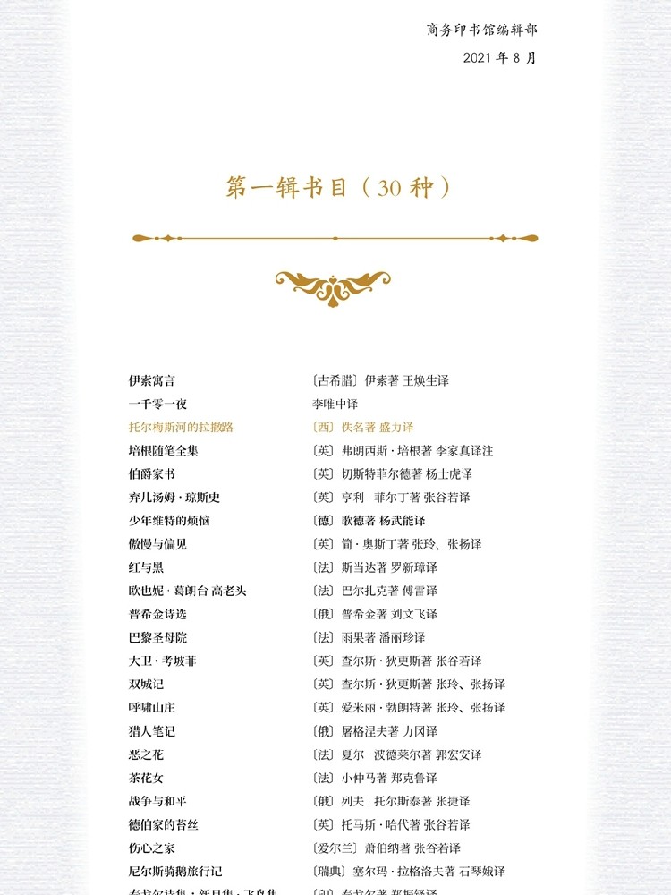 第一辑30种:《伊索寓言》《一千零一夜》《托尔梅斯河的拉撒路》《培根随笔全集》《伯爵家书》《弃儿汤姆•琼斯史》《少年维特的烦恼》《傲慢与偏见》《红与黑》《欧也妮•葛朗台 高老头》《普希金诗选》《巴黎圣母院》《大卫•考坡菲》《双城记》《呼啸山庄》《猎人笔记》《恶之花》《茶花女》《战争与和平》《德伯家的苔丝》《伤心之家》《尼尔斯骑鹅旅行记》《泰戈尔诗集:新月集•飞鸟集》《生命与希望之歌》《孤寂深渊》《泪与笑》《血的婚礼:加西亚•洛尔迦戏剧选》《小王子》《鼠疫》《局外人》。
