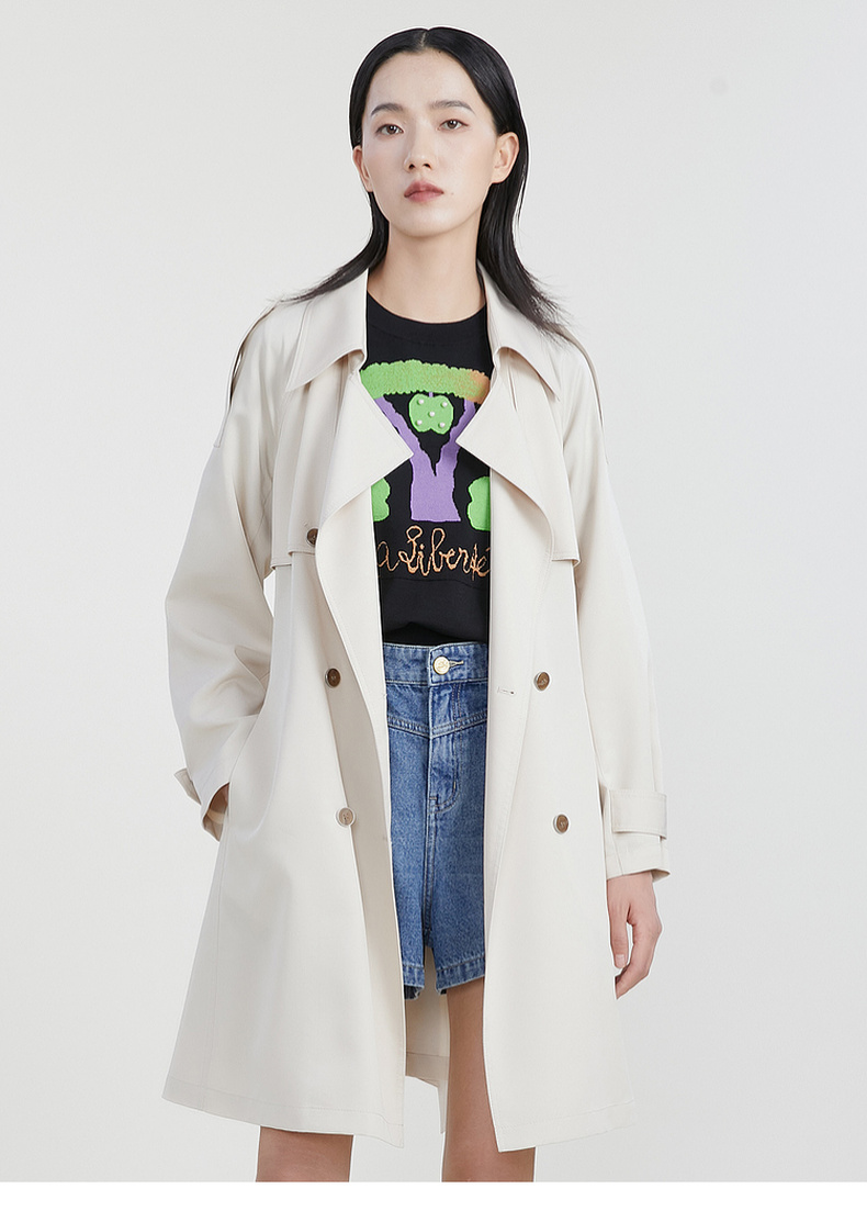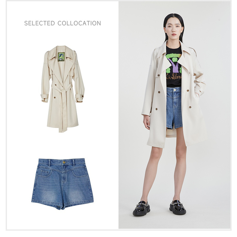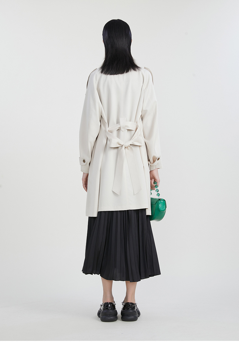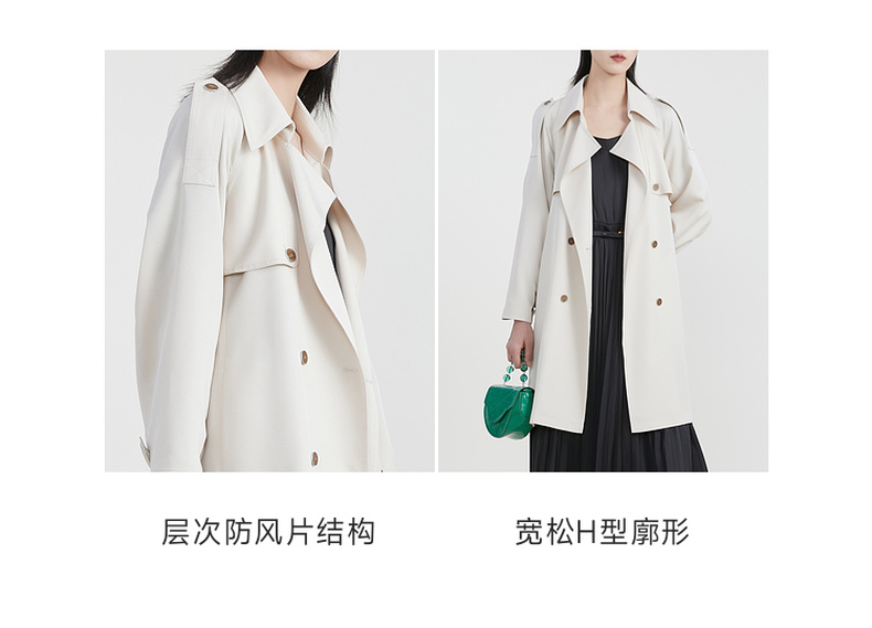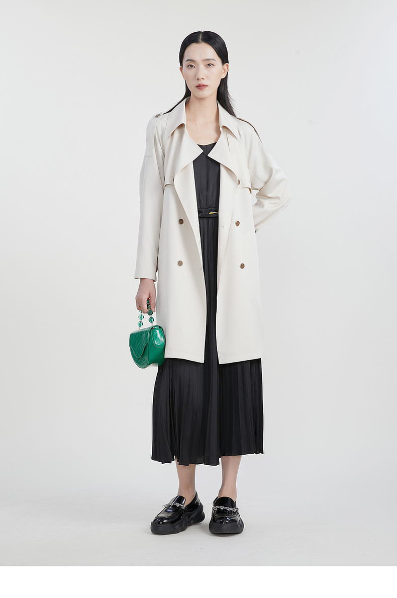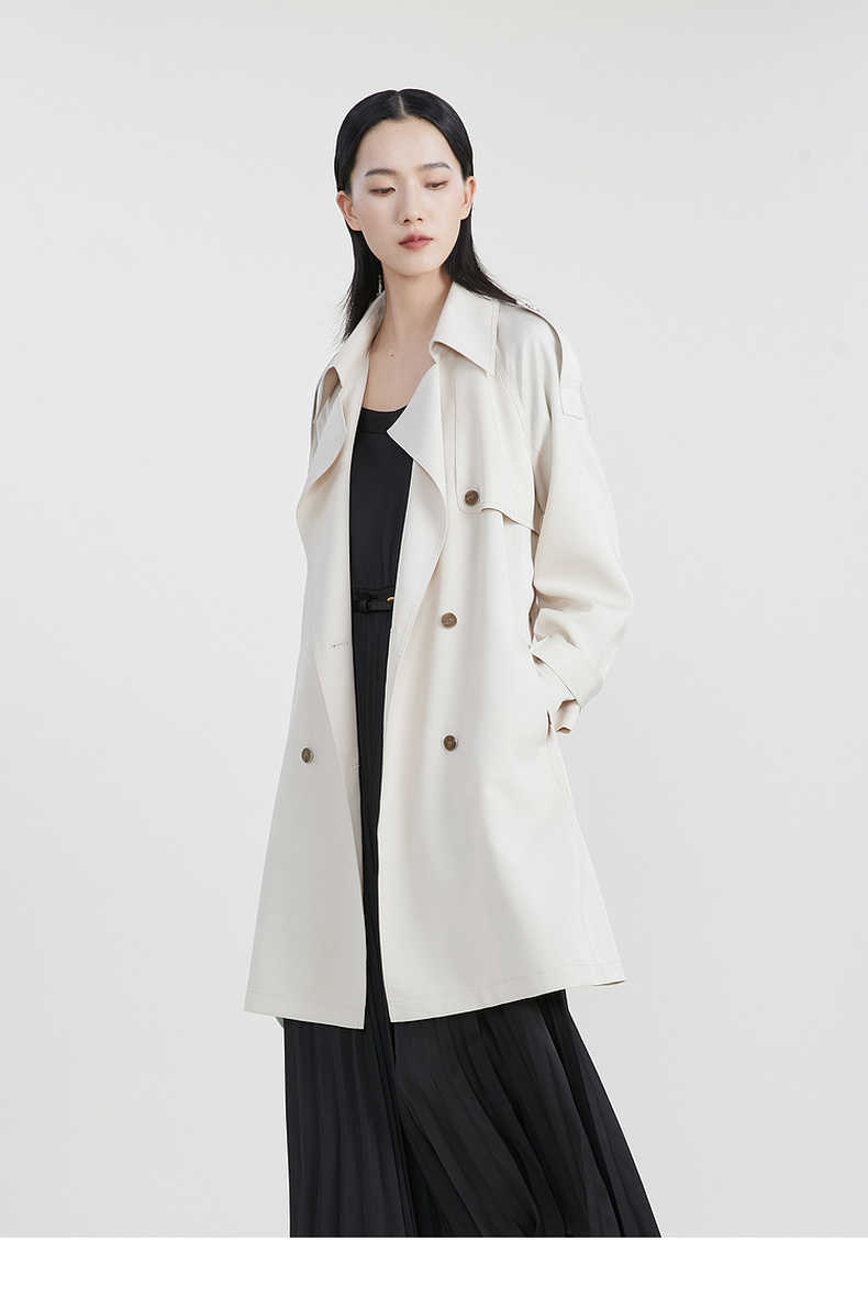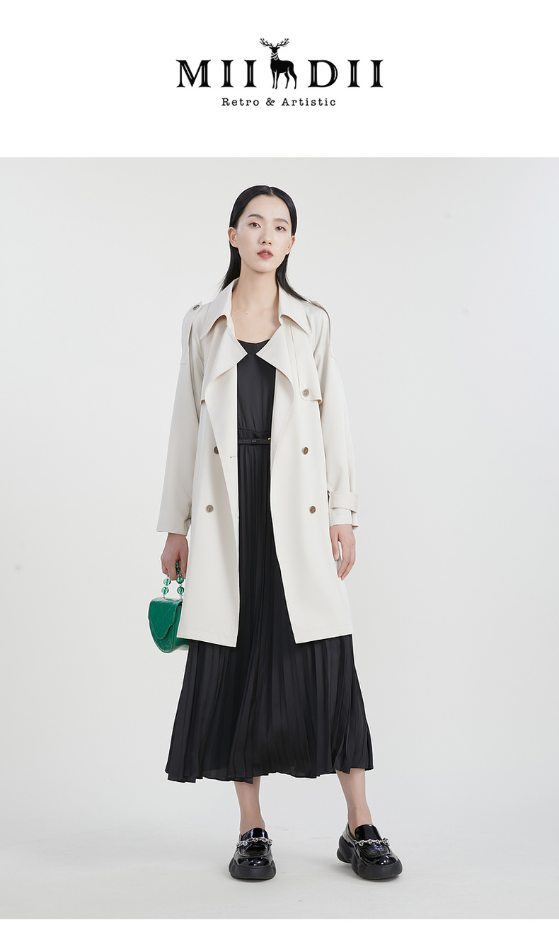 谜底经典中长款风衣女23春季新款西装领纯色双排扣外套231ME0096
