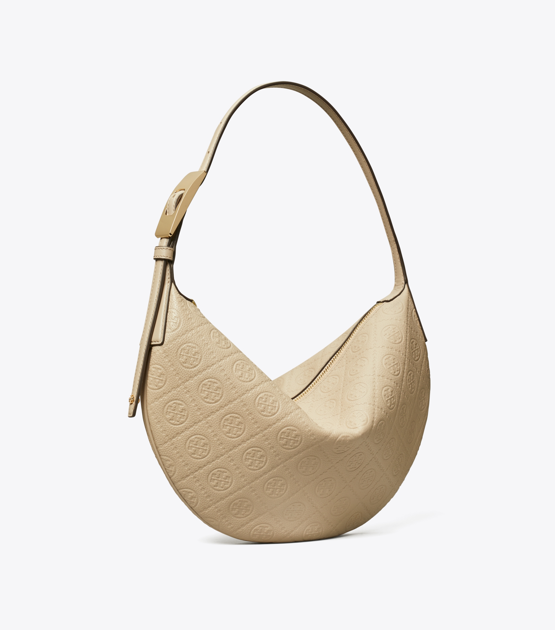 TORY BURCH汤丽柏琦 T MONOGRAM 小号新月包 176303-200灰色 经典TMonogram图案,搭配柔软荔枝纹皮革,魅力隽永又风格独具。新月包兼具流动感和运动感。轮廓弯曲,内部设有拉链口袋。每个细节均经过精心考究,尤其注重功能性与多样性的结合。
