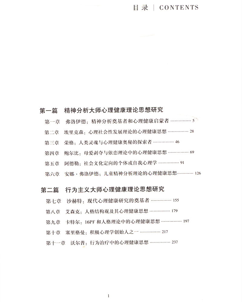 根据心理学科发展的内在逻辑,本书纵向上选择18位心理健康研究术有专攻的心理学大师为“目”,横向上则以精神分析、行为主义、人本与认知主义学派为“纲”,“纲举目张”。从精神分析学派考察,包括弗洛伊德、埃里克森、荣格、鲍尔比、阿德勒和安娜•弗洛伊德六人,他们对心理健康研究及其心理治疗的开拓性贡献,可圈可点;从行为主义学派考量,包括沙赫特、艾森克、卡特尔、塞里格曼和沃尔普五人,他们在心理健康及其行为矫正、心理治疗等方面发挥了举足轻重的作用,至今仍余音绕梁;从人本与认知主义分析,包括罗杰斯、马斯洛、奥尔波特、路特、伯科维茨、詹尼斯和拉扎鲁斯七人,他们以新的理论观点和丰富的实验成果为心理健康创新性研究打开了一扇新的“窗户”。本书各章主要内容就此定位在“大师生平•学术背景•理论解析•思想评价”上,旨在向20世纪最具影响力的18位心理健康大师学习、致敬,试图从大师们的著述和研究中,和读者一起寻找曾经失去的“经典家园!”