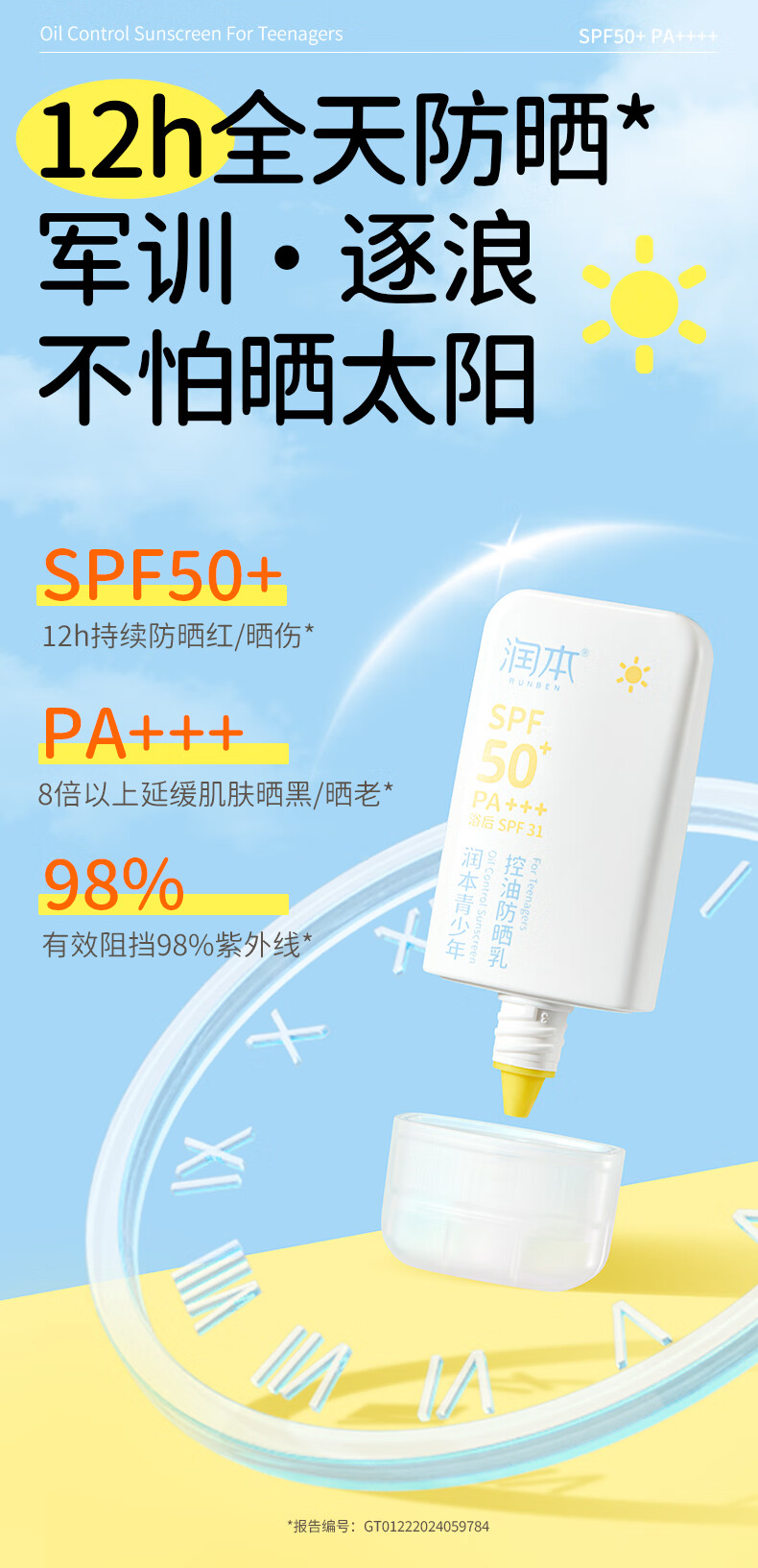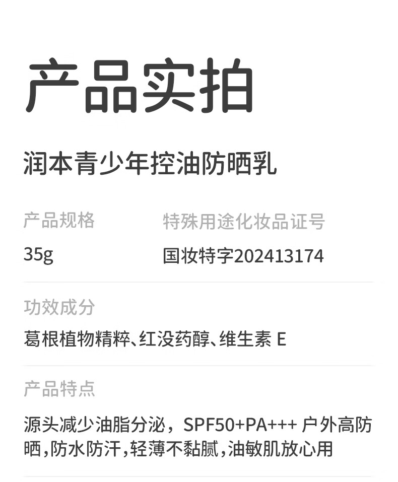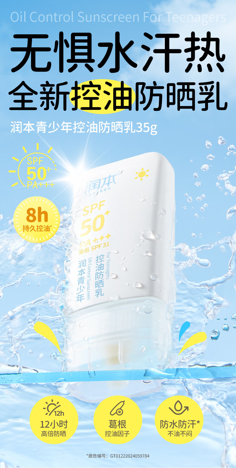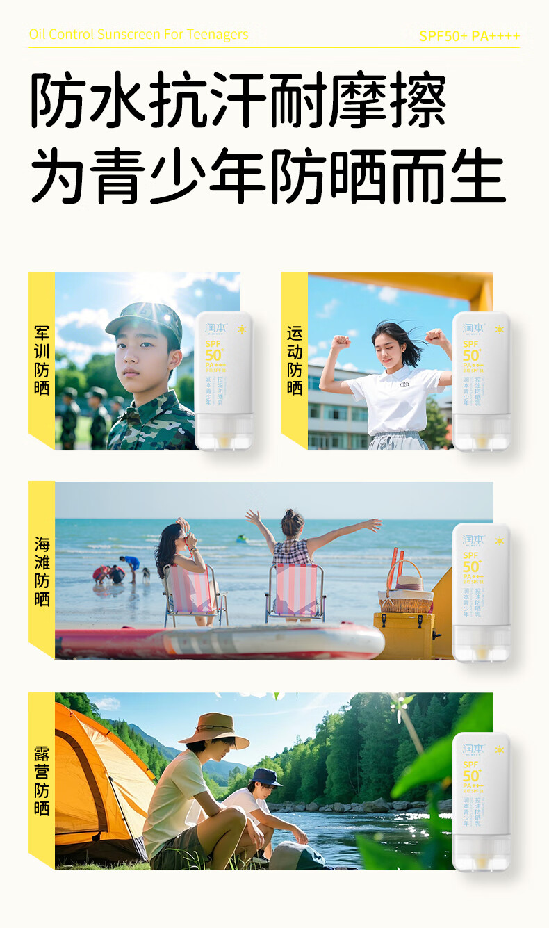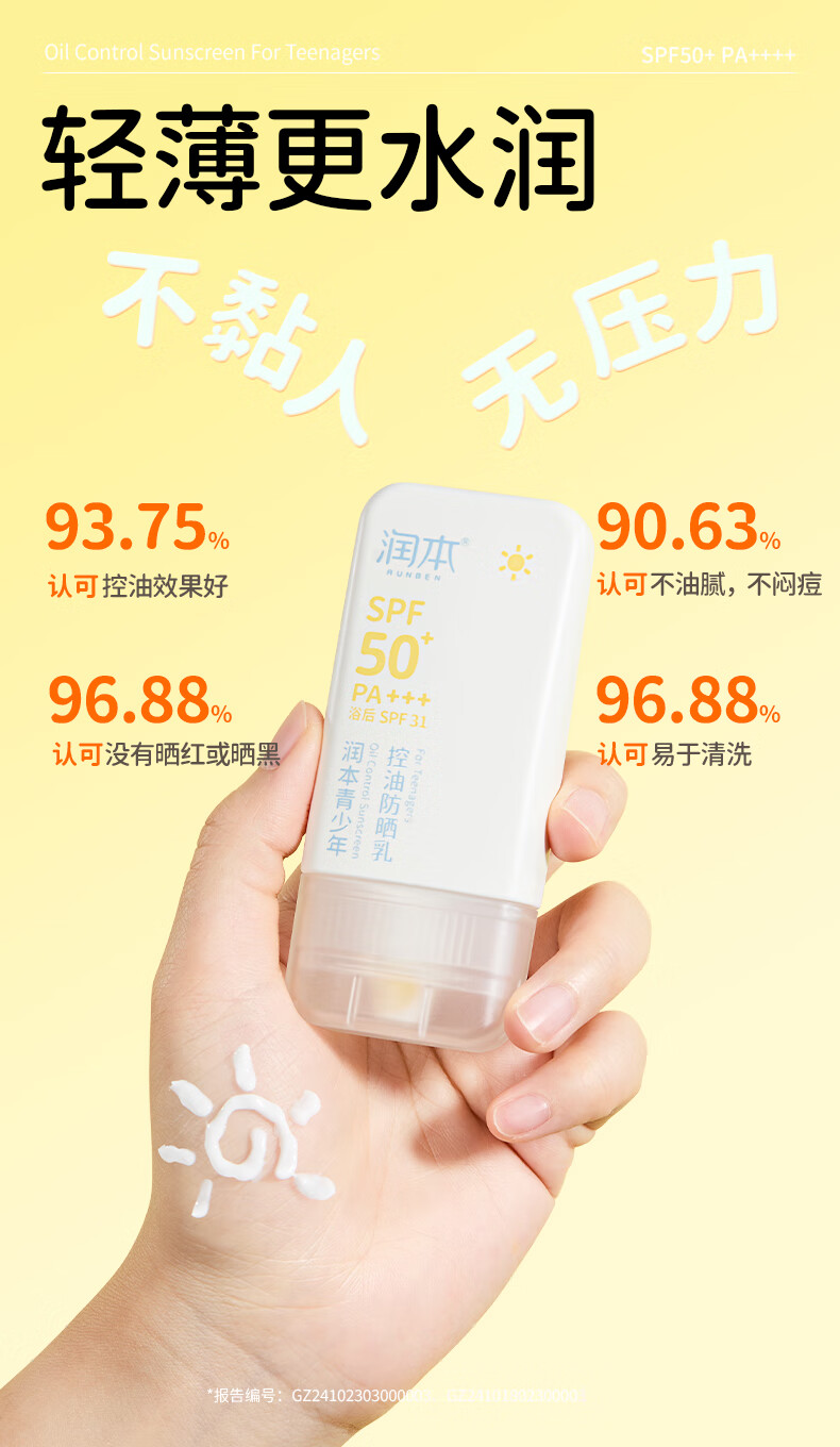 润本(RUNBEN)青少年控油防晒乳35g学生党专用海滩军训防水防汗防晒SPF50+PA+++