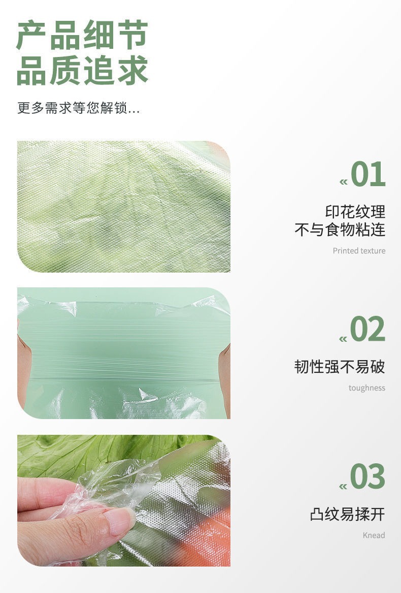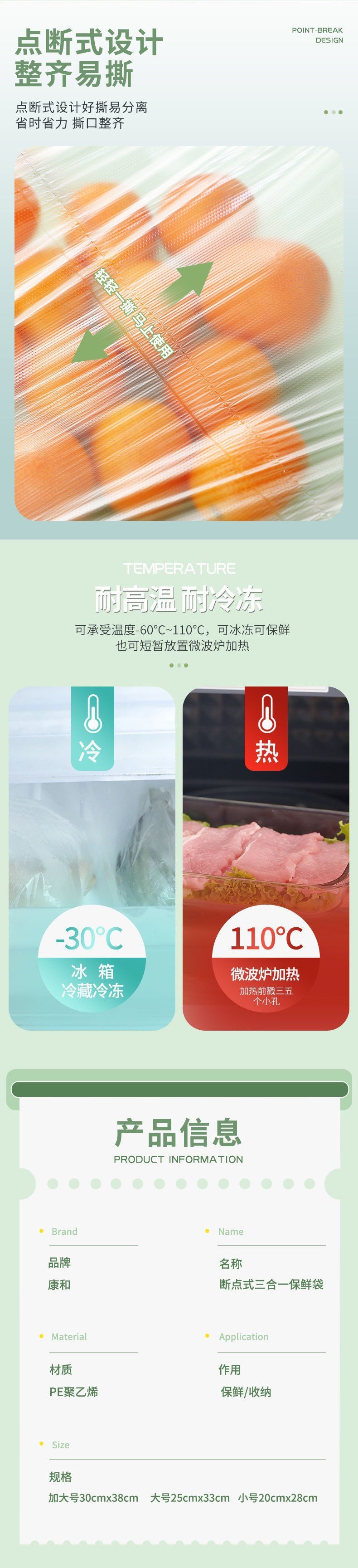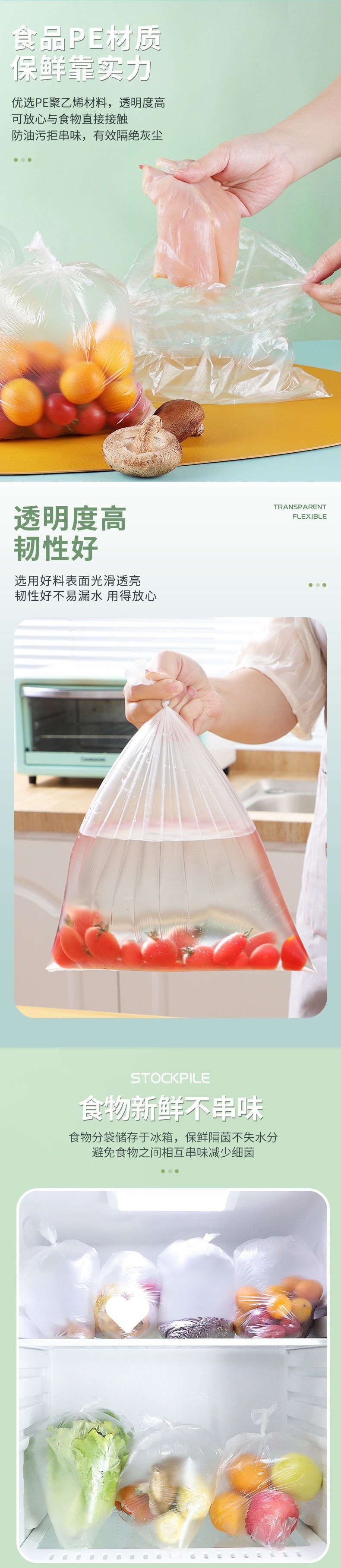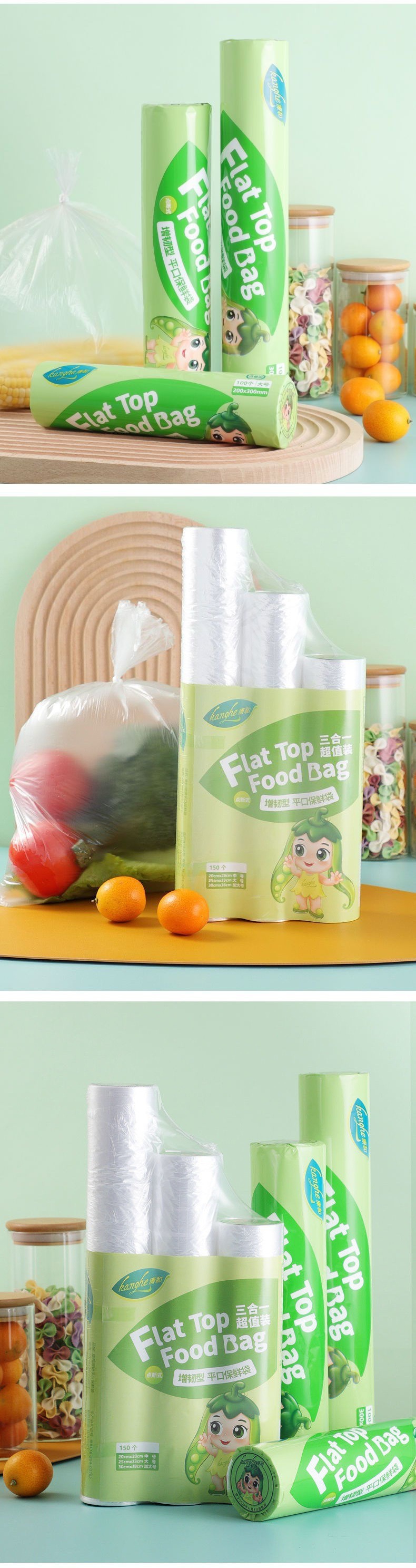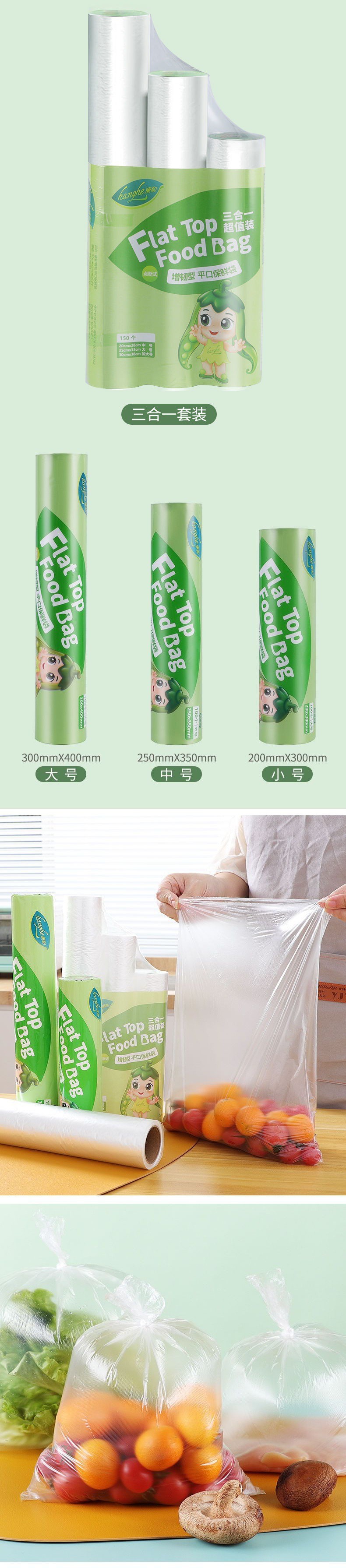 「3卷装!三合一」 康和平口保鲜袋 居家日用PE加厚食品包装连卷断点式手撕袋子厨房用品