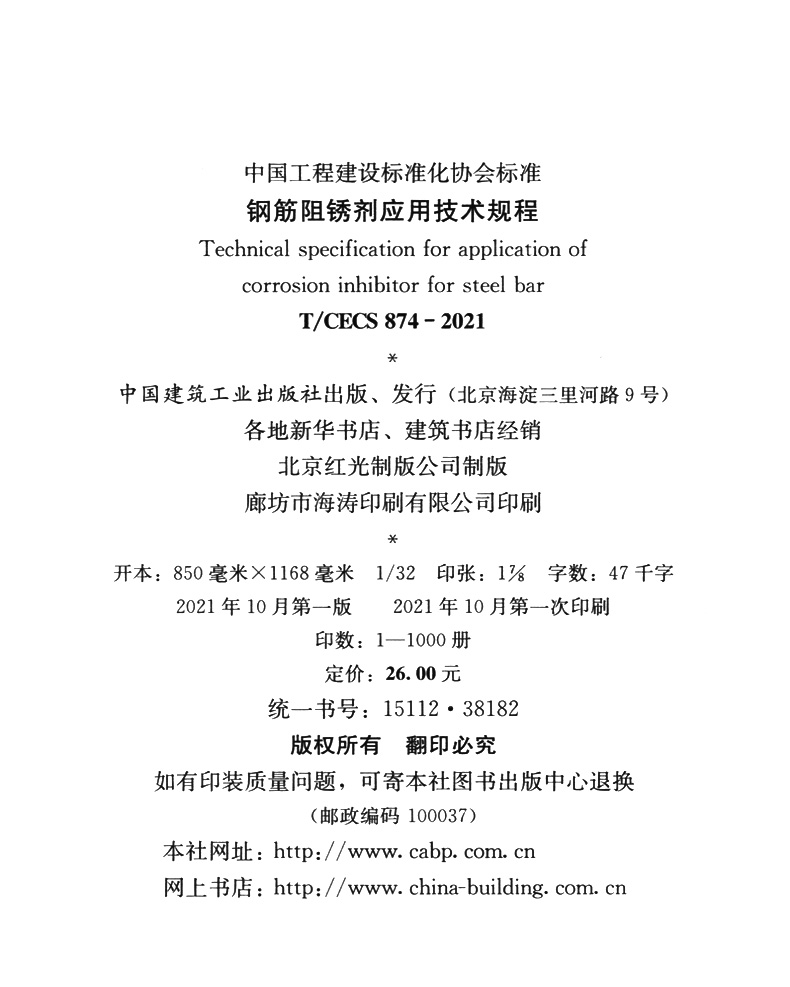 书名:T/CECS874-2021钢筋阻锈剂应用技术规程