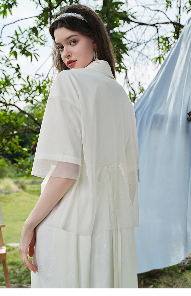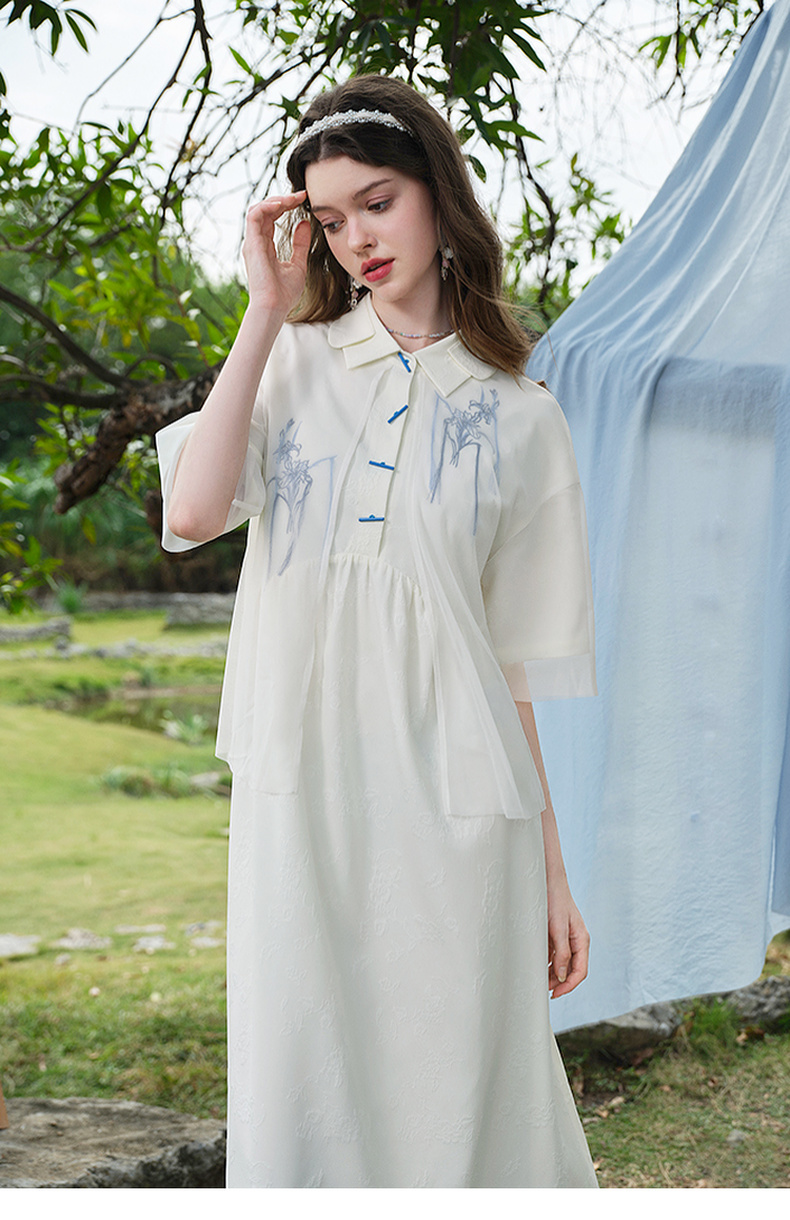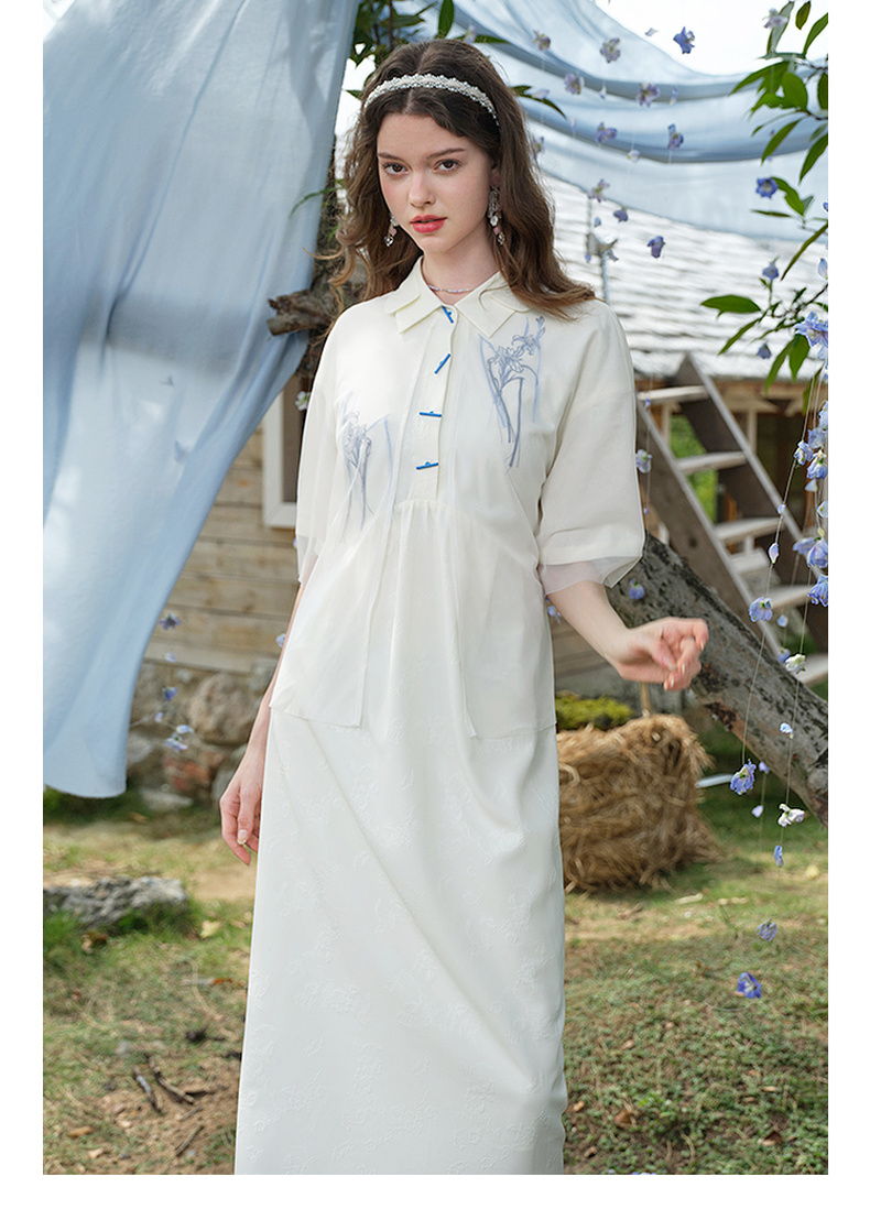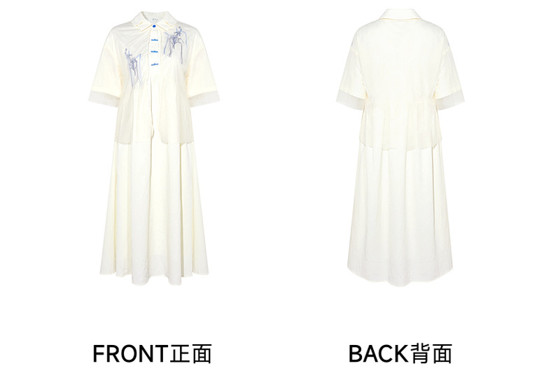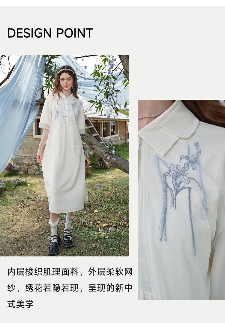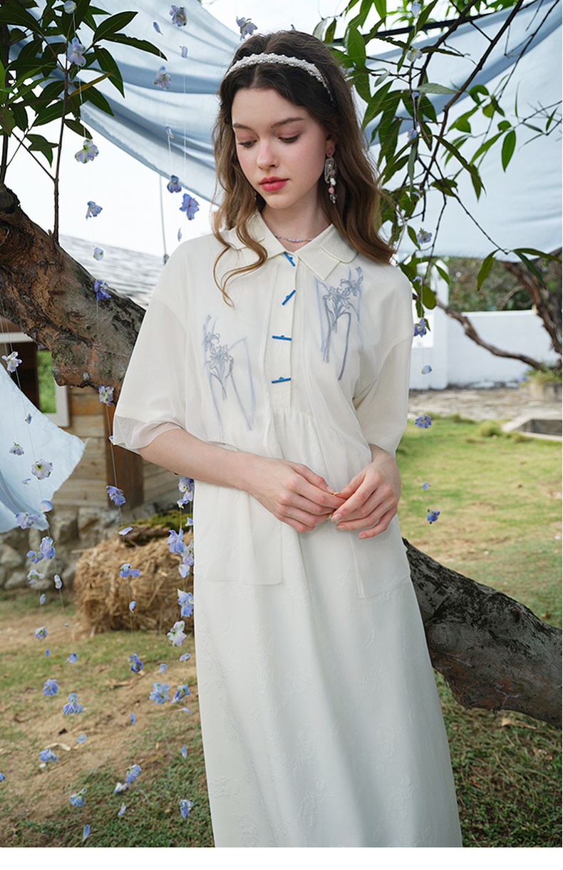 两三事月下白茶2025春新款网纱拼接流苏绣花撞色纽扣衬衫裙连衣裙