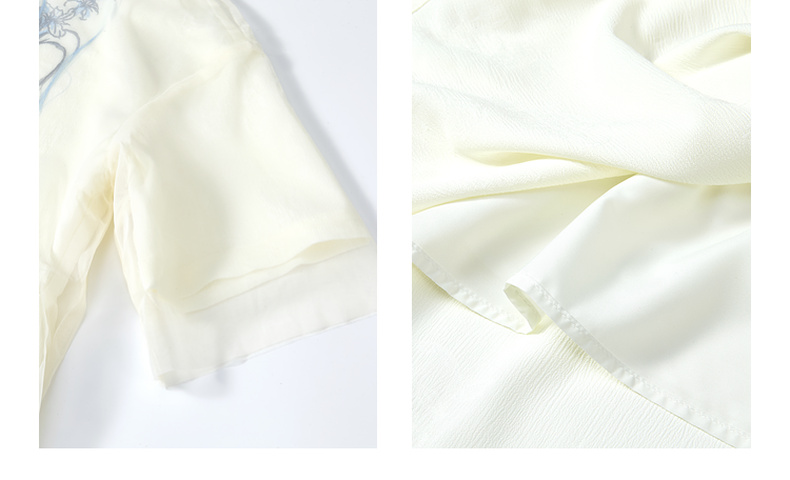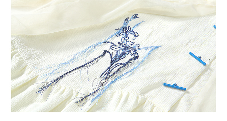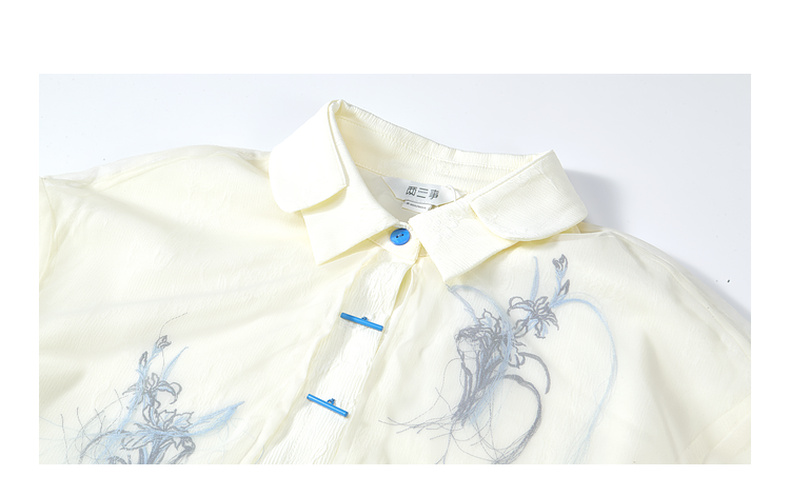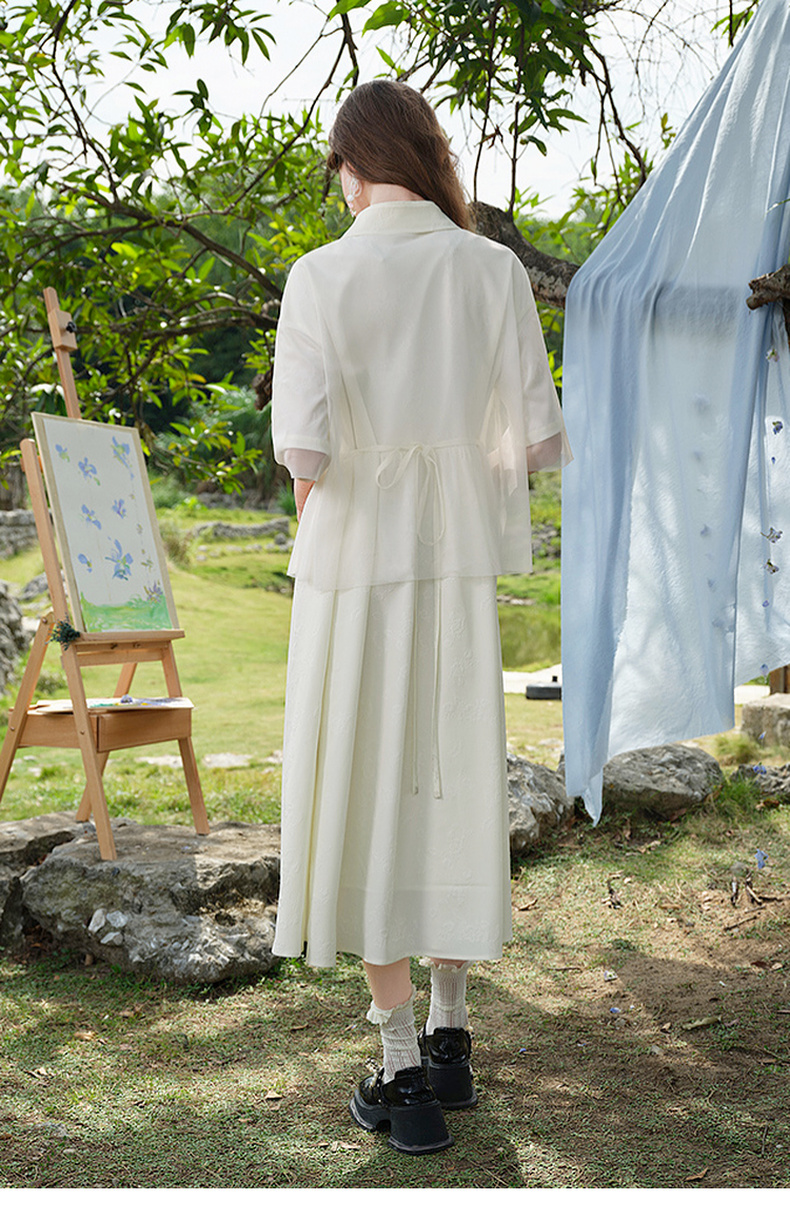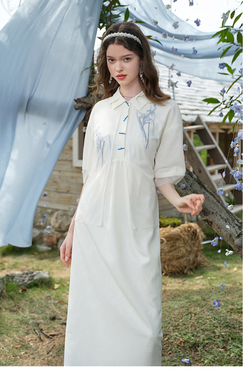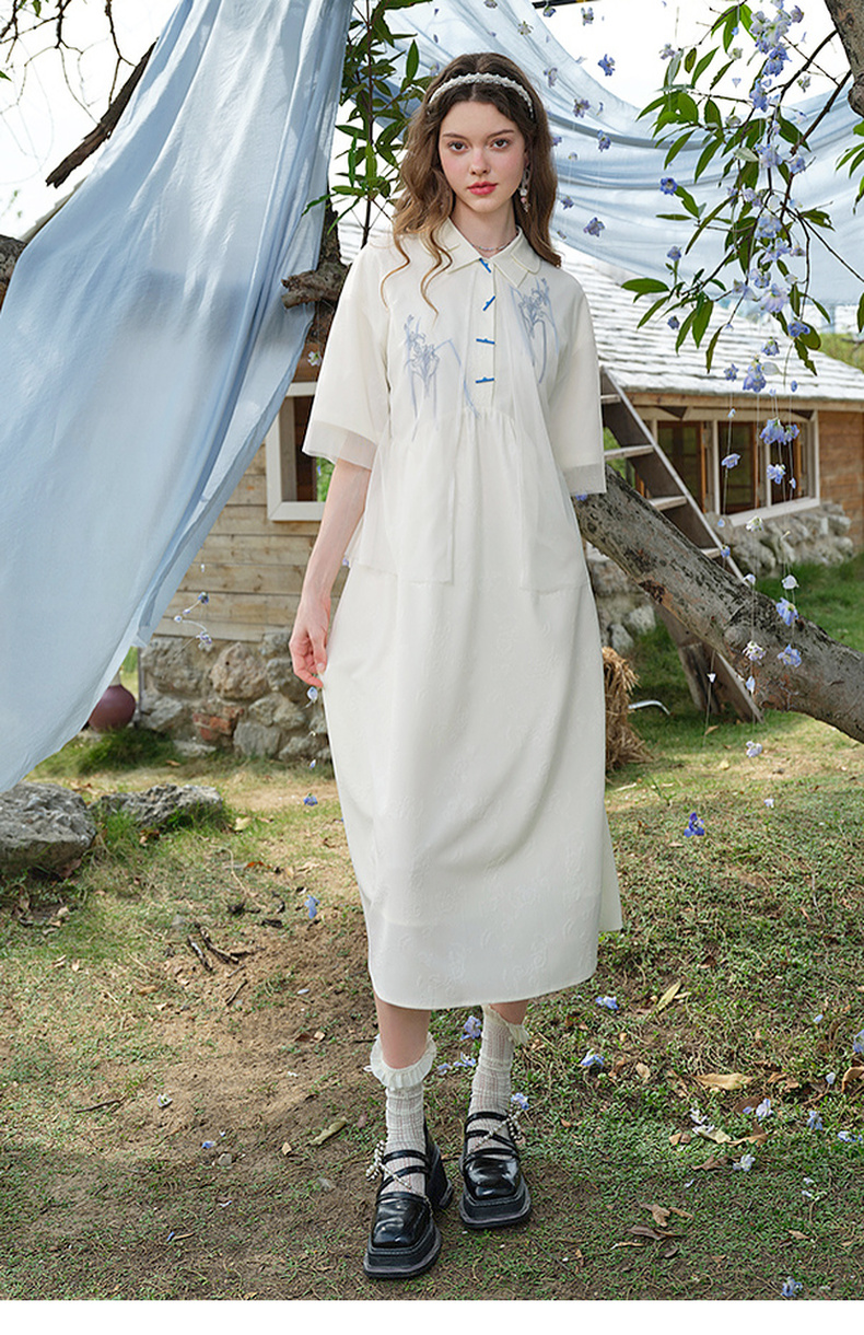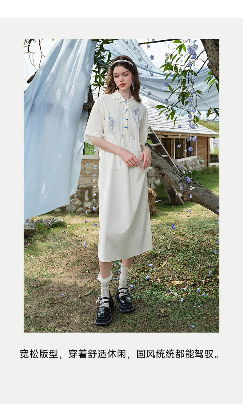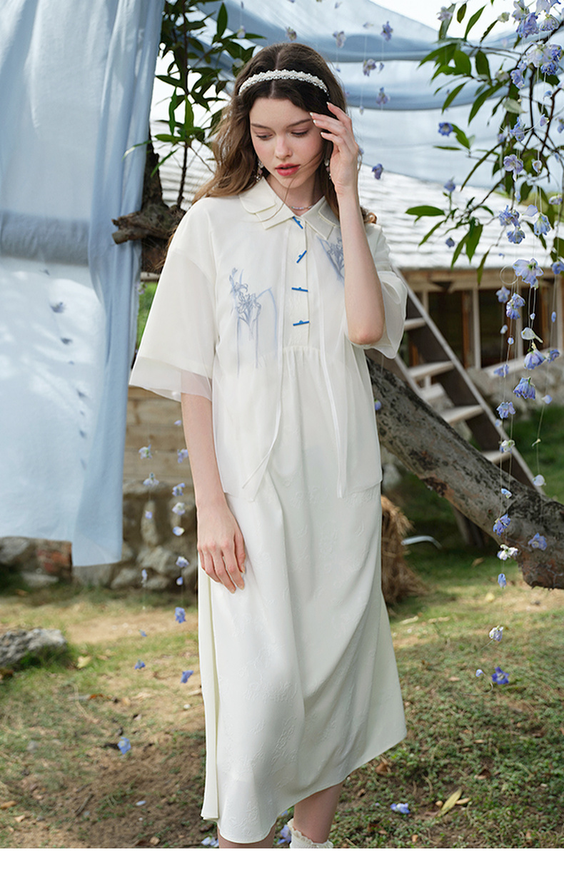 两三事月下白茶2025春新款网纱拼接流苏绣花撞色纽扣衬衫裙连衣裙