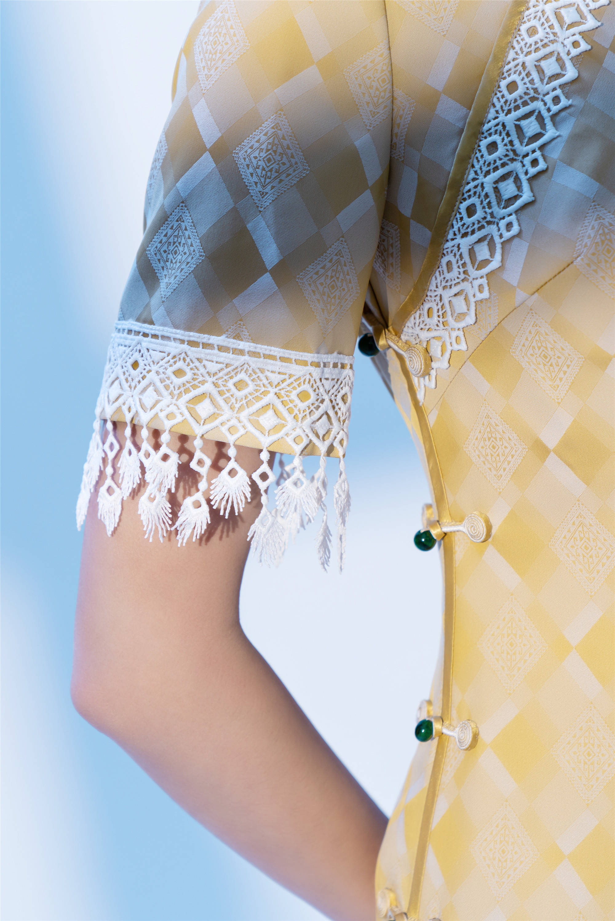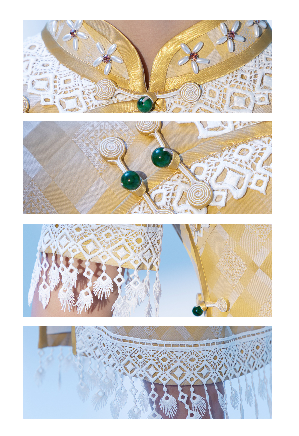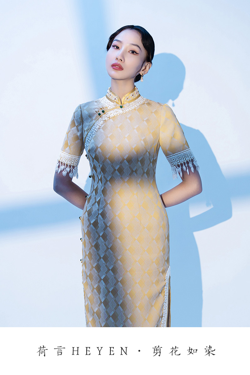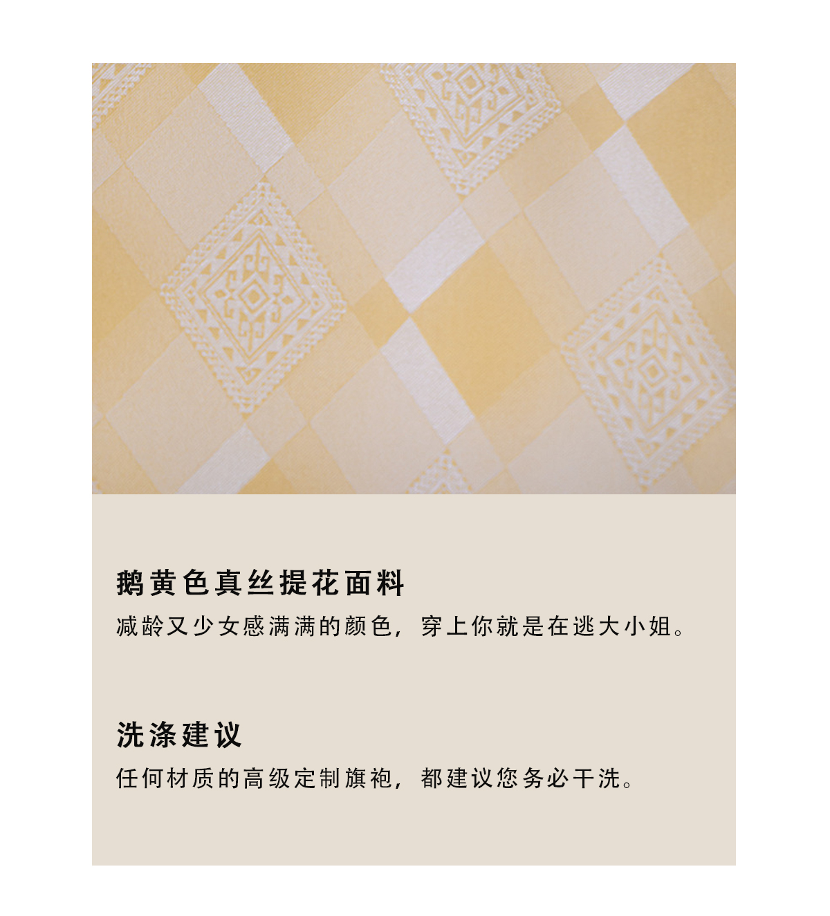 荷言HEYEN 剪花如染【明星同款】鹅黄色几何提花面料+立领设计珍珠镶嵌花样式+经典一字扣绿石搭配+蕾丝流苏绲边+手工钉珠设计