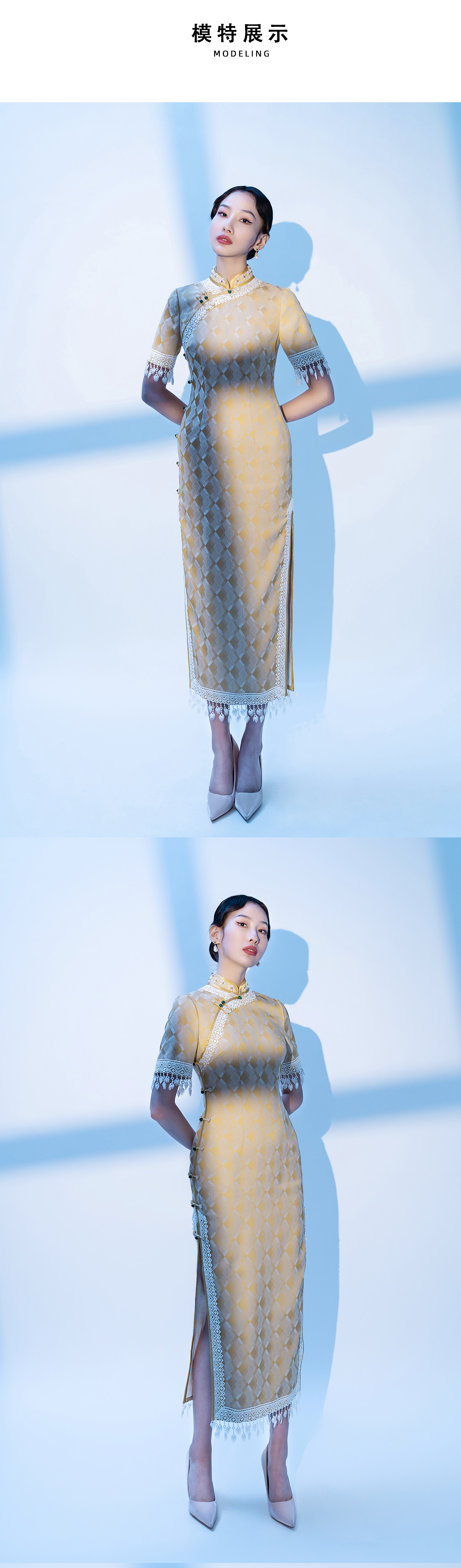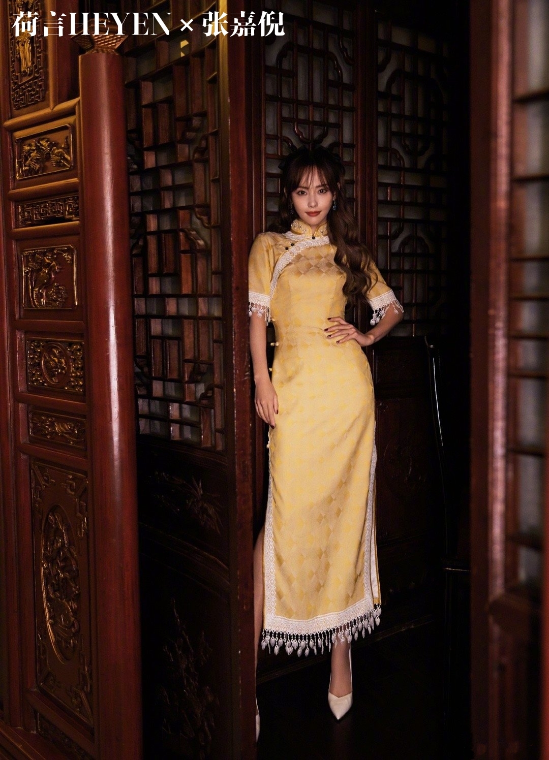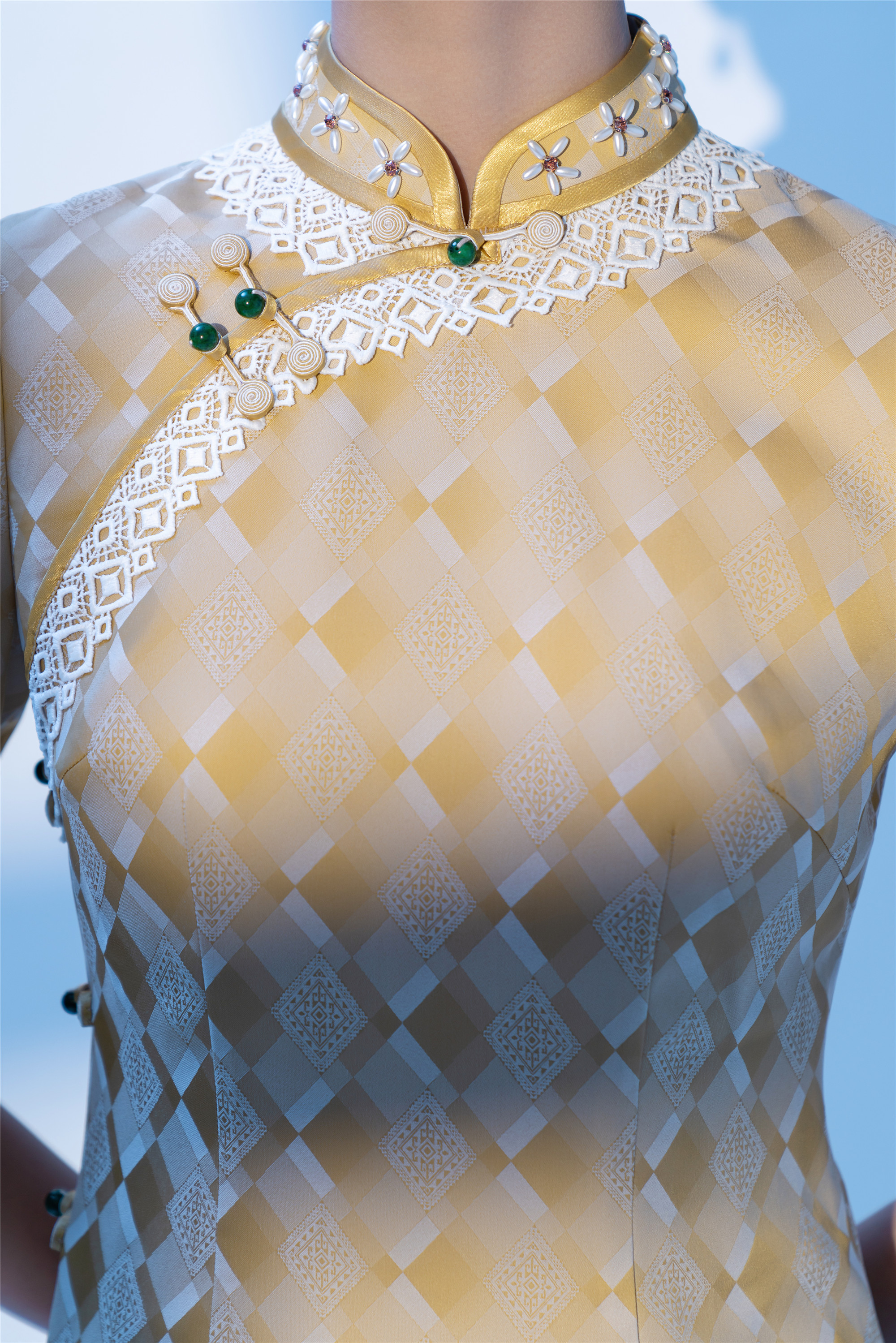 荷言HEYEN 剪花如染【明星同款】鹅黄色几何提花面料+立领设计珍珠镶嵌花样式+经典一字扣绿石搭配+蕾丝流苏绲边+手工钉珠设计