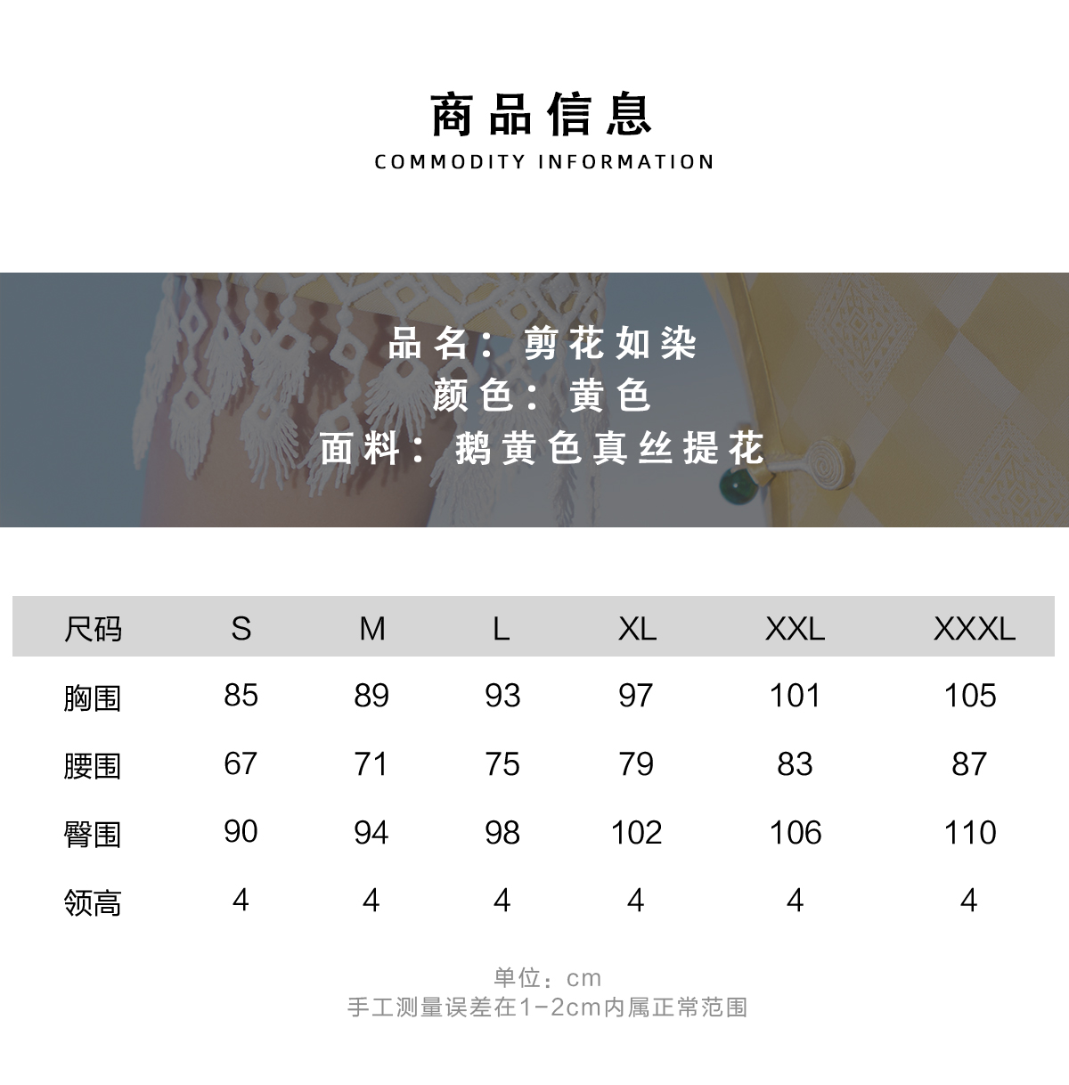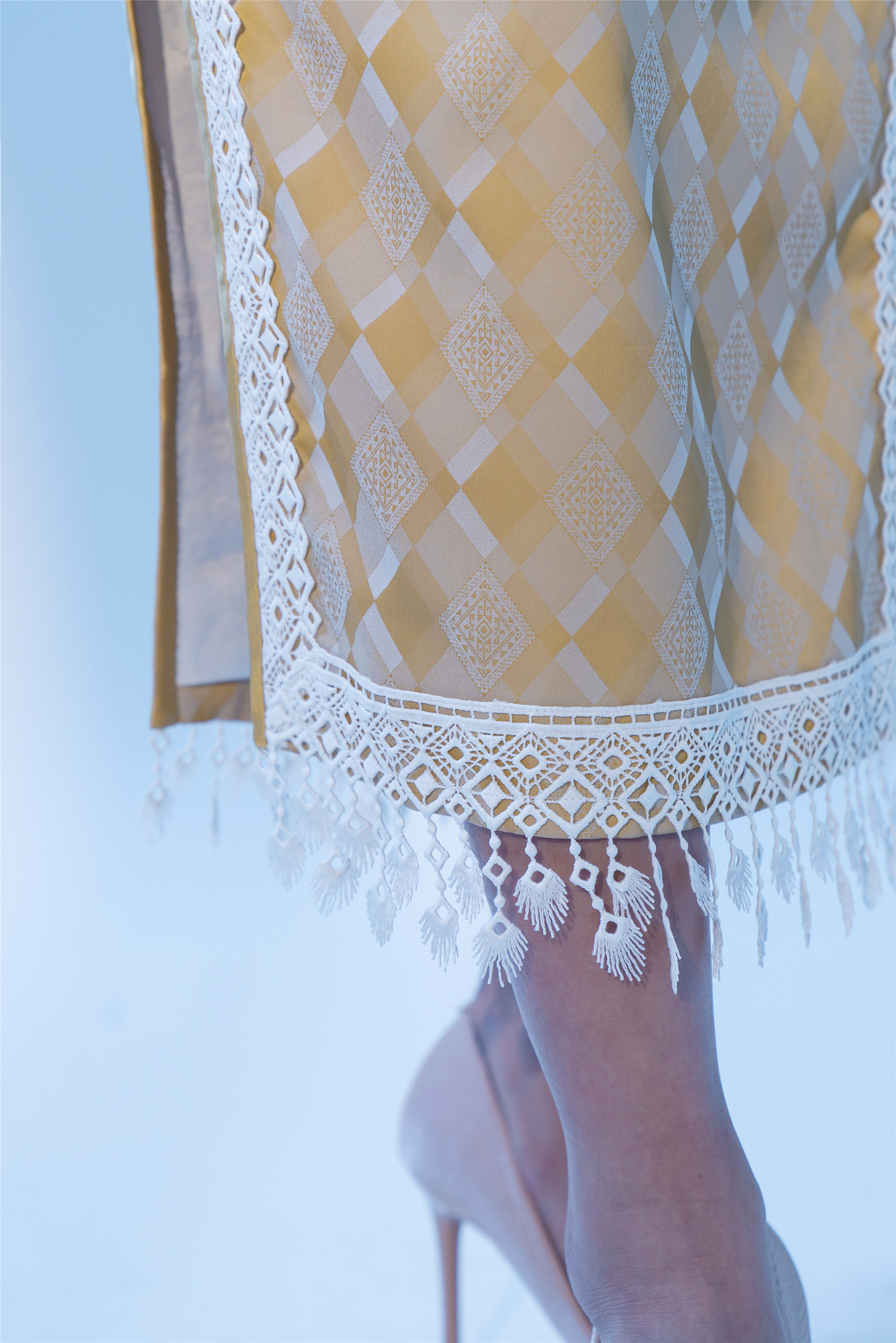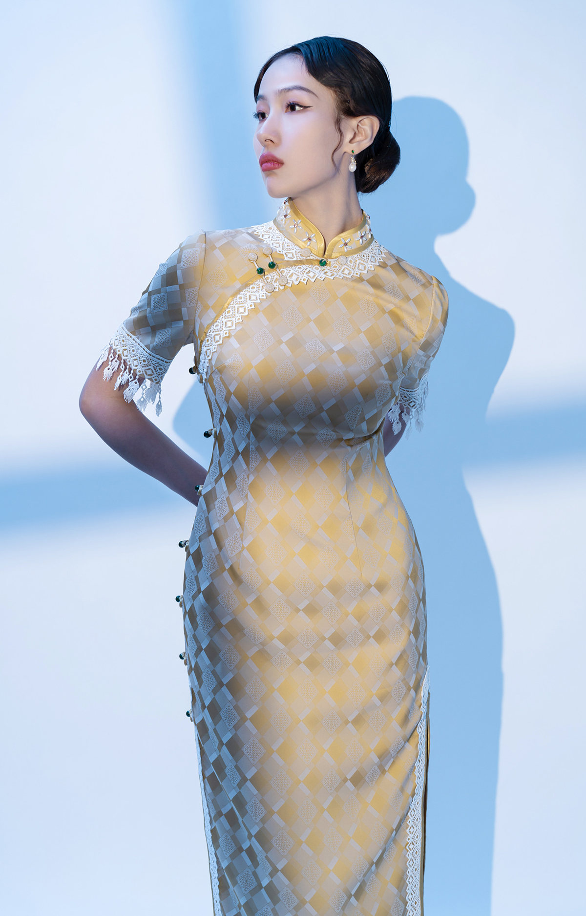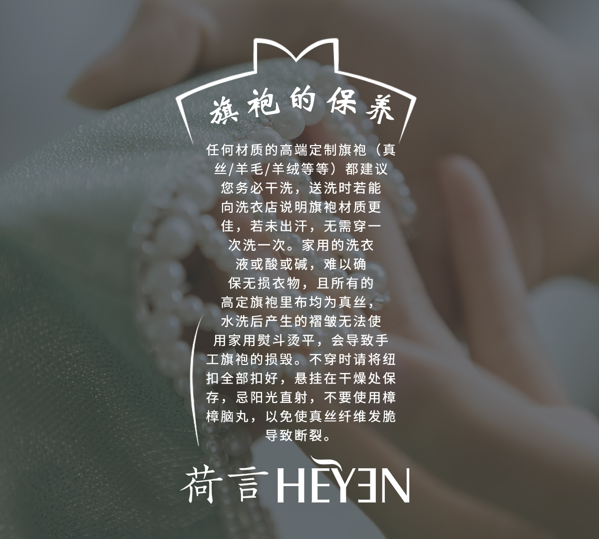 荷言HEYEN 剪花如染【明星同款】鹅黄色几何提花面料+立领设计珍珠镶嵌花样式+经典一字扣绿石搭配+蕾丝流苏绲边+手工钉珠设计