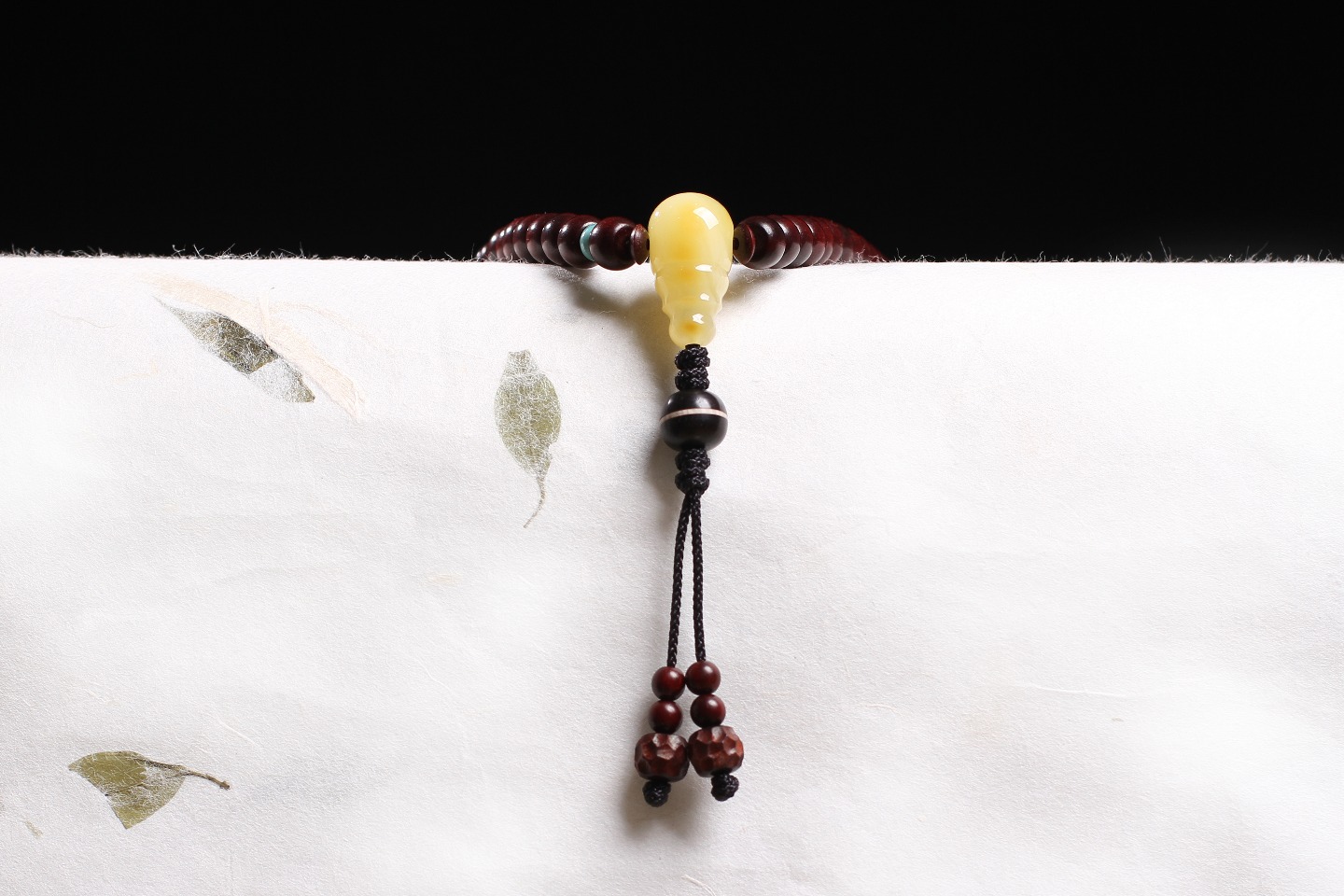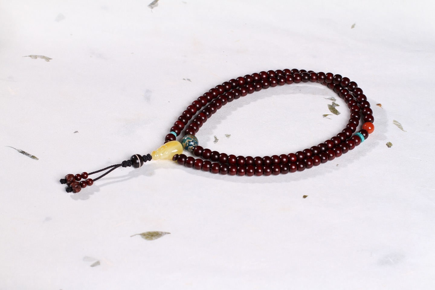 搭配:印度小叶紫檀为主,搭配蜜蜡三通,大漆,黑檀双色珠,南红、天河石点缀。