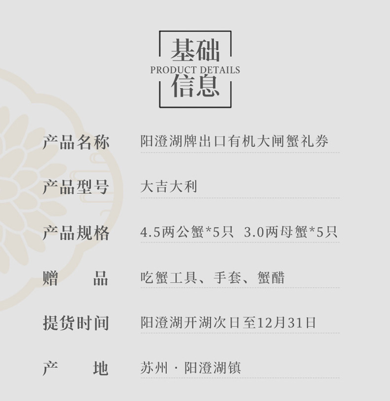 【礼券】阳澄湖牌大闸蟹2888型大吉大利4.5两公*5+3.0两母*5 商品图5