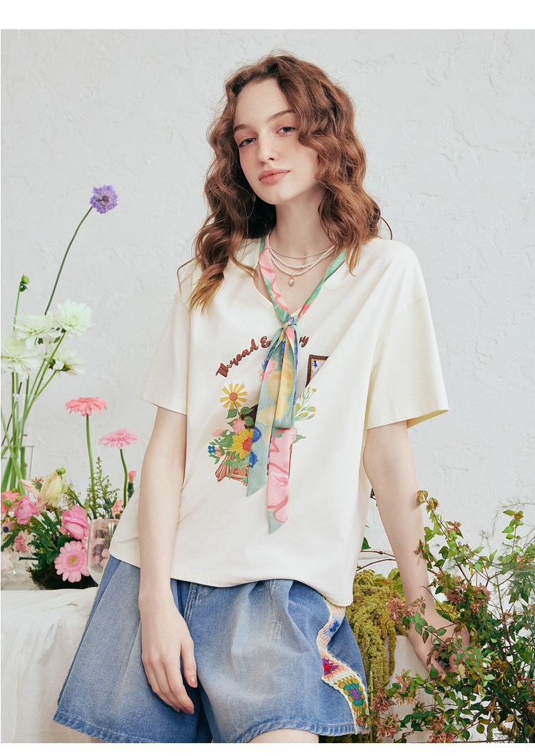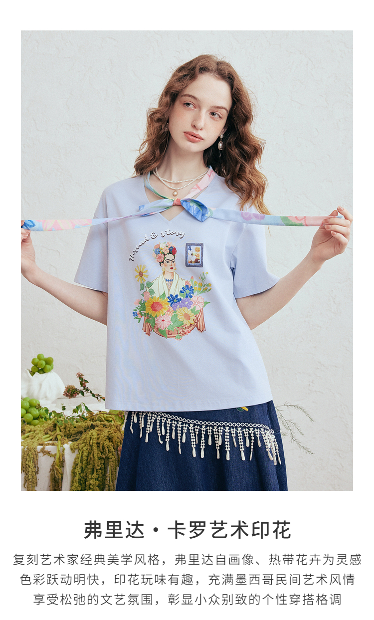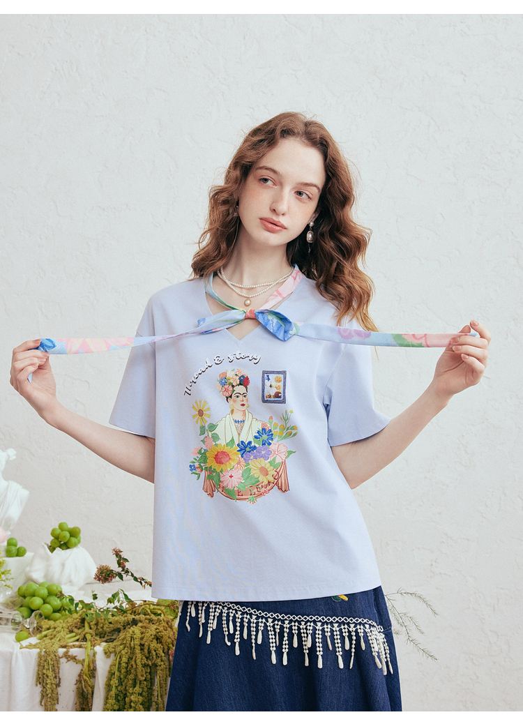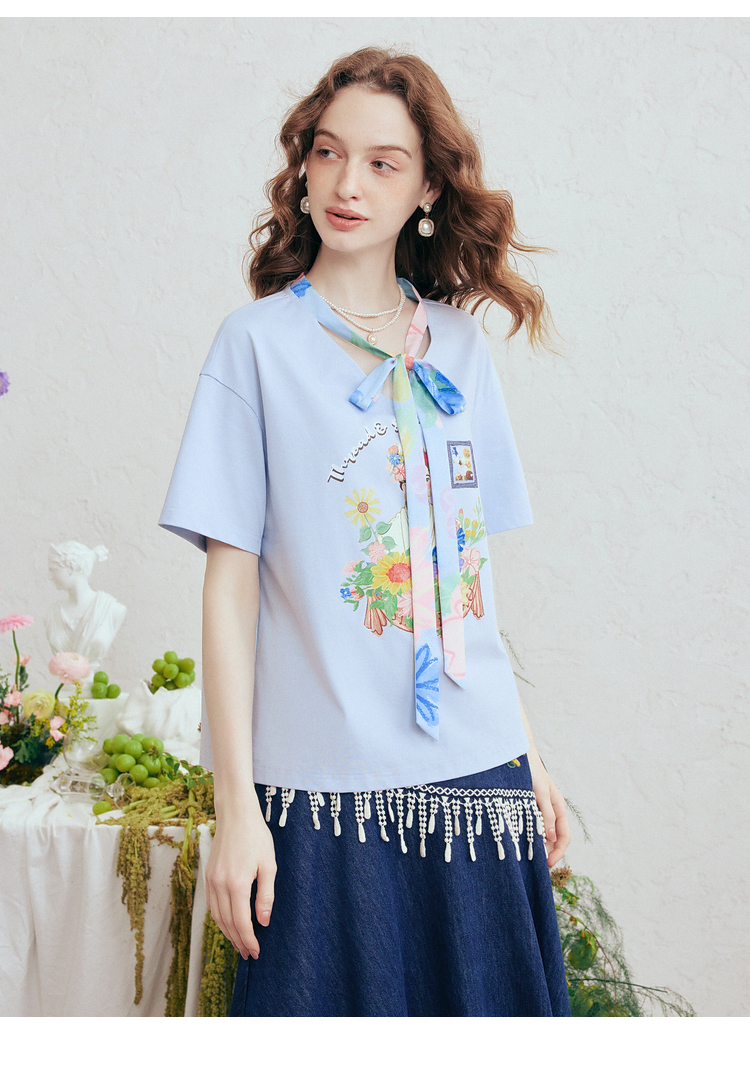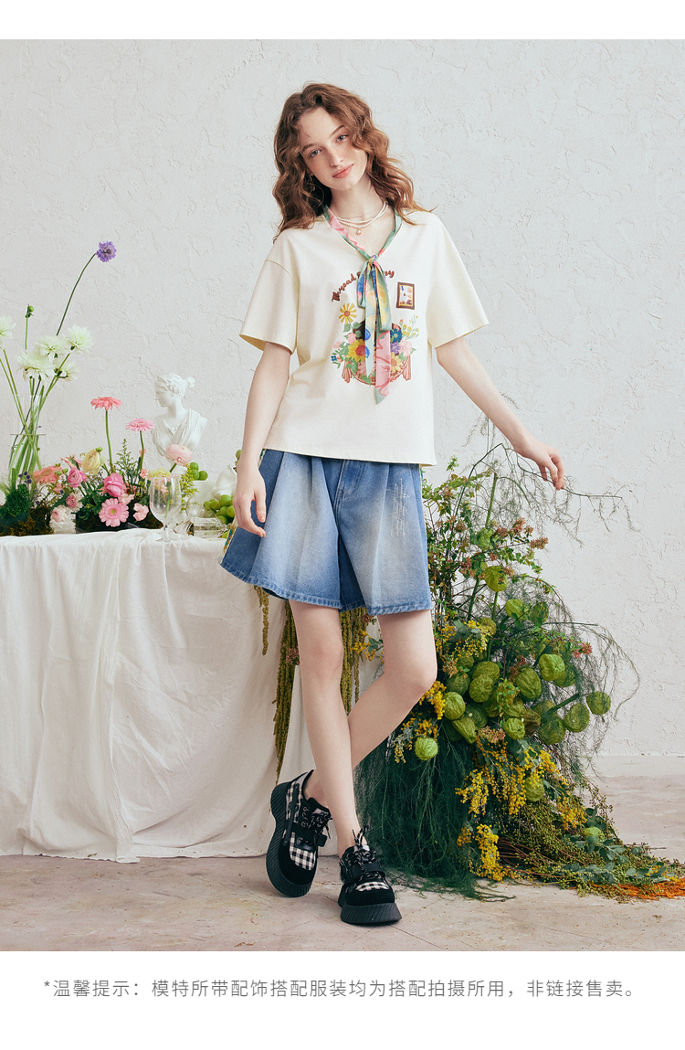 两三事 海盐天空 2026春季新款小清新绑带v领印花短袖T恤女