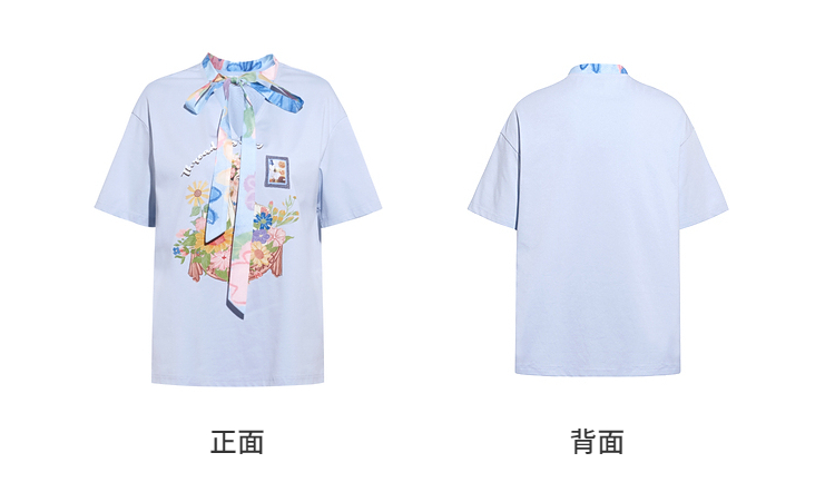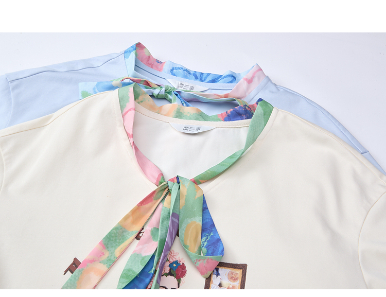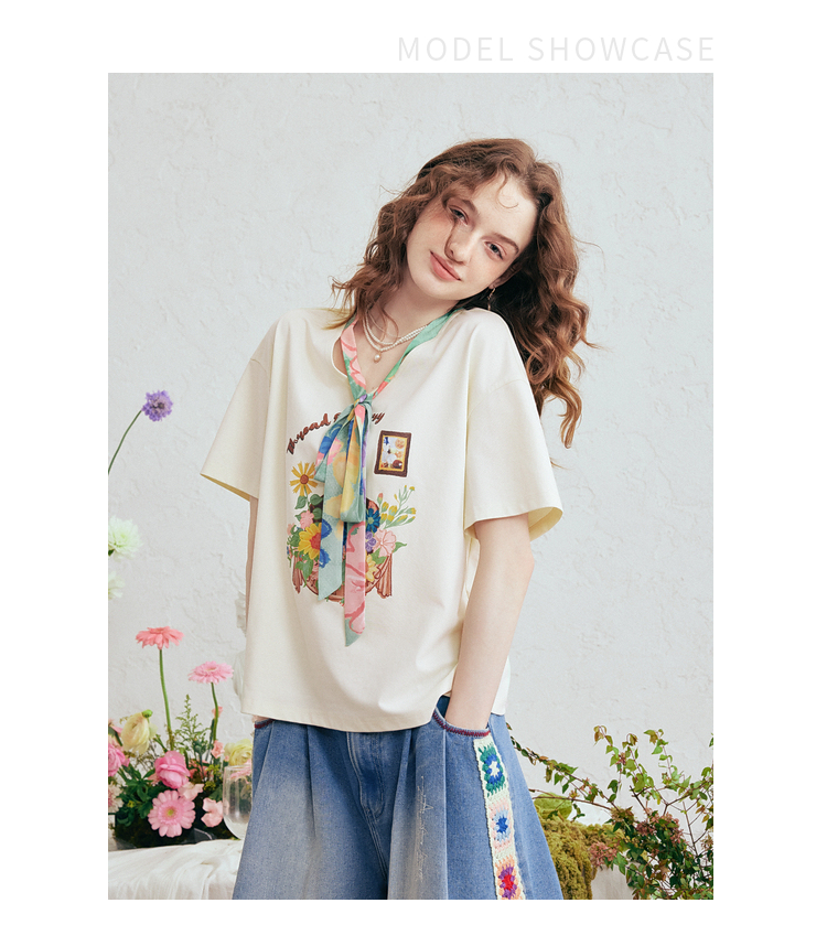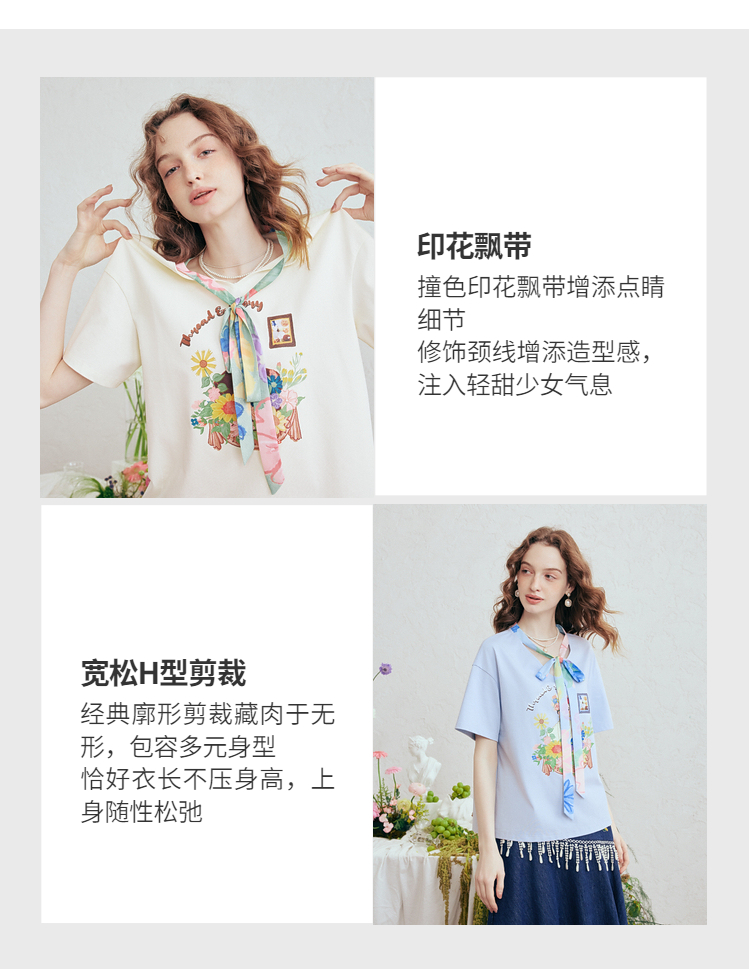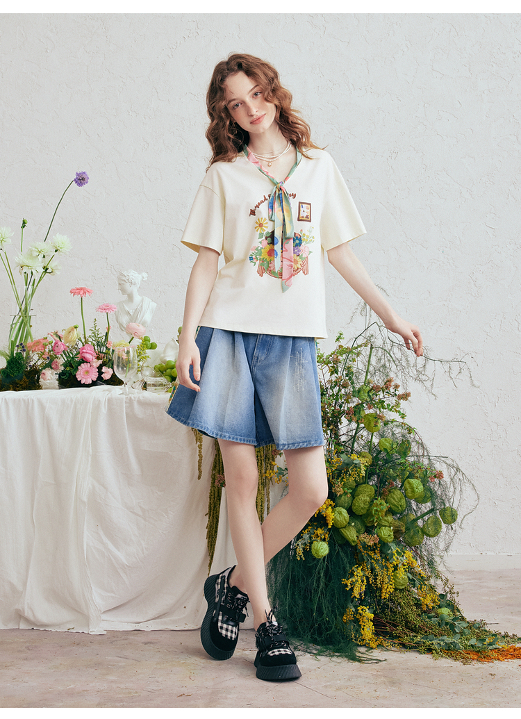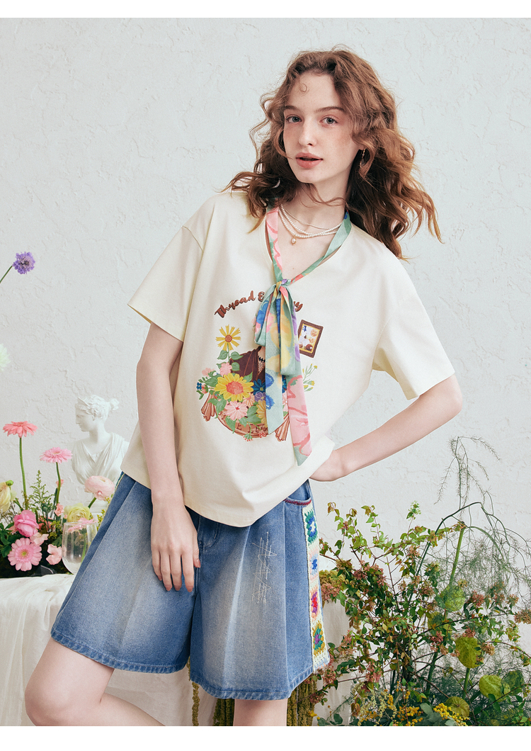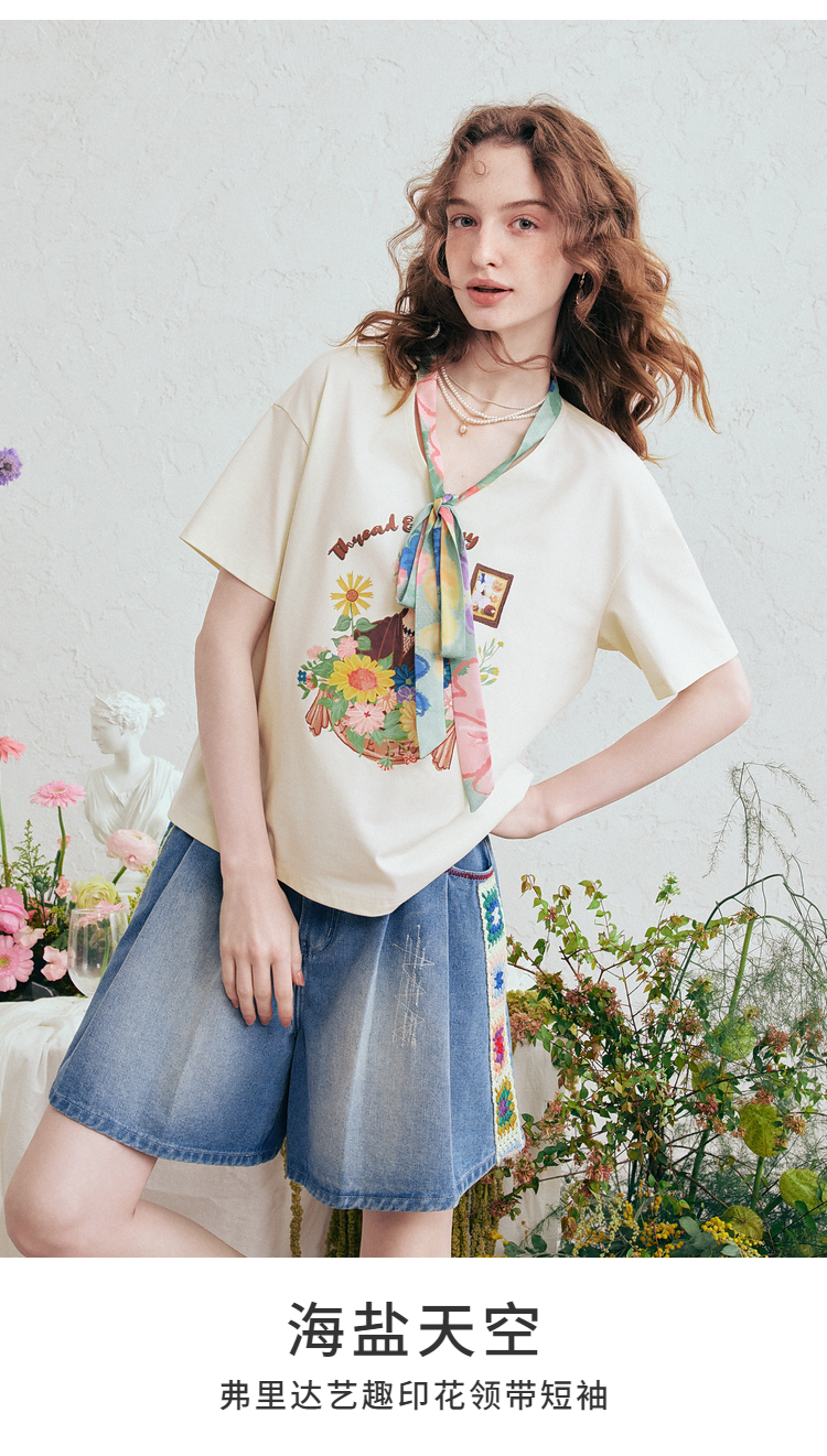 两三事 海盐天空 2026春季新款小清新绑带v领印花短袖T恤女