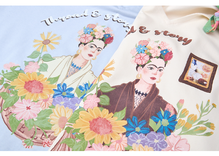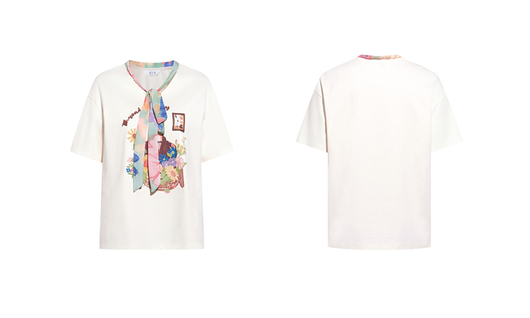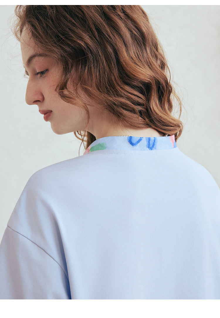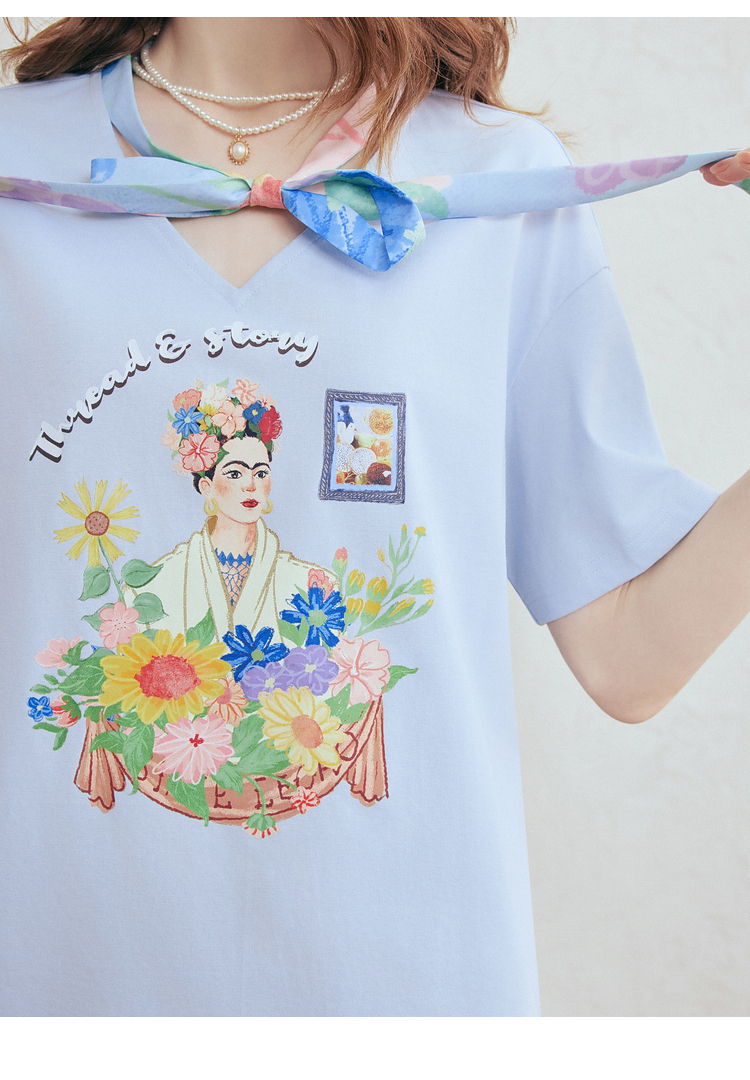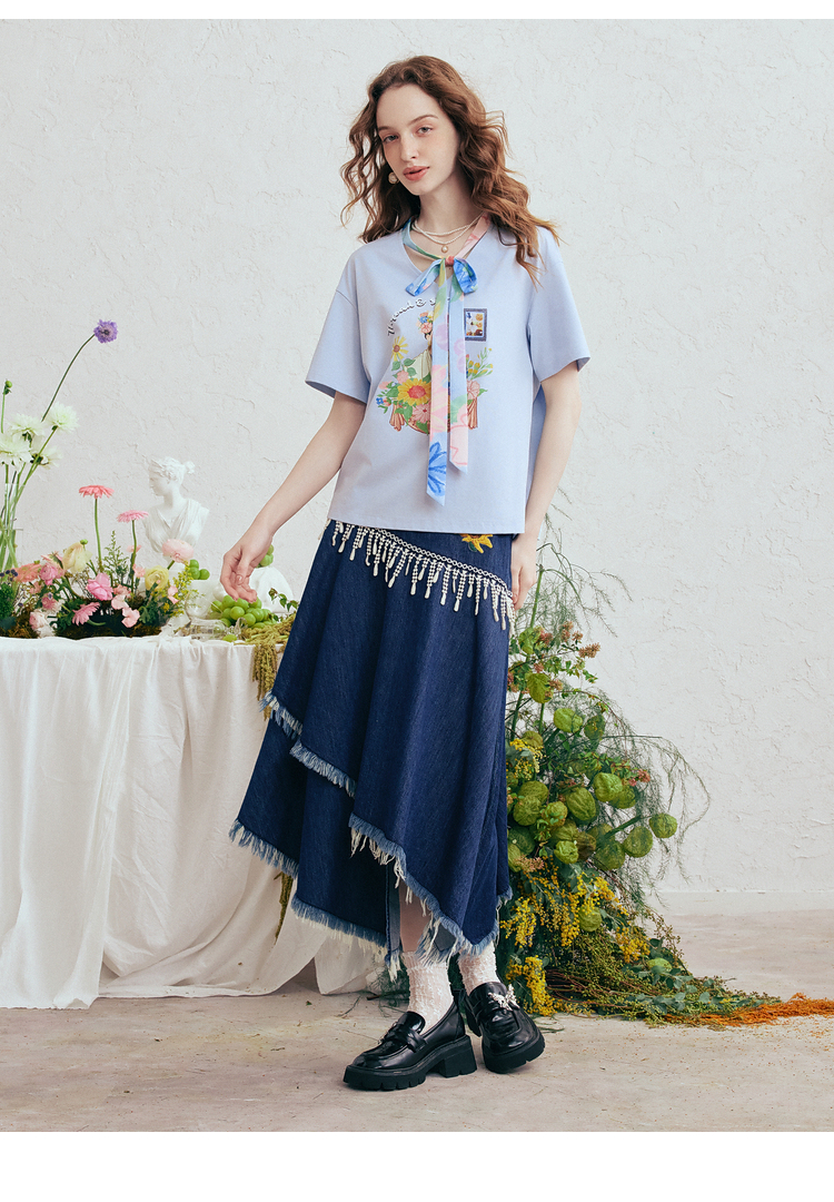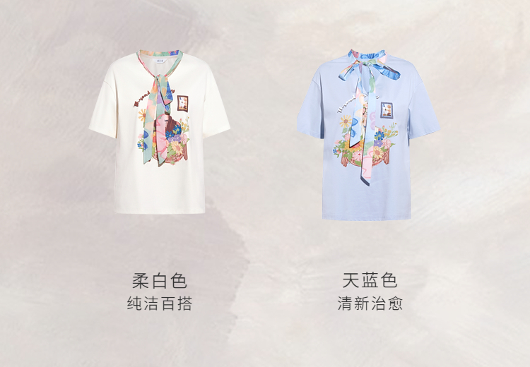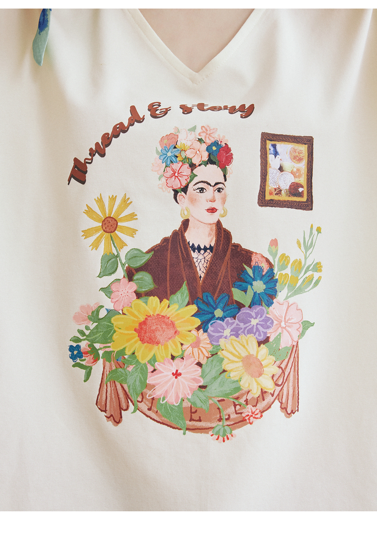 两三事 海盐天空 2026春季新款小清新绑带v领印花短袖T恤女