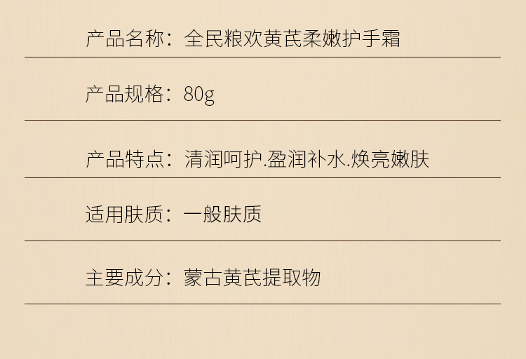【自营】全民粮欢 黄芪柔嫩护手霜 80g/支