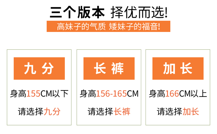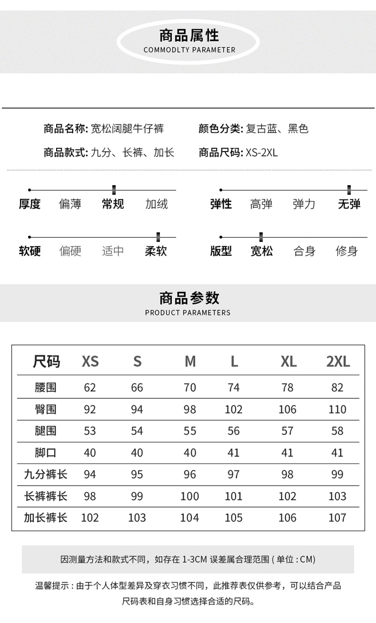 颜色:蓝色九分、蓝色长裤、蓝色加长、黑色九分、黑色长裤、黑色加长