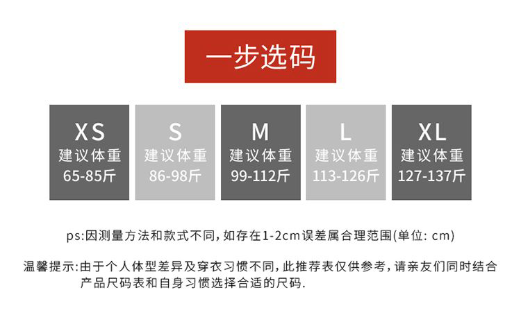 尺码:XS(建议65-85斤)/S(建议86-98斤)/M(建议99-112斤)/L(建议113-126斤)/XL(建议127-137斤)