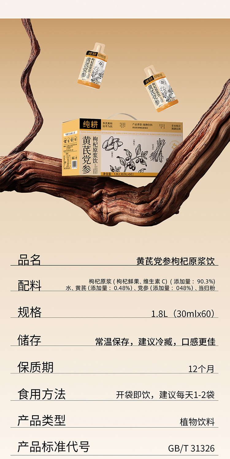纯耕1.8L(60袋)量贩装黄芪党参枸杞原浆饮;岷县与黄芪、党参与当归,宁夏枸杞;困了累了压力大了喝