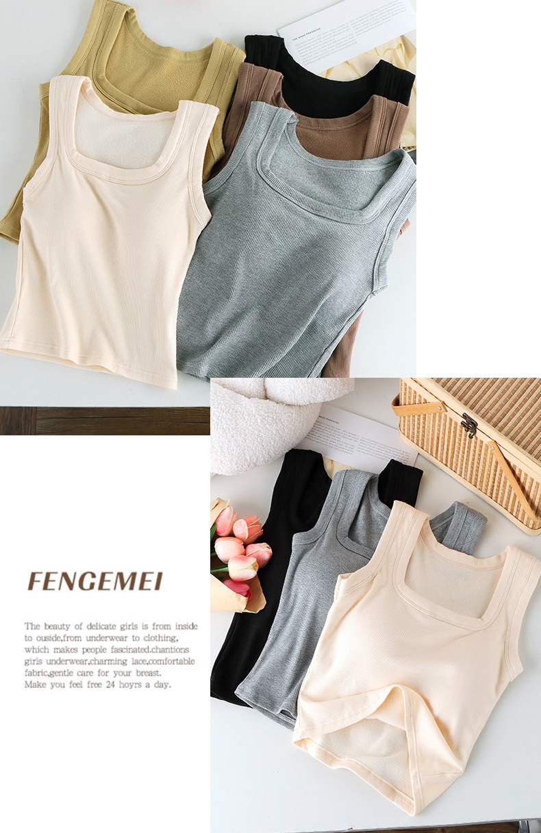 秋冬磨毛方领背心女 宽肩内搭 外穿带胸垫 免穿文胸保暖内衣打底上衣