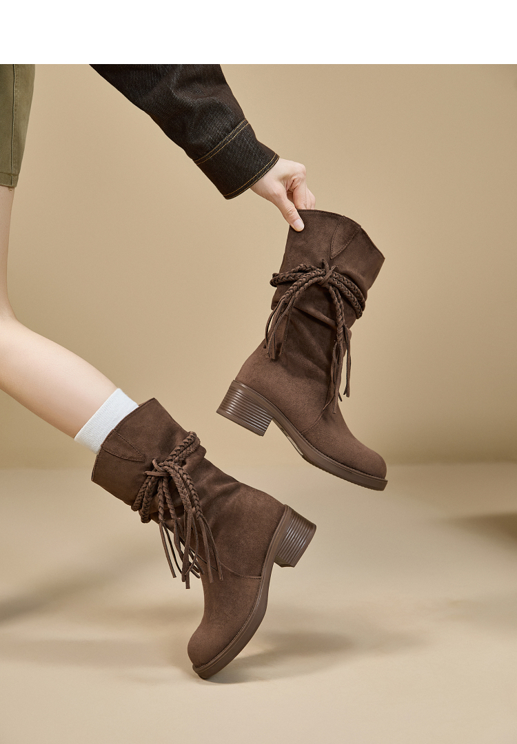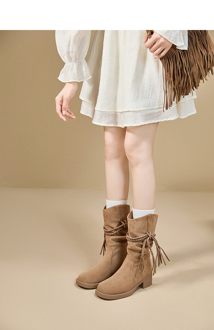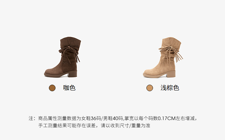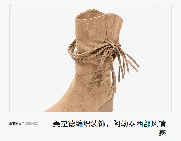 西遇西部牛仔靴女新款秋冬废土风流苏复古堆堆靴中筒粗跟短靴V2257259